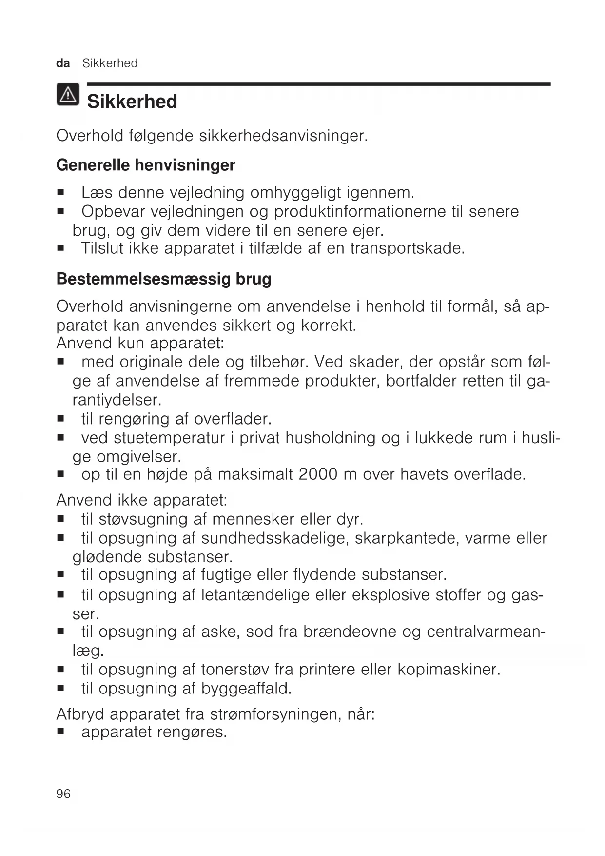 Sikkerhed Overhold følgende sikkerhedsanvisninger. Generelle henvisninger ¡ Læs denne vejledning omhyggeligt igennem. ¡ Opbevar vejledningen og produktinformationerne til senere brug, og giv dem videre til en senere ejer. ¡ Tilslut ikke apparatet i tilfælde af en transportskade. Bestemmelsesmæssig brug Overhold anvisningerne om anvendelse i henhold til formål, så ap- paratet kan anvendes sikkert og korrekt. Anvend kun apparatet: ¡ med originale dele og tilbehør. Ved skader, der opstår som føl- ge af anvendelse af fremmede produkter, bortfalder retten til ga- rantiydelser. ¡ til rengøring af overflader. ¡ ved stuetemperatur i privat husholdning og i lukkede rum i husli- ge omgivelser. ¡ op til en højde på maksimalt 2000m over havets overflade. Anvend ikke apparatet: ¡ til støvsugning af mennesker eller dyr. ¡ til opsugning af sundhedsskadelige, skarpkantede, varme eller glødende substanser. ¡ til opsugning af fugtige eller flydende substanser. ¡ til opsugning af letantændelige eller eksplosive stoffer og gas- ser. ¡ til opsugning af aske, sod fra brændeovne og centralvarmean- læg. ¡ til opsugning af tonerstøv fra printere eller kopimaskiner. ¡ til opsugning af byggeaffald. Afbryd apparatet fra strømforsyningen, når: ¡ apparatet rengøres.Sikkerhed da