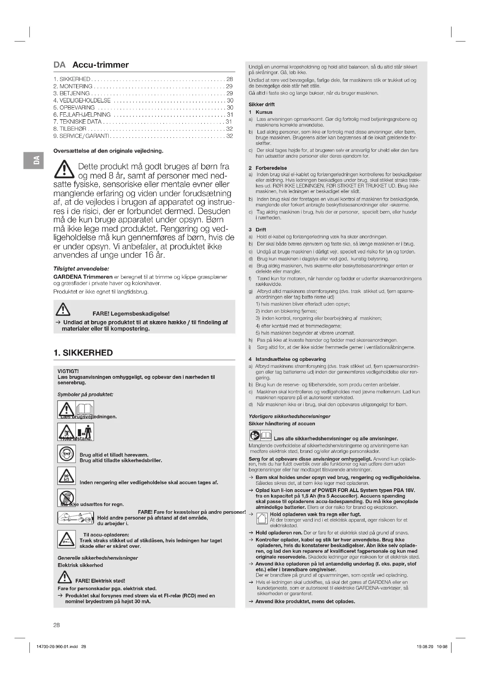 Oversættelse af den originale vejledning. Dette produkt må godt bruges af børn fra og med 8 år, samt af personer med ned- satte fysiske, sensoriske eller mentale evner eller manglende erfaring og viden under forudsætning af, at de vejledes i brugen af apparatet og instrue- res i de risici, der er forbundet dermed. Desuden må de kun bruge apparatet under opsyn. Børn må ikke lege med produktet. Rengøring og ved- ligeholdelse må kun gennemføres af børn, hvis de er under opsyn. Vi anbefaler, at produktet ikke anvendes af unge under 16 år. Tilsigtet anvendelse: GARDENA Trimmeren er beregnet til at trimme og klippe græsplæner og græsflader i private haver og kolonihaver. Produktet er ikke egnet til langtidsbrug. FARE! Legemsbeskadigelse! v Undlad at bruge produktet til at skære hække / til findeling af materialer eller til kompostering. Undgå en unormal kropsholdning og hold altid balancen, så du altid står sikkert på skråninger. Gå, løb ikke. Undlad at røre ved bevægelige, farlige dele, før maskinens stik er trukket ud og de bevægelige dele står helt stille. Gå altid i faste sko og lange bukser, når du bruger maskinen. Sikker drift 1 Kursus a) Læs anvisningen opmærksomt. Gør dig fortrolig med betjeningsgrebene og maskinens korrekte anvendelse. b) Lad aldrig personer, som ikke er fortrolig med disse anvisninger, eller børn, bruge maskinen. Brugerens alder kan begrænses af de lokalt gældende for- skrifter. c) Der skal tages højde for, at brugeren selv er ansvarlig for uheld eller den fare han udsætter andre personer eller deres ejendom for. 2 Forberedelse a) Inden brug skal el-kablet og forlængerledningen kontrolleres for beskadigelser eller ældning. Hvis ledningen beskadiges under brug, skal stikket straks træk- kes ud. RØR IKKE LEDNINGEN, FØR STIKKET ER TRUKKET UD. Brug ikke maskinen, hvis ledningen er beskadiget eller slidt. b) Inden brug skal der foretages en visuel kontrol af maskinen for beskadigede, manglende eller forkert anbragte beskyttelsesanordninger eller -skærme. c) Tag aldrig maskinen i brug, hvis der er personer, specielt børn, eller husdyr inærheden. 3 Drift a) Hold el-kabel og forlængerledning væk fra skær anordningen. b) Der skal både bæres øjenværn og faste sko, så længe maskinen er i brug. c) Undgå at bruge maskinen i dårligt vejr, specielt ved risiko for lyn og torden. d) Brug kun maskinen i dagslys eller ved god, kunstig belysning. e) Brug aldrig maskinen, hvis skærme eller beskyttelsesanordninger enten er defekte eller mangler. f) Tænd kun for motoren, når hænder og fødder er udenfor skæreanordningens rækkevidde. g) Afbryd altid maskinens strømforsyning (dvs. træk stikket ud, fjern spærre- anordningen eller tag batte rierne ud)