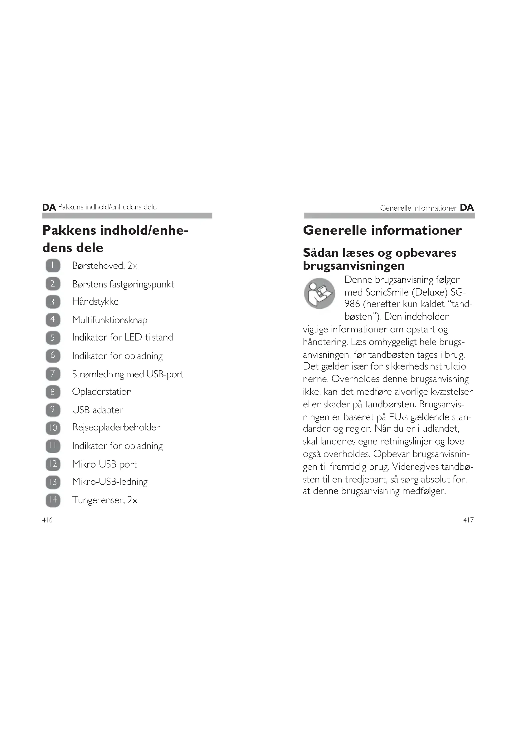Tungerenser, 2x Generelle informationer Sådan læses og opbevares brugsanvisningen Denne brugsanvisning følger med SonicSmile (Deluxe) SG- 986 (herefter kun kaldet “tand- bøsten”). Den indeholder vigtige informationer om opstart og håndtering. Læs omhyggeligt hele brugs- anvisningen, før tandbøsten tages i brug. Det gælder især for sikkerhedsinstruktio- nerne. Overholdes denne brugsanvisning ikke, kan det medføre alvorlige kvæstelser eller skader på tandbørsten. Brugsanvis- ningen er baseret på EU‹s gældende stan- darder og regler. Når du er i udlandet, skal landenes egne retningslinjer og love også overholdes. Opbevar brugsanvisnin- gen til fremtidig brug. Videregives tandbø- sten til en tredjepart, så sørg absolut for, at denne brugsanvisning medfølger.Generelle informationer
