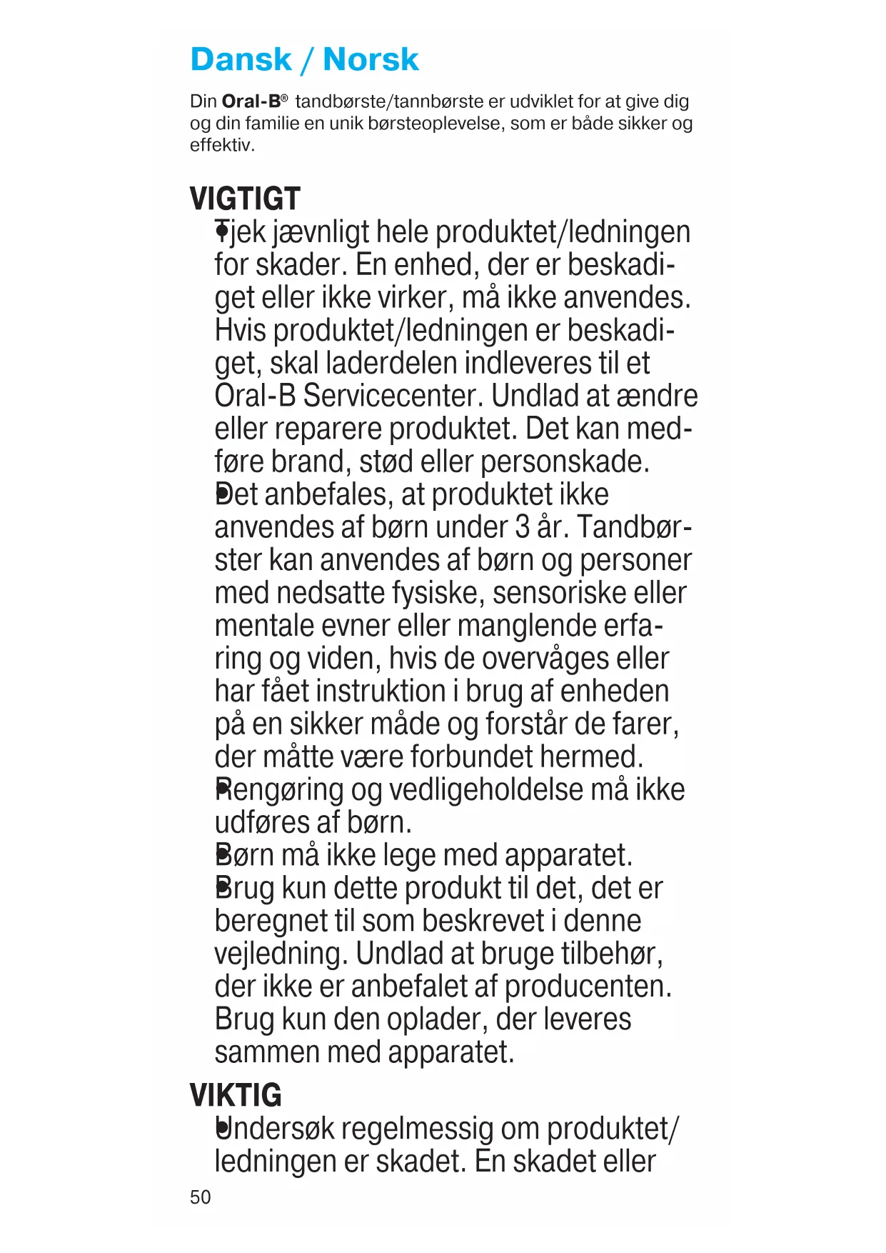 Tjek jævnligt hele produktet/ledningen for skader. En enhed, der er beskadi- get eller ikke virker, må ikke anvendes. Hvis produktet/ledningen er beskadi- get, skal laderdelen indleveres til et Oral-B Servicecenter. Undlad at ændre eller reparere produktet. Det kan med- føre brand, stød eller personskade.