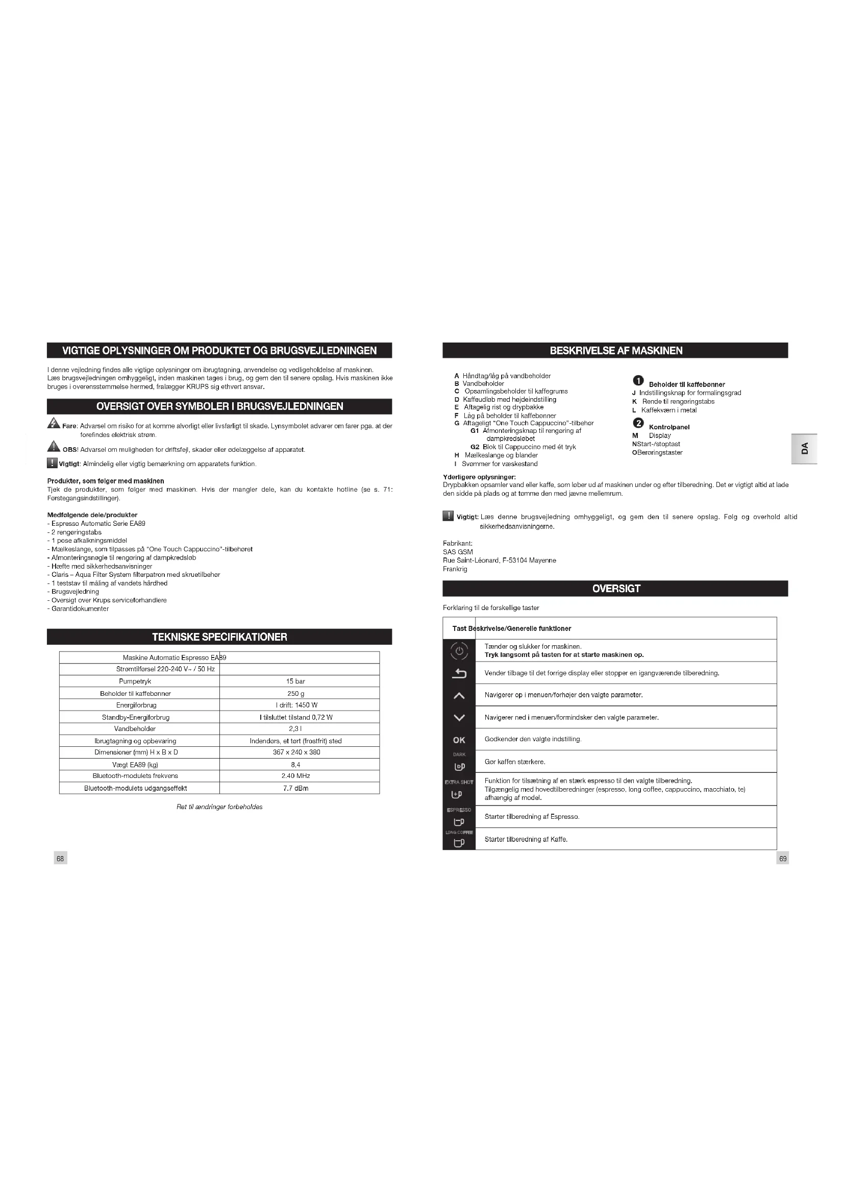 Vigtigt: Almindelig eller vigtig bemærkning om apparatets funktion. Produkter, som følger med maskinen Tjek de produkter, som følger med maskinen. Hvis der mangler dele, kan du kontakte hotline (se s. 71: Førstegangsindstillinger). Medfølgende dele/produkter- Espresso Automatic Serie EA89 - 2 rengøringstabs - 1 pose afkalkningsmiddel - Mælkeslange, som tilpasses på “One Touch Cappuccino”-tilbehøret - Afmonteringsnøgle til rengøring af dampkredsløb - Hæfte med sikkerhedsanvisninger - Claris – Aqua Filter System lterpatron med skruetilbehør - 1 teststav til måling af vandets hårdhed - Brugsvejledning - Oversigt over Krups serviceforhandlere - Garantidokumenter TEKNISKE SPECIFIKATIONER Maskine Automatic Espresso EA89Strømtilførsel 220-240 V~ / 50 HzPumpetryk 15 barBeholder til kaffebønner 250 gEnergiforbrug I drift: 1450 WStandby-Energiforbrug I tilsluttet tilstand 0,72 W Vandbeholder 2,3 lIbrugtagning og opbevaring Indendørs, et tørt (frostfrit) stedDimensioner (mm) H x B x D 367 x 240 x 380Vægt EA89 (kg) 8,4Bluetooth-modulets frekvens 2.40 MHzBluetooth-modulets udgangseffekt 7.7 dBm Ret til ændringer forbeholdes70 71
