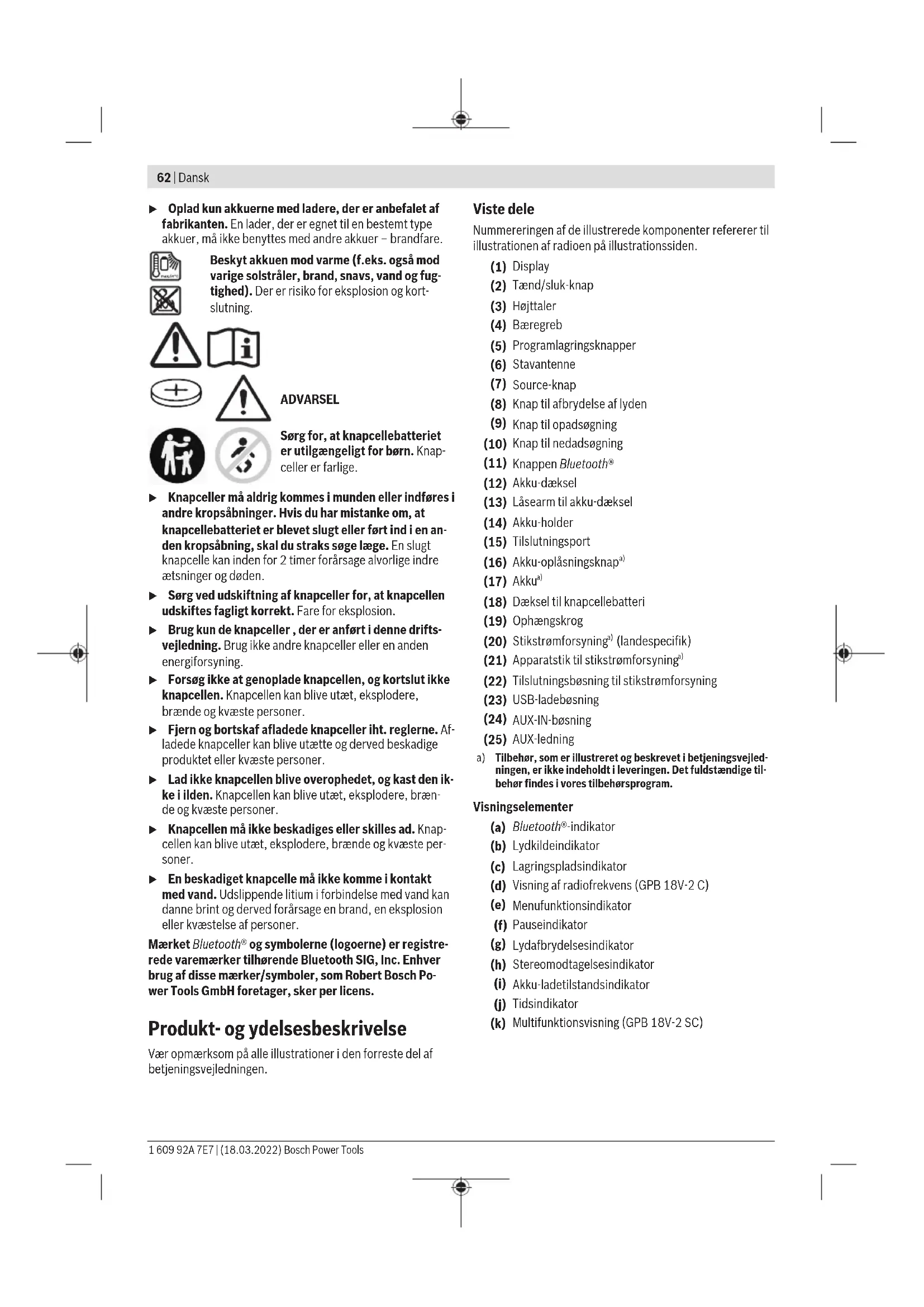 Tilbehør, som er illustreret og beskrevet i betjeningsvejled- ningen, er ikke indeholdt i leveringen. Det fuldstændige til- behør findes i vores tilbehørsprogram. Visningselementer (a) Bluetooth®-indikator (b) Lydkildeindikator (c) Lagringspladsindikator (d) Visning af radiofrekvens (GPB18V‑2C) (e) Menufunktionsindikator (f) Pauseindikator (g) Lydafbrydelsesindikator (h) Stereomodtagelsesindikator (i) Akku-ladetilstandsindikator (j) Tidsindikator (k) Multifunktionsvisning (GPB18V‑2SC) 1 609 92A 7E7 | (18.03.2022) Bosch Power ToolsDansk | 63 Tekniske data Byggepladsradio GPB 18V-2 C GPB 18V-2 SC Varenummer 3601DA30.. 3601DA31.. Modtagelse af DAB+ - ● Driftsspænding – Ved brug af stikstrømforsyning V 18 18 – Ved brug af akku V 18 18 Nominel effekt, forstærker W 2×7,5 2×7,5 Modtageområde, FM MHz 87,5−108 87,5−108 Modtageområde, DAB+ MHz − 174,928−239,200 Kompatibilitet Bluetooth® Bluetooth® Spec.5 Bluetooth® Spec.5 Driftsfrekvensområde Bluetooth® MHz 2402−2480 2402−2480 Sendeeffekt Bluetooth® maks. mW 10 10 Knapcellebatteri (reservebatteri) CR2032 Lithium-batteri 3V CR2032 Lithium-batteri 3V Vægt iht. EPTA-Procedure01:2014 kg 2,8−3,9