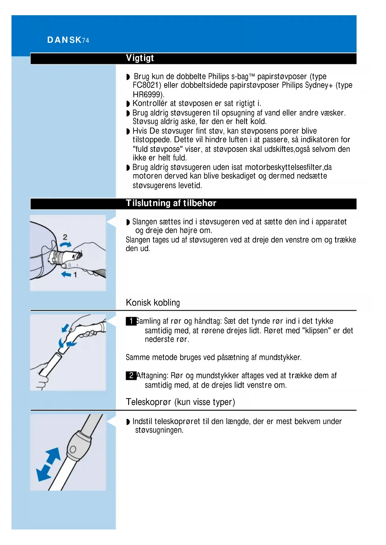 5 Tarkista onko suutin, putki tai letku tukkeutunut. 6 Tukkeuma voidaan poistaa irrottamalla tukkeutunut osa ja liittämällä se toisinpäin imuriin (niin hyvin kuin mahdollista) . Käynnistä pölynimuri,niin että ilma kulkee tukkeutuneen osan läpi päinvastaiseen suuntaan. SUOMI 73Vigtigt ◗ Brug kun de dobbelte Philips s-bag` papirstøvposer (type FC8021) eller dobbeltsidede papirstøvposer Philips Sydney+ (type HR6999). ◗ Kontrollér at støvposen er sat rigtigt i. ◗ Brug aldrig støvsugeren til opsugning af vand eller andre væsker. Støvsug aldrig aske, før den er helt kold. ◗ Hvis De støvsuger fint støv, kan støvposens porer blive tilstoppede. Dette vil hindre luften i at passere, så indikatoren for "fuld støvpose" viser, at støvposen skal udskiftes,også selvom den ikke er helt fuld. ◗ Brug aldrig støvsugeren uden isat motorbeskyttelsesfilter,da motoren derved kan blive beskadiget og dermed nedsætte støvsugerens levetid. Tilslutning af tilbehør