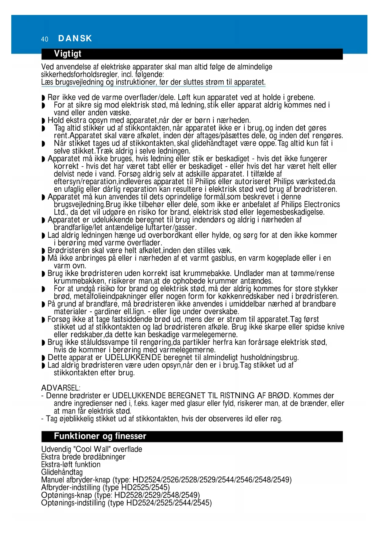 (kuva 1). Takuu ja huolto Jos haluat lisätietoja tai laitteessa ilmenee ongelmia, katso Philipsin Web-sivuja osoitteesta www.philips.com tai ota yhteys Philipsin asiakaspalveluun (puhelinnumero löytyy takuulehtisestä).Voit myös kääntyä lähimmän Philips-kauppiaan puoleen tai ottaa suoraan yhteyden Hollantiin Philips Domestic Appliances and Personal Care BV:n Service-osastoon. SUOMIVigtigt Ved anvendelse af elektriske apparater skal man altid følge de almindelige sikkerhedsforholdsregler, incl. følgende: Læs brugsvejledning og instruktioner, før der sluttes strøm til apparatet. ◗ Rør ikke ved de varme overflader/dele. Løft kun apparatet ved at holde i grebene. ◗ For at sikre sig mod elektrisk stød, må ledning,stik eller apparat aldrig kommes ned i vand eller anden væske. ◗ Hold ekstra opsyn med apparatet,når der er børn i nærheden. ◗ Tag altid stikker ud af stikkontakten, når apparatet ikke er i brug,og inden det gøres rent.Apparatet skal være afkølet, inden der aftages/påsættes dele, og inden det rengøres. ◗ Når stikket tages ud af stikkontakten, skal glidehåndtaget være oppe.Tag altid kun fat i selve stikket.Træk aldrig i selve ledningen. ◗ Apparatet må ikke bruges, hvis ledning eller stik er beskadiget - hvis det ikke fungerer korrekt - hvis det har været tabt eller er beskadiget - eller hvis det har været helt eller delvist nede i vand. Forsøg aldrig selv at adskille apparatet. I tilfælde af eftersyn/reparation,indleveres apparatet til Philips eller autoriseret Philips værksted,da en ufaglig eller dårlig reparation kan resultere i elektrisk stød ved brug af brødristeren. ◗ Apparatet må kun anvendes til dets oprindelige formål,som beskrevet i denne brugsvejledning.Brug ikke tilbehør eller dele, som ikke er anbefalet af Philips Electronics Ltd., da det vil udgøre en risiko for brand, elektrisk stød eller legemesbeskadigelse. ◗ Apparatet er udelukkende beregnet til brug indendørs og aldrig i nærheden af brandfarlige/let antændelige luftarter/gasser. ◗ Lad aldrig ledningen hænge ud overbordkant eller hylde, og sørg for at den ikke kommer i berøring med varme overflader. ◗ Brødristeren skal være helt afkølet,inden den stilles væk. ◗ Må ikke anbringes på eller i nærheden af et varmt gasblus, en varm kogeplade eller i en varm ovn. ◗ Brug ikke brødristeren uden korrekt isat krummebakke. Undlader man at tømme/rense krummebakken, risikerer man,at de ophobede krummer antændes. ◗ For at undgå risiko for brand og elektrisk stød, må der aldrig kommes for store stykker brød, metalfolieindpakninger eller nogen form for køkkenredskaber ned i brødristeren. ◗ På grund af brandfare, må brødristeren ikke anvendes i umiddelbar nærhed af brandbare materialer - gardiner ell.lign. - eller lige under overskabe. ◗ Forsøg ikke at tage fastsiddende brød ud, mens der er strøm til apparatet.Tag først stikket ud af stikkontakten og lad brødristeren afkøle. Brug ikke skarpe eller spidse knive eller redskaber,da dette kan beskadige varmelegemerne. ◗ Brug ikke ståluldssvampe til rengøring,da partikler herfra kan forårsage elektrisk stød, hvis de kommer i berøring med varmelegemerne. ◗ Dette apparat er UDELUKKENDE beregnet til almindeligt husholdningsbrug. ◗ Lad aldrig brødristeren være uden opsyn,når den er i brug.Tag stikket ud af stikkontakten efter brug. ADVARSEL: - Denne brødrister er UDELUKKENDE BEREGNET TIL RISTNING AF BRØD. Kommes der andre ingredienser ned i, f.eks. kager med glasur eller fyld, risikerer man, at de brænder, eller at man får elektrisk stød. - Tag øjeblikkelig stikket ud af stikkontakten, hvis der observeres ild eller røg. Funktioner og finesser Udvendig "Cool Wall" overflade Ekstra brede brødåbninger Ekstra-løft funktion Glidehåndtag Manuel afbryder-knap (type: HD2524/2526/2528/2529/2544/2546/2548/2549) Afbryder-indstilling (type HD2525/2545) Optønings-knap (type: HD2528/2529/2548/2549) Optønings-indstilling (type HD2524/2525/2544/2545) DANSK 40Bagel-knap (type: HD2525/2528/2529/2545/2548/2549) Genopvarmnings-indstilling Ristnings-kontrol Aftagelig krummebakke Bollerist (HD2526/2529/2546/2549) Ledningsopbevaring Auto-sluk Brødristning
