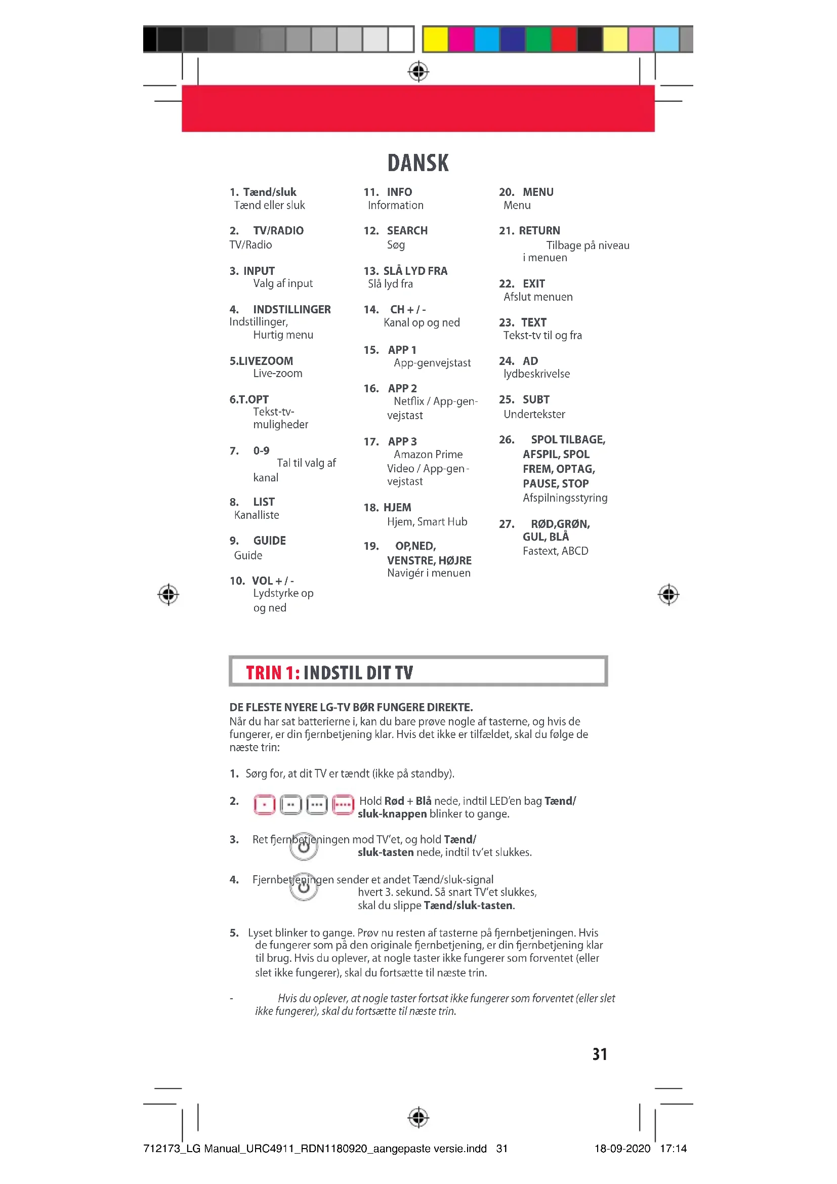 NEDERLANDS 712173_LG Manual_URC4911_RDN1180920_aangepaste versie.indd 30712173_LG Manual_URC4911_RDN1180920_aangepaste versie.indd 30 18-09-2020 17:1418-09-2020 17:1431 DANSK DE FLESTE NYERE LG-TV BØR FUNGERE DIREKTE. Når du har sat batterierne i, kan du bare prøve nogle af tasterne, og hvis de fungerer, er din ernbetjening klar. Hvis det ikke er tilfældet, skal du følge de næste trin: