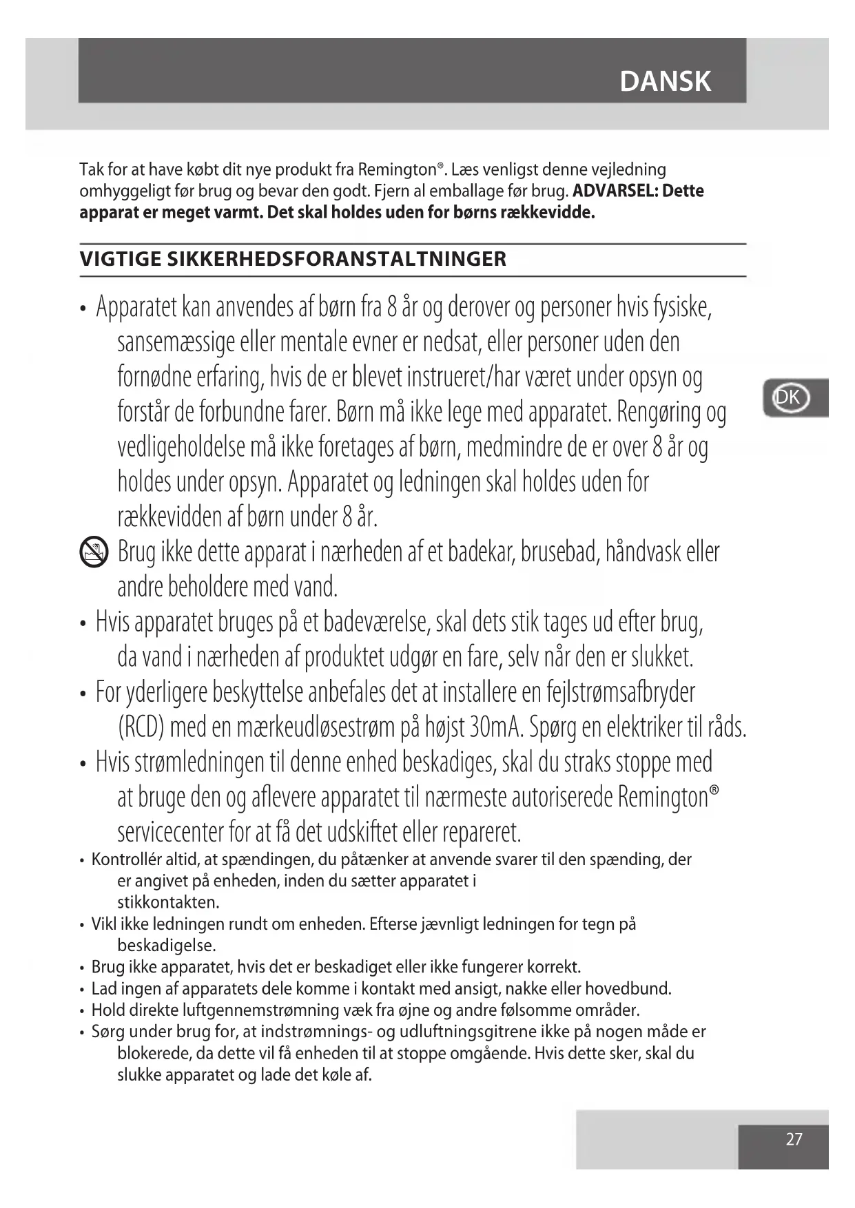 - Hvis strømledningen til denne enhed beskadiges, skal du straks stoppe med at bruge den og aflevere apparatet til nærmeste autoriserede Remington® servicecenter for at få det udskiftet eller repareret.