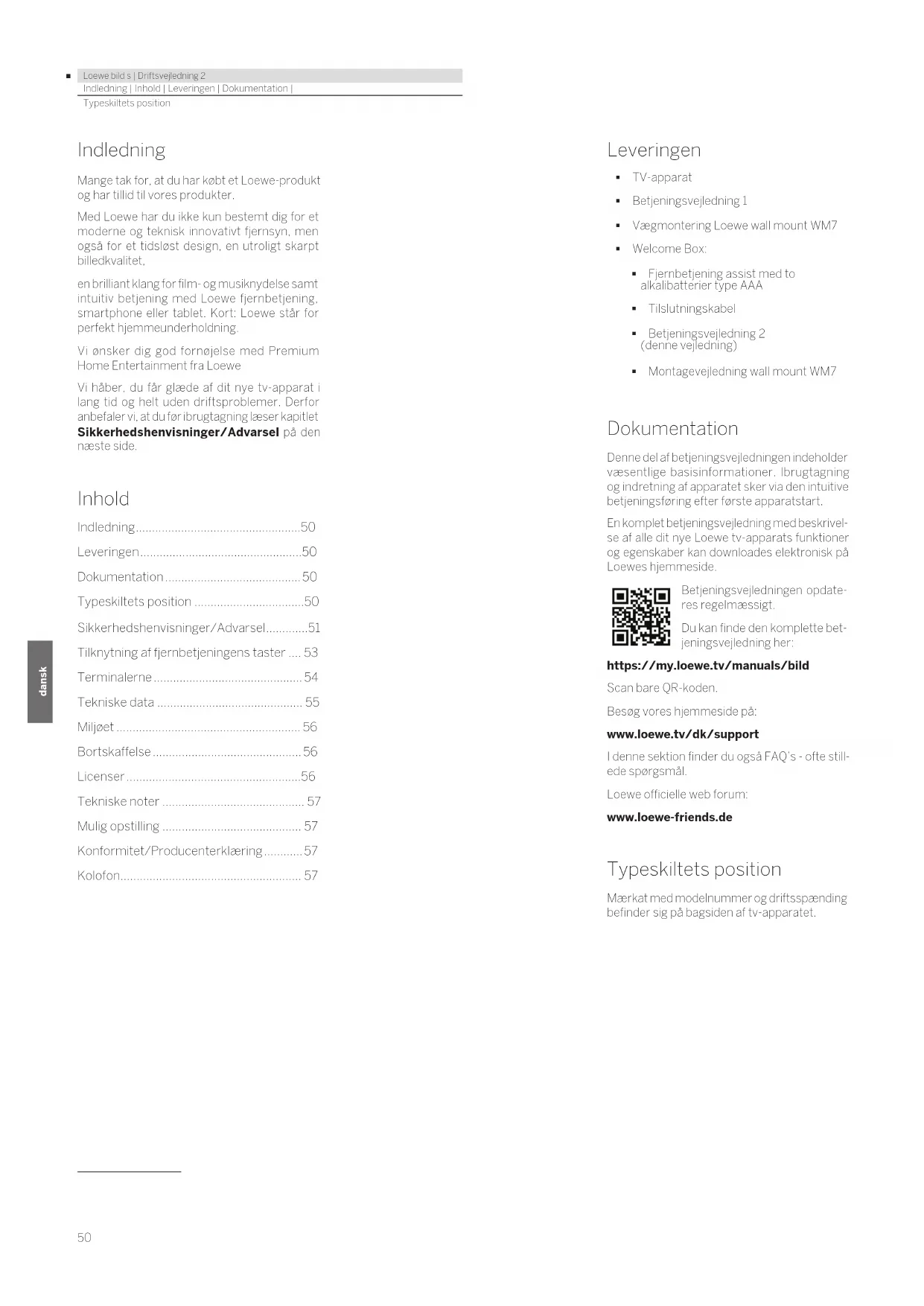 - Kolofon Leveringen TV-apparat Betjeningsvejledning 1 Vægmontering Loewe wall mount WM7 Welcome Box: Fjernbetjening assist med to alkalibatterier type AAA Tilslutningskabel Betjeningsvejledning 2 (denne vejledning) Montagevejledning wall mount WM7 Dokumentation Denne del af betjeningsvejledningen indeholder væsentlige basisinformationer. Ibrugtagning og indretning af apparatet sker via den intuitive betjeningsføring efter første apparatstart. En komplet betjeningsvejledning med beskrivel- se af alle dit nye Loewe tv-apparats funktioner og egenskaber kan downloades elektronisk på Loewes hjemmeside. Betjeningsvejledningen opdate- res regelmæssigt. Du kan finde den komplette bet- jeningsvejledning her: https://my.loewe.tv/manuals/bild Scan bare QR-koden. Besøg vores hjemmeside på: www.loewe.tv/dk/support I denne sektion finder du også FAQ’s - ofte still- ede spørgsmål. Loewe officielle web forum: www.loewe-friends.de Typeskiltets position Mærkat med modelnummer og driftsspænding befinder sig på bagsiden af tv-apparatet.51 deutsch dansk p. 57