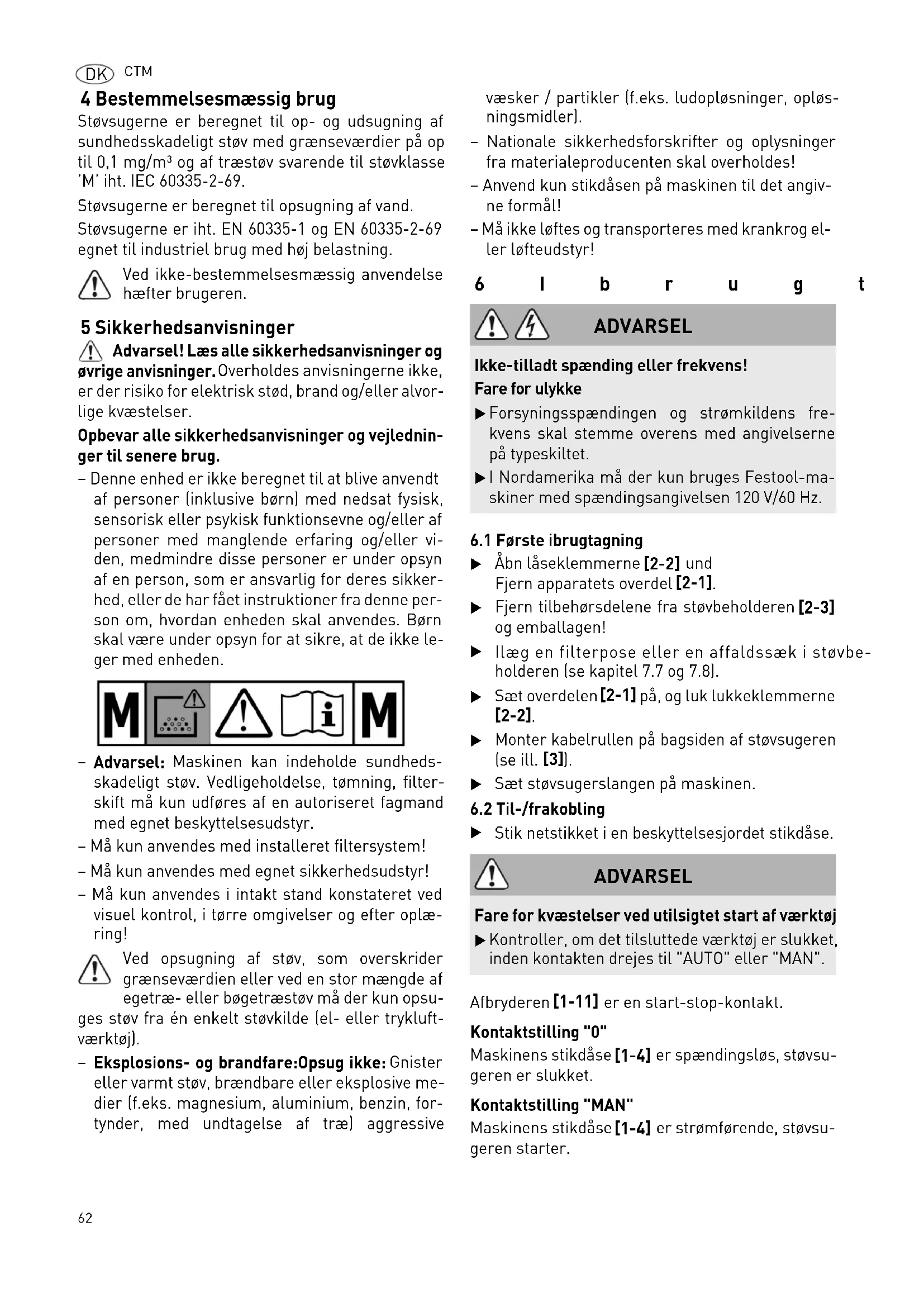 Advarsel: Maskinen kan indeholde sundheds- skadeligt støv. Vedligeholdelse, tømning, filter- skift må kun udføres af en autoriseret fagmand med egnet beskyttelsesudstyr. – Må kun anvendes med installeret filtersystem! – Må kun anvendes med egnet sikkerhedsudstyr! – Må kun anvendes i intakt stand konstateret ved visuel kontrol, i tørre omgivelser og efter oplæ- ring! Ved opsugning af støv, som overskrider grænseværdien eller ved en stor mængde af egetræ- eller bøgetræstøv må der kun opsu- ges støv fra én enkelt støvkilde (el- eller trykluft- værktøj).