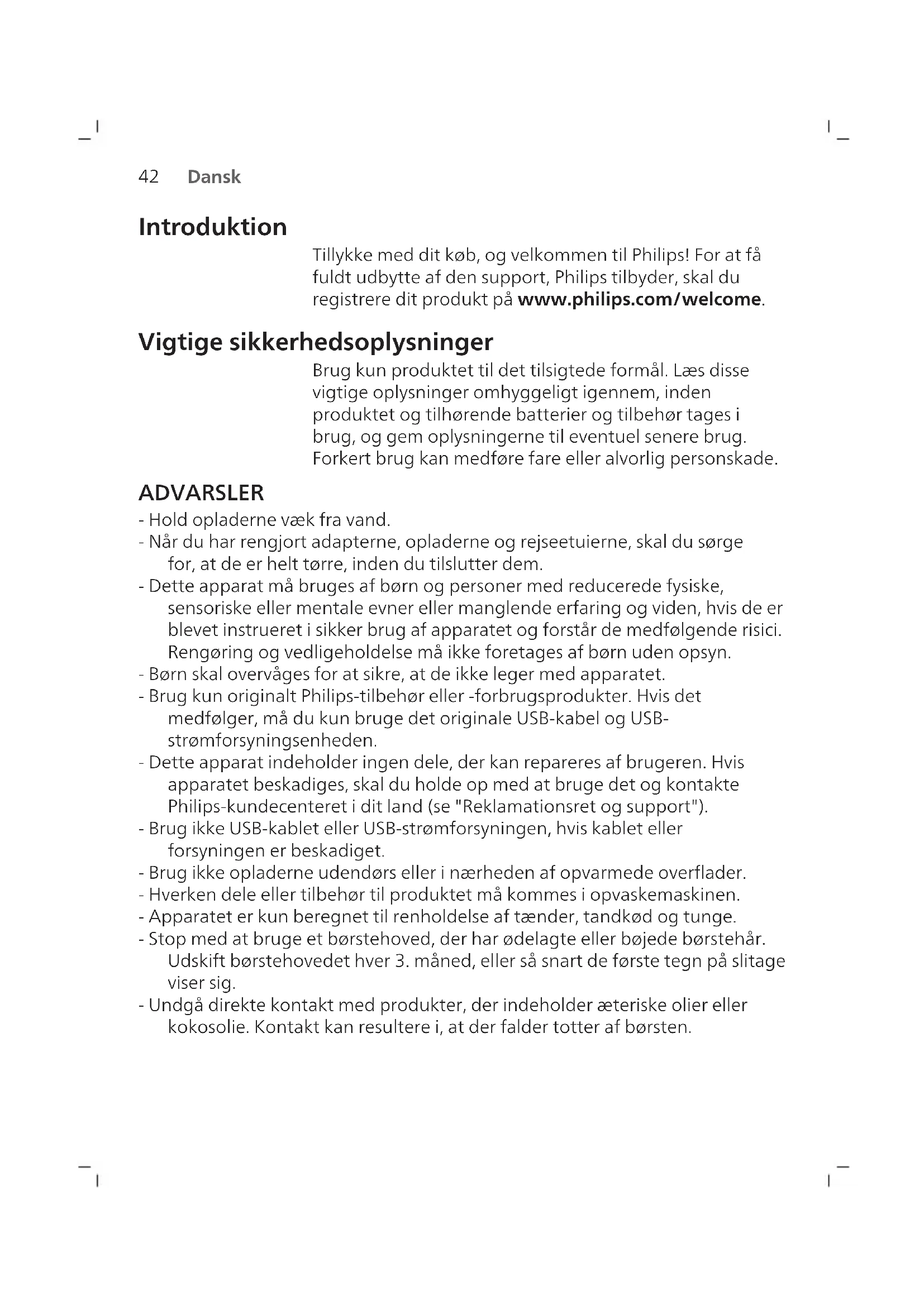 Dansk Introduktion Tillykke med dit køb, og velkommen til Philips! For at få fuldt udbytte af den support, Philips tilbyder, skal du registrere dit produkt på www.philips.com/welcome. Vigtige sikkerhedsoplysninger Brug kun produktet til det tilsigtede formål. Læs disse vigtige oplysninger omhyggeligt igennem, inden produktet og tilhørende batterier og tilbehør tages i brug, og gem oplysningerne til eventuel senere brug. Forkert brug kan medføre fare eller alvorlig personskade. ADVARSLER - Hold opladerne væk fra vand. - Når du har rengjort adapterne, opladerne og rejseetuierne, skal du sørge for, at de er helt tørre, inden du tilslutter dem. - Dette apparat må bruges af børn og personer med reducerede fysiske, sensoriske eller mentale evner eller manglende erfaring og viden, hvis de er blevet instrueret i sikker brug af apparatet og forstår de medfølgende risici. Rengøring og vedligeholdelse må ikke foretages af børn uden opsyn. - Børn skal overvåges for at sikre, at de ikke leger med apparatet. - Brug kun originalt Philips-tilbehør eller -forbrugsprodukter. Hvis det medfølger, må du kun bruge det originale USB-kabel og USB- strømforsyningsenheden. - Dette apparat indeholder ingen dele, der kan repareres af brugeren. Hvis apparatet beskadiges, skal du holde op med at bruge det og kontakte Philips-kundecenteret i dit land (se "Reklamationsret og support"). - Brug ikke USB-kablet eller USB-strømforsyningen, hvis kablet eller forsyningen er beskadiget. - Brug ikke opladerne udendørs eller i nærheden af opvarmede overflader. - Hverken dele eller tilbehør til produktet må kommes i opvaskemaskinen. - Apparatet er kun beregnet til renholdelse af tænder, tandkød og tunge. - Stop med at bruge et børstehoved, der har ødelagte eller bøjede børstehår. Udskift børstehovedet hver 3. måned, eller så snart de første tegn på slitage viser sig. - Undgå direkte kontakt med produkter, der indeholder æteriske olier eller kokosolie. Kontakt kan resultere i, at der falder totter af børsten.43 Dansk MEDICINSKE ADVARSLER - Stop med at bruge apparatet, og kontakt din tandlæge/læge, hvis der opstår kraftig blødning efter brug, hvis blødningen fortsætter efter 1 uges brug, eller hvis du oplever ubehag eller smerter. - Hvis du er blevet opereret i mund eller tandkød inden for de seneste 2 måneder, skal du spørge din tandlæge til råds, før du bruger apparatet. - Hvis du har en pacemaker eller andre implantater, skal du kontakte din læge eller producenten af implantatet inden brug. - Hvis du har helbredsproblemer, skal du spørge din læge til råds, før du begynder at bruge dette apparat. - Dette produkt er beregnet til personlig hjemmebrug og ikke til brug af et større antal patienter på tandlægeklinikker eller institutioner.