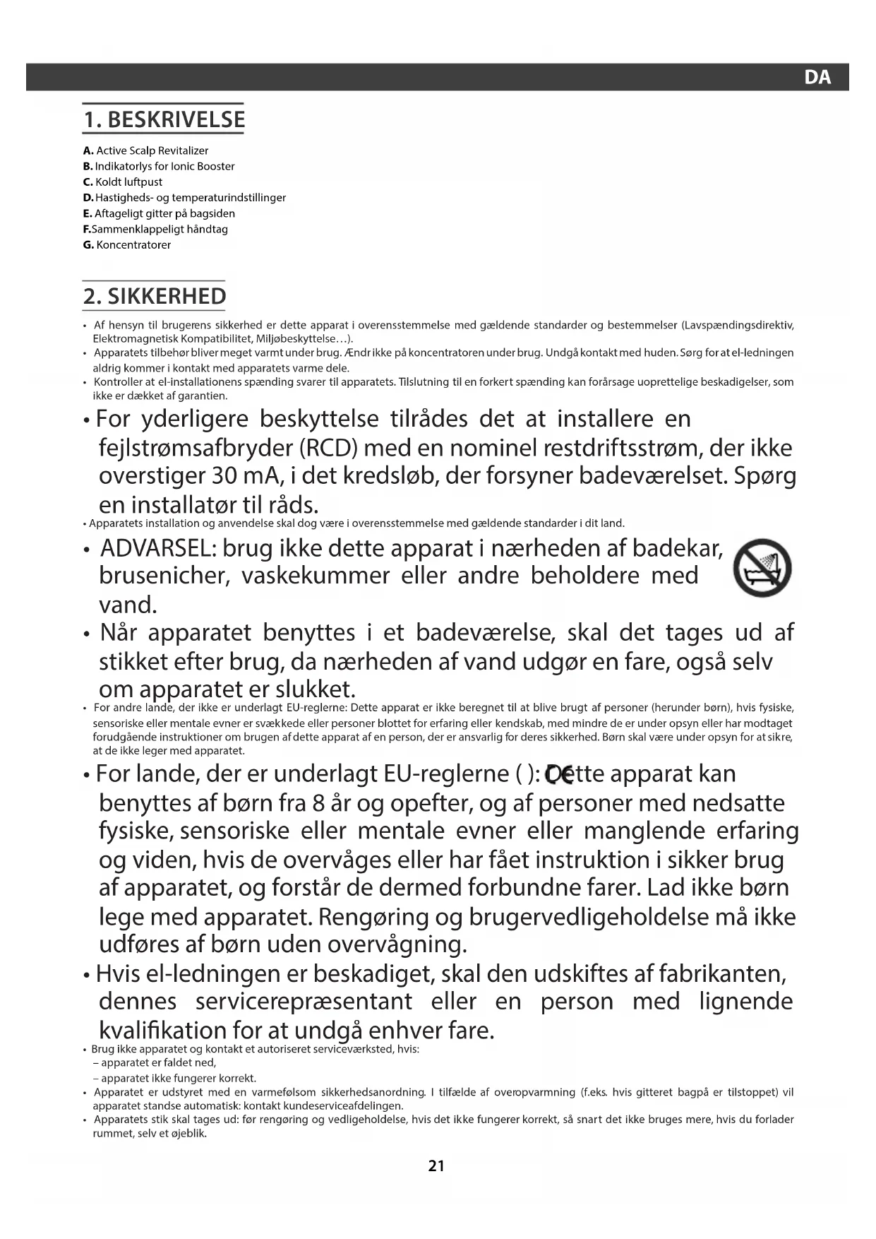 - For andre lande, der ikke er underlagt EU-reglerne: Dette apparat er ikke beregnet til at blive brugt af personer (herunder børn), hvis fysiske, sensoriske eller mentale evner er svækkede eller personer blottet for erfaring eller kendskab, med mindre de er under opsyn eller har modtaget forudgående instruktioner om brugen af dette apparat af en person, der er ansvarlig for deres sikkerhed. Børn skal være under opsyn for at sikre, at de ikke leger med apparatet.