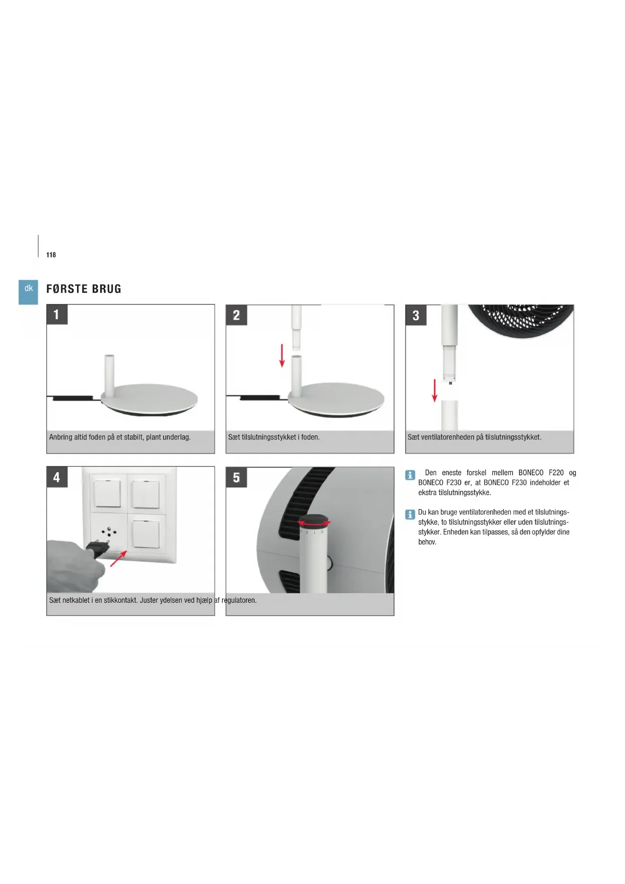 Den eneste forskel mellem BONECO F220 og BONECO F230 er, at BONECO F230 indeholder et ekstra tilslutningsstykke. Du kan bruge ventilatorenheden med et tilslutnings- stykke, to tilslutningsstykker eller uden tilslutnings- stykker. Enheden kan tilpasses, så den opfylder dine behov. Anbring altid foden på et stabilt, plant underlag. Sæt tilslutningsstykket i foden. Sæt ventilatorenheden på tilslutningsstykket. Sæt netkablet i en stikkontakt. Juster ydelsen ved hjælp af regulatoren.