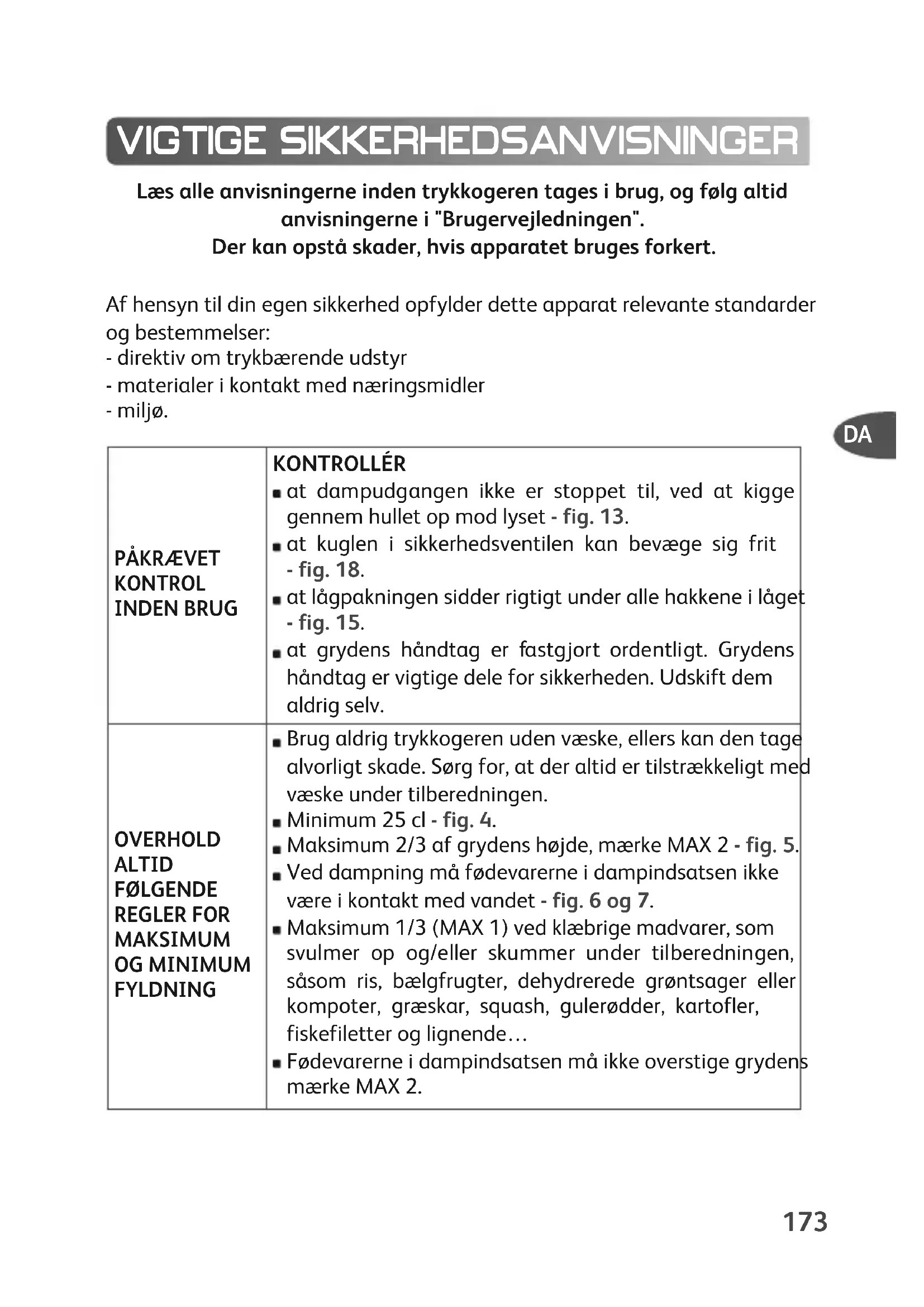 KONTROL INDEN BRUG KONTROLLÉR at dampudgangen ikke er stoppet til, ved at kigge gennem hullet op mod lyset - fig. 13. at kuglen i sikkerhedsventilen kan bevæge sig frit - fig. 18. at lågpakningen sidder rigtigt under alle hakkene i låget - fig. 15. at grydens håndtag er fastgjort ordentligt. Grydens håndtag er vigtige dele for sikkerheden. Udskift dem aldrig selv. OVERHOLD ALTID FØLGENDE REGLER FOR MAKSIMUM OG MINIMUM FYLDNING Brug aldrig trykkogeren uden væske, ellers kan den tage alvorligt skade. Sørg for, at der altid er tilstrækkeligt med væske under tilberedningen. Minimum 25 cl - fig. 4. Maksimum 2/3 af grydens højde, mærke MAX 2 - fig. 5. Ved dampning må fødevarerne i dampindsatsen ikke være i kontakt med vandet - fig. 6 og 7. Maksimum 1/3 (MAX 1) ved klæbrige madvarer, som svulmer op og/eller skummer under tilberedningen, såsom ris, bælgfrugter, dehydrerede grøntsager eller kompoter, græskar, squash, gulerødder, kartofler, fiskefiletter og lignende… Fødevarerne i dampindsatsen må ikke overstige grydens mærke MAX 2.174 INDEN OG UNDER TILBEREDNING Lad ikke børn komme i nærheden af trykkogeren, når den er i brug. Trykkogeren koger under tryk. Forkert brug kan medføre skoldning. Kontrollér, at trykkogeren er forsvarlig lukket, før den sættes over varmen (se afsnittet "Lukning"). Under tilberedningen kontrolleres, at ventilen stadig hvisler. Hvis der ikke kommer nok damp ud, skal trykket bringes ned, inden apparatet åbnes for at kontrollere, om der er tilstrækkelig med væske, og at dampudgangen ikke er stoppet til. Hvis der efter denne kontrol stadig ikke kommer damp ud, skrues lidt op for varmen. Kog ikke fødevarer, som kan stoppe sikkerhedskomponenterne til: - blåbær, tyttebær - perlegryn - havregryn - gule ærter - pasta (makaroni, spaghetti) - rabarber - ribs, stikkelsbær. Lav aldrig retter, der indeholder animalsk mælk, i trykkogeren. Brug ikke groft salt i en trykkoger i rustfrit stål, men kun fint salt, som tilsættes til sidst. Derved undgås grubedannelser i bunden af trykkogeren. Brug ikke trykkogeren til friturestegning under tryk med olie. Brug ikke trykkogeren til andre formål end det, den er beregnet til. Trykkogeren må ikke sættes i en varm ovn. Læg aldrig aluminiumsfolie, som ikke fastholdes i en form, i trykkogeren. Læg aldrig plastfolie i trykkogeren. Alkoholdampe er brandfarlige. Lad retten koge i 2 minutter, inden låget sættes på. Hold trykkogeren under opsyn, når du tilbereder retter, der indeholder alkohol. Brug kompatible varmekilder i overensstemmelse med brugsanvisningerne.EFTER AFSLUTTET TILBEREDNING
