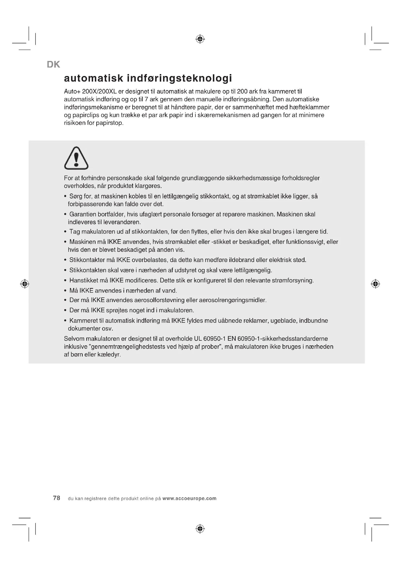 - Kammeret til automatisk indføring må IKKE fyldes med uåbnede reklamer, ugeblade, indbundne dokumenter osv. Selvom makulatoren er designet til at overholde UL 60950-1 EN 60950-1-sikkerhedsstandarderne inklusive ”gennemtrængelighedstests ved hjælp af prober”, må makulatoren ikke bruges i nærheden af børn eller kæledyr. automatisk indføringsteknologi Auto+ 200X/200XL er designet til automatisk at makulere op til 200 ark fra kammeret til automatisk indføring og op til 7 ark gennem den manuelle indføringsåbning. Den automatiske indføringsmekanisme er beregnet til at håndtere papir, der er sammenhæftet med hæfteklammer og papirclips og kun trække et par ark papir ind i skæremekanismen ad gangen for at minimere risikoen for papirstop.AUTO+ 200X&200XL