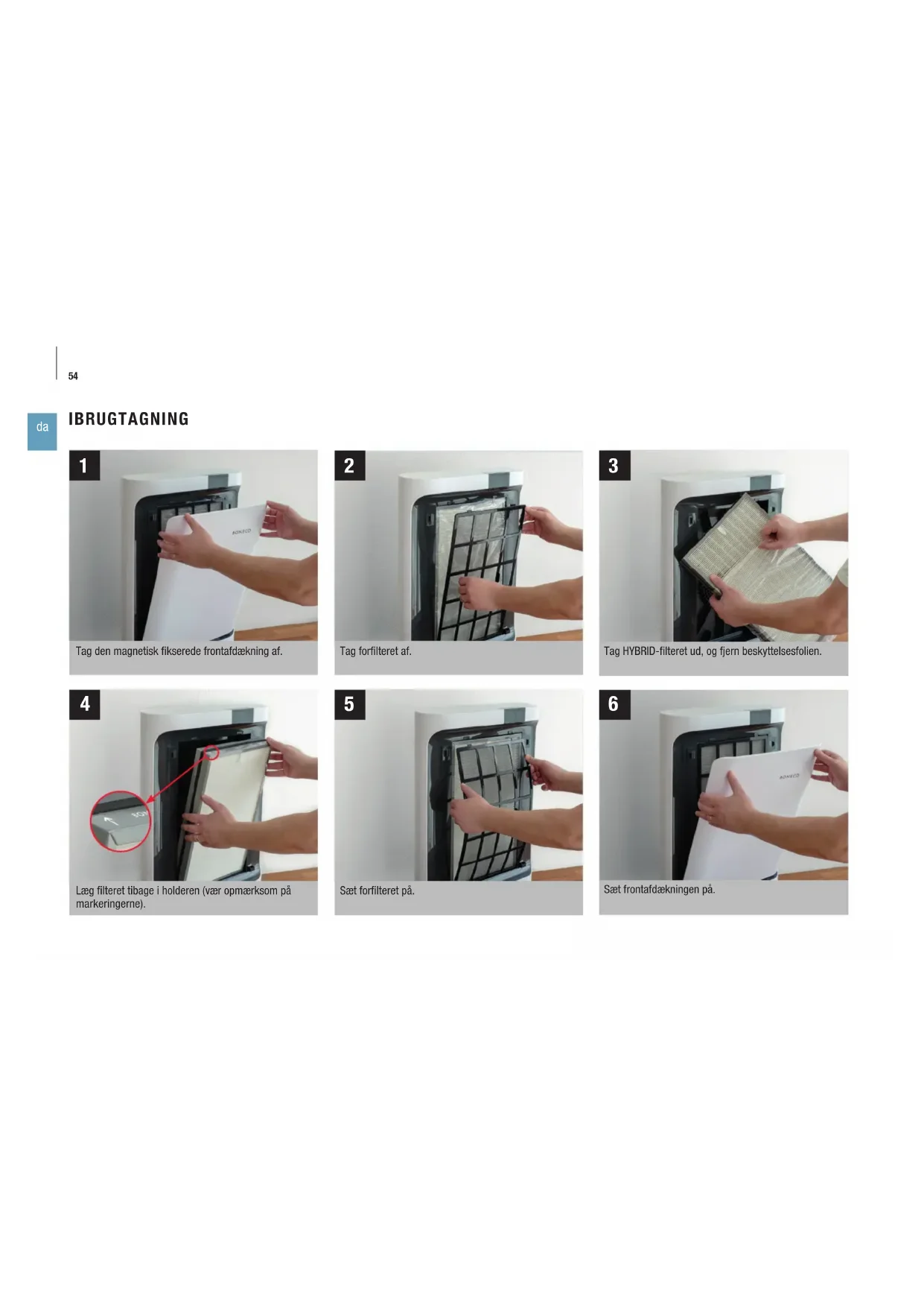 Tag HYBRID-filteret ud, og fjern beskyttelsesfolien. Tag den magnetisk fikserede frontafdækning af. Læg filteret tibage i holderen (vær opmærksom på markeringerne). Tag forfilteret af. Sæt frontafdækningen på. Sæt forfilteret på.55