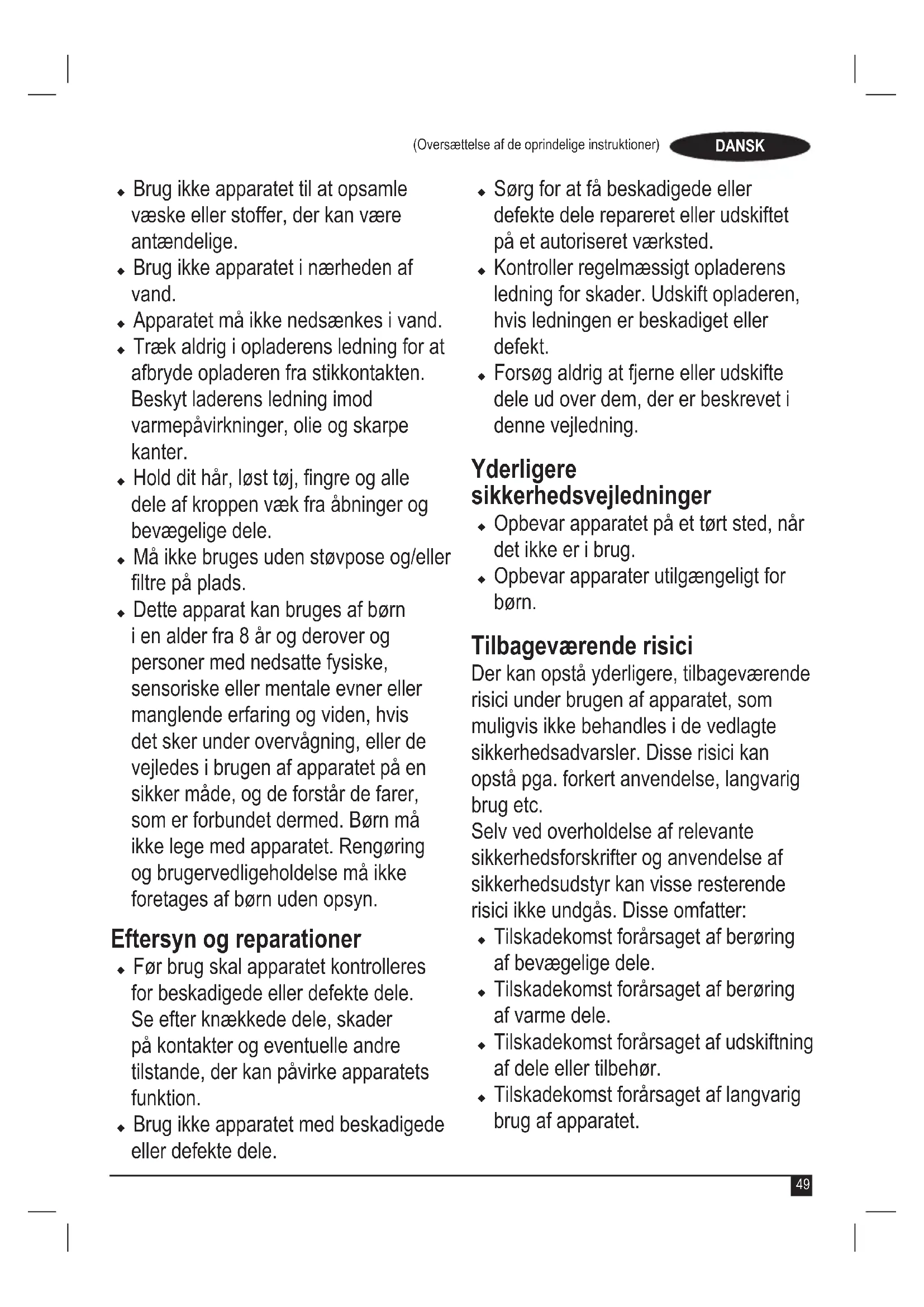 Advarsel! Læs alle sikker- hedsadvarsler og alle in- struktioner. Hvis efterfølgende advarsler og instruktioner ikke følges, er der risiko for elektrisk stød, brand og alvorlige kvæ- stelser. Advarsel! Ved brug af batteridrevne apparater er det vigtigt, at grundlæggende sikkerhedsforholdsregler, herunder nedenstående, altid følges for at mindske risikoen for brand, batterilækage, personskader og materielle skader. u Læs h ele de nne vejledning omhyggeligt, før du bruger apparatet. u Den tilsigtede brug er beskrevet i denne vejledning. Brugen af ekstraudstyr eller tilbehør eller udførelse af andet arbejde med dette apparat end det, der anbefales i denne vejledning, kan udgøre en fare for kvæstelser. u Opbevar denne vejledning til senere brug. Brug af apparatet u Dette apparat indeholder batterier, der kun kan udskiftes af kvalicerede personer.49 (Oversættelse af de oprindelige instruktioner) DANSK u Brug ikke apparatet til at opsamle væske eller stoffer, der kan være antændelige. u Brug ikke apparatet i nærheden af vand. u Apparatet må ikke nedsænkes i vand. u Træk aldrig i opladerens ledning for at afbryde opladeren fra stikkontakten. Beskyt laderens ledning imod varmepåvirkninger, olie og skarpe kanter. u Hold dit hår, løst tøj, ngre og alle dele af kroppen væk fra åbninger og bevægelige dele. u Må ikke bruges uden støvpose og/eller ltre på plads. u Dette apparat kan bruges af børn i en alder fra 8 år og derover og personer med nedsatte fysiske, sensoriske eller mentale evner eller manglende erfaring og viden, hvis det sker under overvågning, eller de vejledes i brugen af apparatet på en sikker måde, og de forstår de farer, som er forbundet dermed. Børn må ikke lege med apparatet. Rengøring og brugervedligeholdelse må ikke foretages af børn uden opsyn. Eftersyn og reparationer u Før brug skal apparatet kontrolleres for beskadigede eller defekte dele. Se efter knækkede dele, skader på kontakter og eventuelle andre tilstande, der kan påvirke apparatets funktion. u Brug ikke apparatet med beskadigede eller defekte dele. u Sørg for at få beskadigede eller defekte dele repareret eller udskiftet på et autoriseret værksted. u Kontroller regelmæssigt opladerens ledning for skader. Udskift opladeren, hvis ledningen er beskadiget eller defekt. u Forsøg aldrig at fjerne eller udskifte dele ud over dem, der er beskrevet i denne vejledning. Yderligere sikkerhedsvejledninger u Opbevar apparatet på et tørt sted, når det ikke er i brug. u Opbevar apparater utilgængeligt for børn. Tilbageværende risici Der kan opstå yderligere, tilbageværende risici under brugen af apparatet, som muligvis ikke behandles i de vedlagte sikkerhedsadvarsler. Disse risici kan opstå pga. forkert anvendelse, langvarig brug etc. Selv ved overholdelse af relevante sikkerhedsforskrifter og anvendelse af sikkerhedsudstyr kan visse resterende risici ikke undgås. Disse omfatter: u Tilskadekomst forårsaget af berøring af bevægelige dele. u Tilskadekomst forårsaget af berøring af varme dele. u Tilskadekomst forårsaget af udskiftning af dele eller tilbehør. u Tilskadekomst forårsaget af langvarig brug af apparatet.50 (Oversættelse af de oprindelige instruktioner) DANSK Husk at holde pause jævnligt ved brug af et apparat i længere tid. u Sundhedsrisici forårsaget af indånding af støv, der genereres ved brug af værktøjet (eksempel: arbejde med træ, især eg, bøg og MDF.) Batterier og opladere Batterier u Forsøg aldrig at åbne den af en eller anden grund. u Batteriet må ikke udsættes for fugt. u Batteriet må ikke udsættes for varme. u Opbevar ikke batterier på steder, hvor temperaturen kan overstige 40°C. u Foretag kun opladning ved omgivelsestemperaturer mellem 10°C og 40°C. u Brug kun den oplader, der fulgte med apparatet/værktøjet, til opladning. Brug af den forkerte oplader kan medføre elektrisk stød eller overophedning af batteriet. u Følg ved bortskaffelse af batterier vejledningen i afsnittet "Miljøbeskyttelse". u Undgå at beskadige/deformere batteripakken ved at punktere den eller slå på den, da dette kan forårsage risiko for tilskadekomst eller brand. u Beskadigede batterier må ikke oplades. u Under ekstreme forhold kan der forekomme batterilækage. Hvis du bemærker væske på batterierne, skal du omhyggeligt tørre den af med en klud. Undgå kontakt med huden. u I tilfælde af kontakt med hud eller øjne skal nedenstående instruktioner følges. Advarsel! Batterivæsken kan forårsage personskader eller materielle skader. I tilfælde af kontakt med huden skylles straks med vand. Søg læge, hvis der opstår rødme, smerte eller irritation. Skyl straks med rent vand, og søg læge i tilfælde af kontakt med øjnene. Opladere Opladeren er udviklet til en specik spænding. Kontroller altid, at netspændingen svarer til spændingen på typeskiltet og oplysningerne i den tekniske datatabel. Advarsel! Forsøg aldrig at erstatte opladerenheden med et almindeligt netstik. u Brug kun din BLACK+DECKER oplader til at oplade batteriet i det apparat/værktøj, som den blev leveret sammen med. Andre batterier kan eksplodere og forårsage kvæstelser og materielle skader. u Prøv aldrig på at oplade ikke- genopladelige batterier. u Hvis netledningen beskadiges, skal den udskiftes af producenten eller et autoriseret BLACK+DECKER- værksted, så farlige situationer undgås. u Opladeren må ikke udsættes for fugt. u Opladeren må ikke åbnes. u Undersøg ikke opladeren.51 (Oversættelse af de oprindelige instruktioner) DANSK u Apparatet/værktøjet/batteriet skal anbringes et sted med god udluftning, når det oplades. Elektricitet og sikkerhed Opladeren er udviklet til en specik spænding. Kontroller altid, at netspændingen svarer til spændingen på typeskiltet. Forsøg aldrig at erstatte opladerenheden med et almindeligt netstik. Symboler på opladeren Læs hele vejledningen omhyg- geligt, før du bruger apparatet.