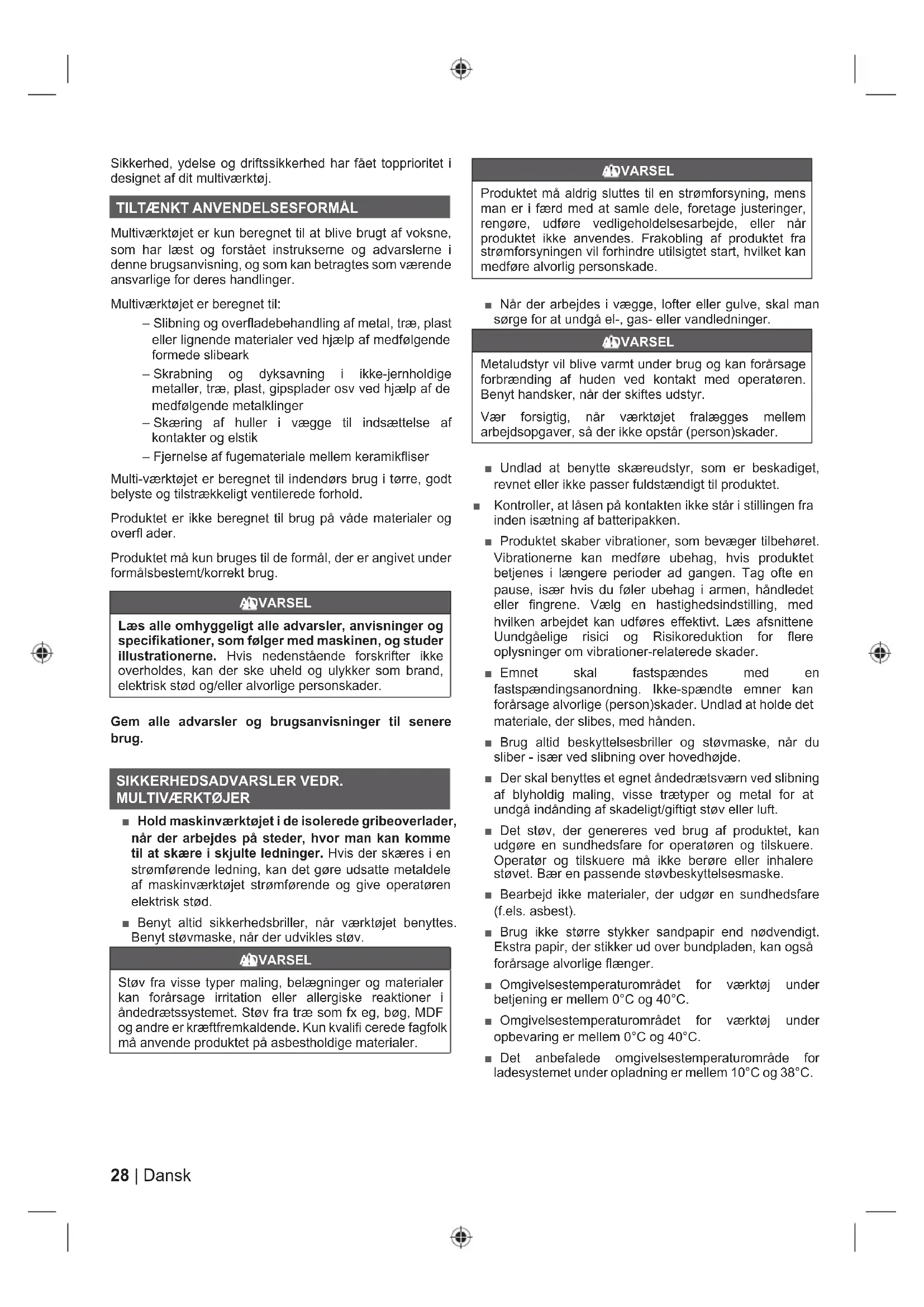 Multiværktøjet er kun beregnet til at blive brugt af voksne, som har læst og forstået instrukserne og advarslerne i denne brugsanvisning, og som kan betragtes som værende ansvarlige for deres handlinger. Multiværktøjet er beregnet til: – Slibning og overfladebehandling af metal, træ, plast eller lignende materialer ved hjælp af medfølgende formede slibeark – Skrabning og dyksavning i ikke-jernholdige metaller, træ, plast, gipsplader osv ved hjælp af de medfølgende metalklinger – Skæring af huller i vægge til indsættelse af kontakter og elstik – Fjernelse af fugemateriale mellem keramikfliser Multi-værktøjet er beregnet til indendørs brug i tørre, godt belyste og tilstrækkeligt ventilerede forhold. Produktet er ikke beregnet til brug på våde materialer og overfl ader. Produktet må kun bruges til de formål, der er angivet under formålsbestemt/korrekt brug. ADVARSEL Læs alle omhyggeligt alle advarsler, anvisninger og specifikationer, som følger med maskinen, og studer illustrationerne. Hvis nedenstående forskrifter ikke overholdes, kan der ske uheld og ulykker som brand, elektrisk stød og/eller alvorlige personskader. Gem alle advarsler og brugsanvisninger til senere brug. SIKKERHEDSADVARSLER VEDR.