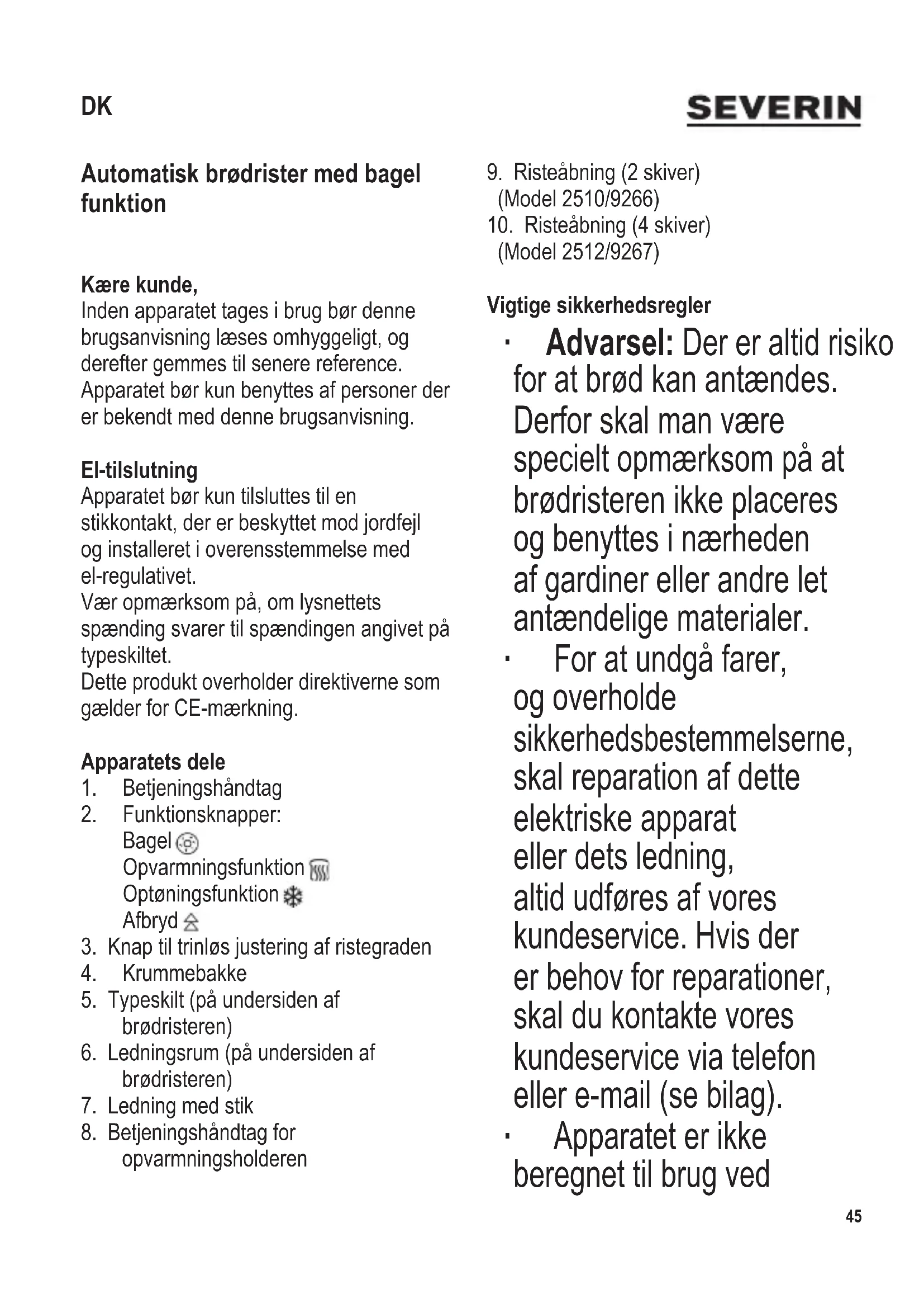 (Model 2512/9267) Vigtige sikkerhedsregler ∙ Advarsel: Der er altid risiko for at brød kan antændes. Derfor skal man være specielt opmærksom på at brødristeren ikke placeres og benyttes i nærheden af gardiner eller andre let antændelige materialer. ∙ For at undgå farer, og overholde sikkerhedsbestemmelserne