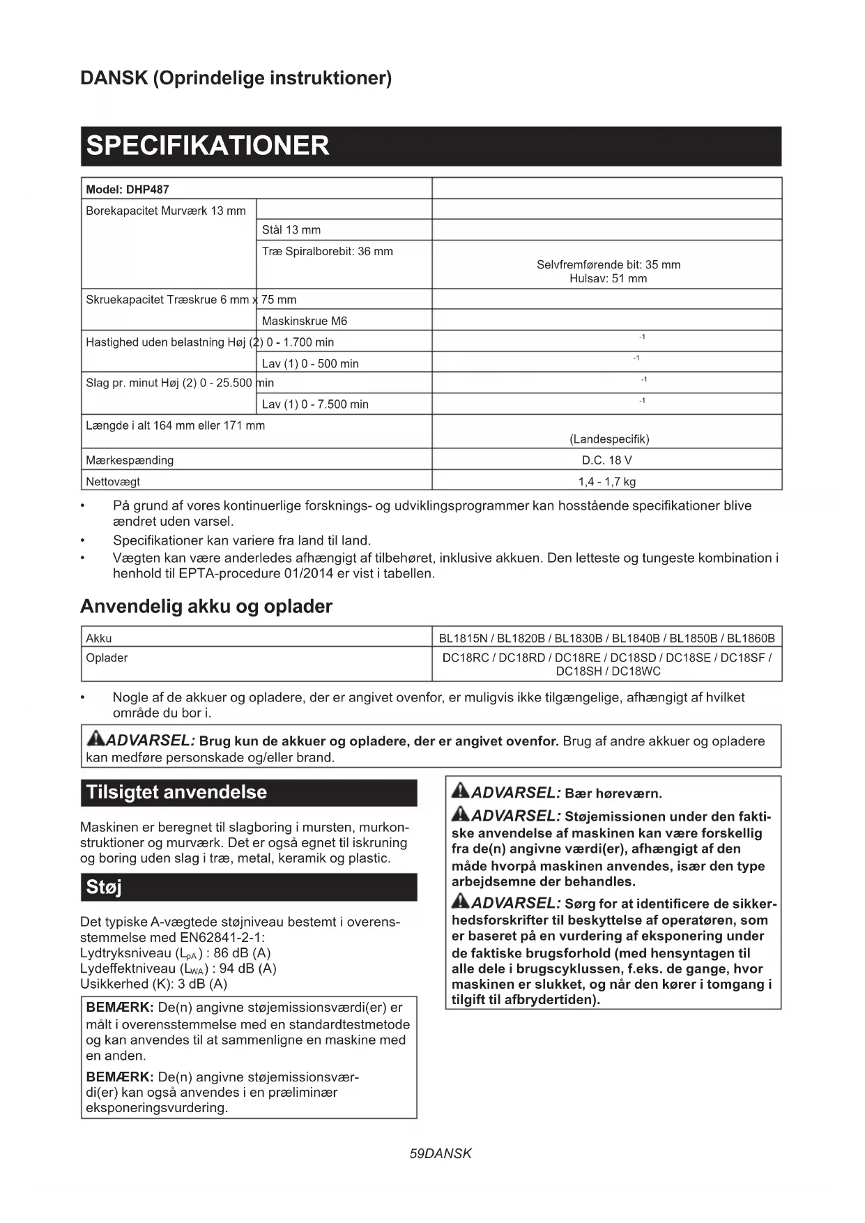 - Nogle af de akkuer og opladere, der er angivet ovenfor, er muligvis ikke tilgængelige, afhængigt af hvilket område du bor i. ADVARSEL: Brug kun de akkuer og opladere, der er angivet ovenfor. Brug af andre akkuer og opladere kan medføre personskade og/eller brand. Tilsigtet anvendelse Maskinen er beregnet til slagboring i mursten, murkon- struktioner og murværk. Det er også egnet til iskruning og boring uden slag i træ, metal, keramik og plastic. Støj Det typiske A-vægtede støjniveau bestemt i overens- stemmelse med EN62841-2-1: Lydtryksniveau (L