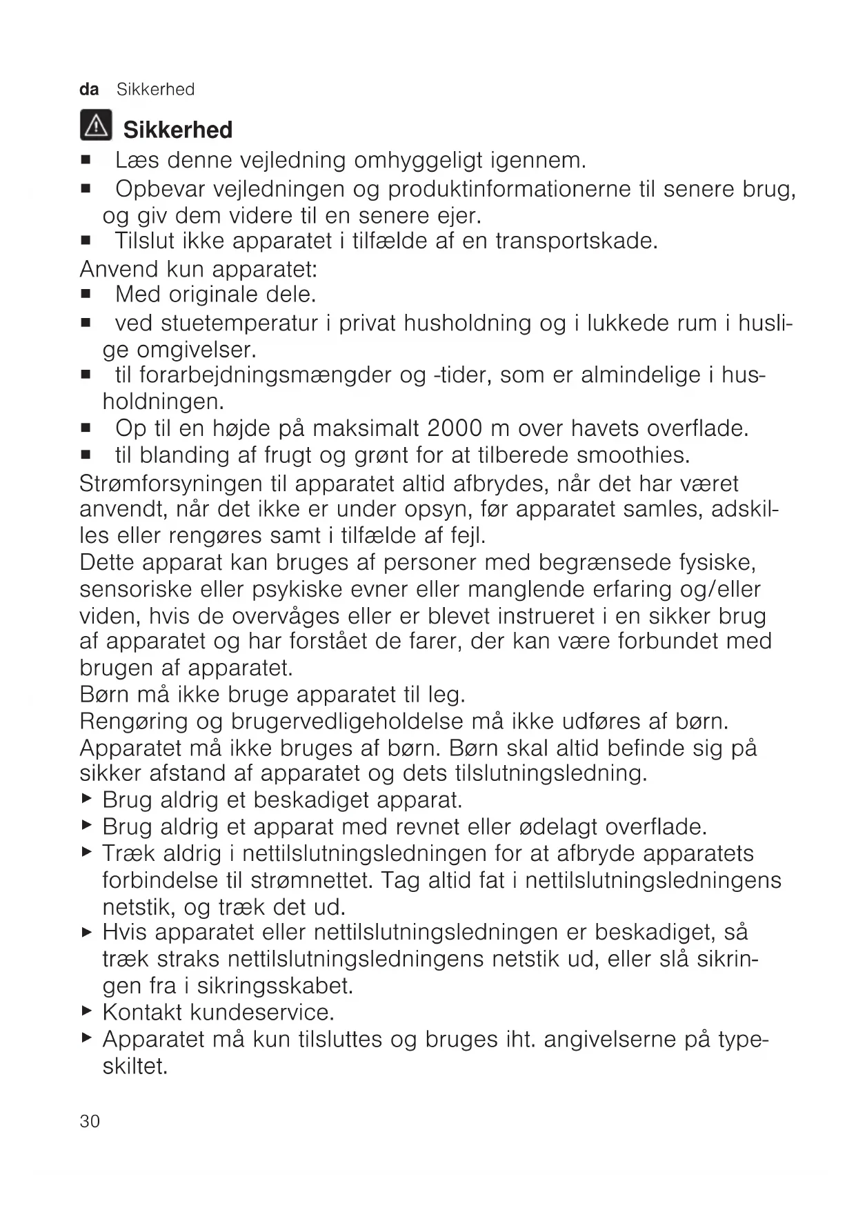 Sikkerhed ¡ Læs denne vejledning omhyggeligt igennem. ¡ Opbevar vejledningen og produktinformationerne til senere brug, og giv dem videre til en senere ejer. ¡ Tilslut ikke apparatet i tilfælde af en transportskade. Anvend kun apparatet: ¡ Med originale dele. ¡ ved stuetemperatur i privat husholdning og i lukkede rum i husli- ge omgivelser. ¡ til forarbejdningsmængder og -tider, som er almindelige i hus- holdningen. ¡ Op til en højde på maksimalt 2000m over havets overflade. ¡ til blanding af frugt og grønt for at tilberede smoothies. Strømforsyningen til apparatet altid afbrydes, når det har været anvendt, når det ikke er under opsyn, før apparatet samles, adskil- les eller rengøres samt i tilfælde af fejl. Dette apparat kan bruges af personer med begrænsede fysiske, sensoriske eller psykiske evner eller manglende erfaring og/eller viden, hvis de overvåges eller er blevet instrueret i en sikker brug af apparatet og har forstået de farer, der kan være forbundet med brugen af apparatet. Børn må ikke bruge apparatet til leg. Rengøring og brugervedligeholdelse må ikke udføres af børn. Apparatet må ikke bruges af børn. Børn skal altid befinde sig på sikker afstand af apparatet og dets tilslutningsledning.