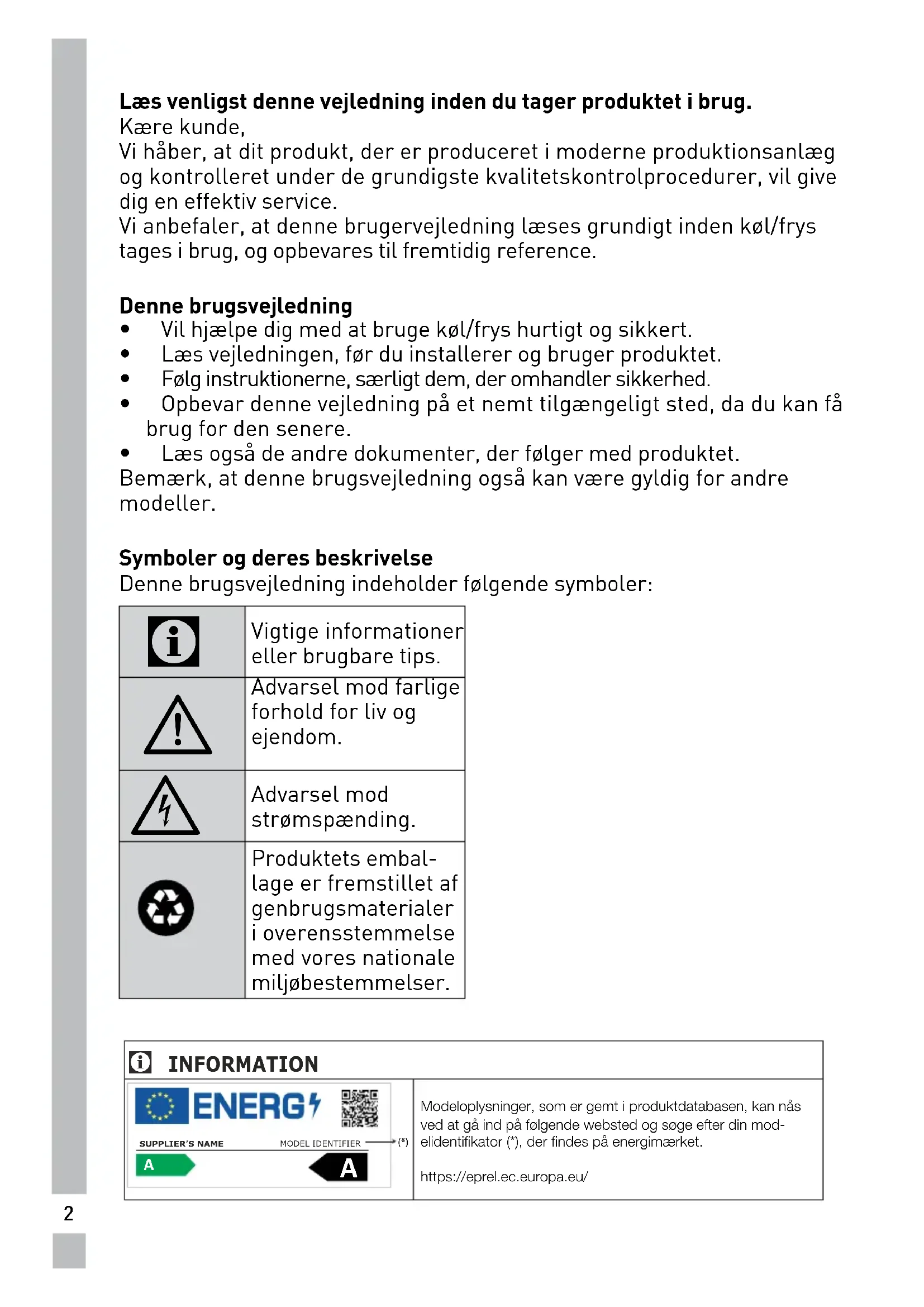 Læs venligst denne vejledning inden du tager produktet i brug. Kære kunde, Vi håber, at dit produkt, der er produceret i moderne produktionsanlæg og kontrolleret under de grundigste kvalitetskontrolprocedurer, vil give dig en effektiv service. Vi anbefaler, at denne brugervejledning læses grundigt inden køl/frys tages i brug, og opbevares til fremtidig reference. Denne brugsvejledning