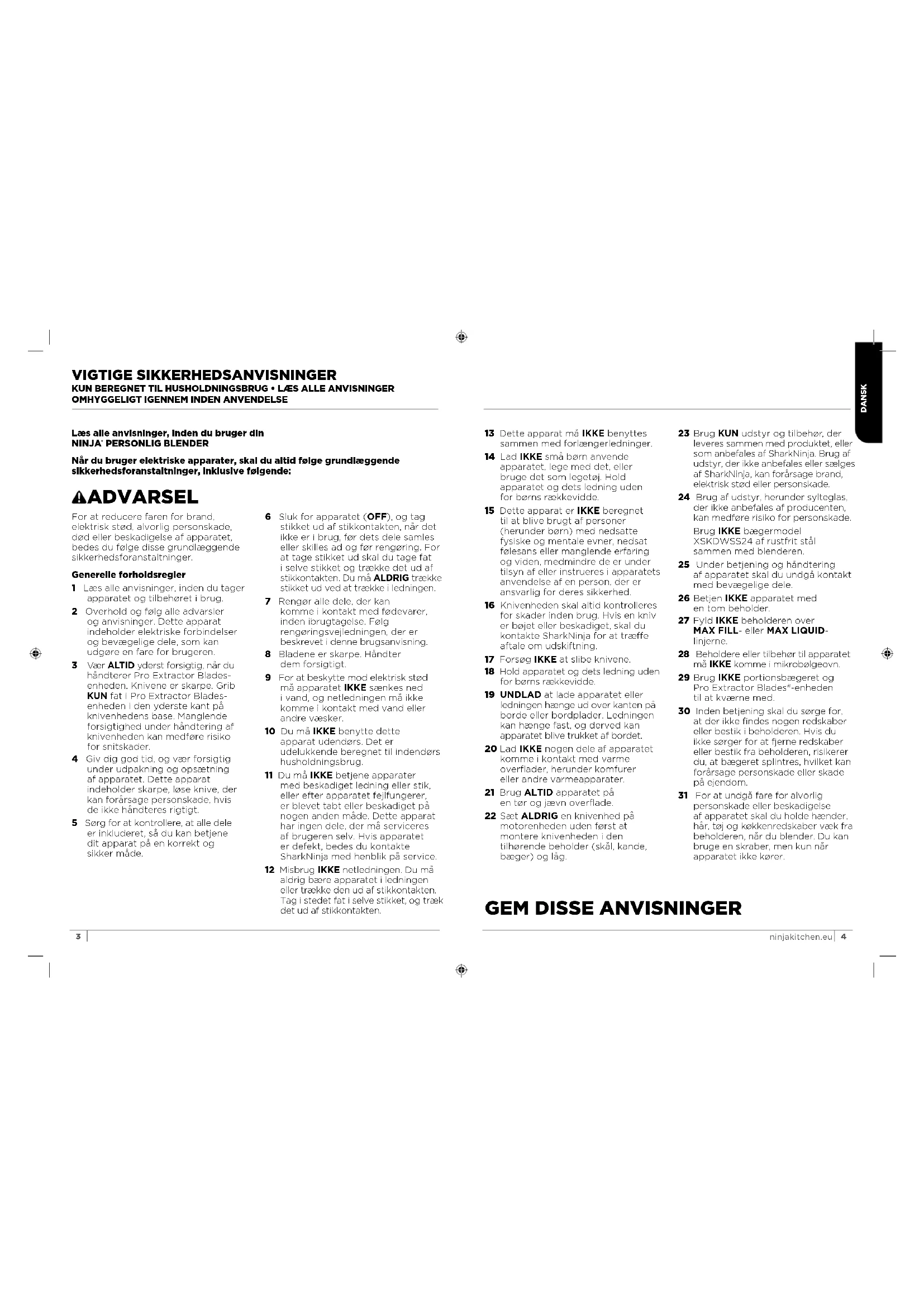 PERSONLIG BLENDER Når du bruger elektriske apparater, skal du altid følge grundlæggende sikkerhedsforanstaltninger, inklusive følgende: ADVARSEL For at reducere faren for brand, elektrisk stød, alvorlig personskade, død eller beskadigelse af apparatet, bedes du følge disse grundlæggende sikkerhedsforanstaltninger. Generelle forholdsregler 1 Læs alle anvisninger, inden du tager apparatet og tilbehøret i brug. 2 Overhold og følg alle advarsler og anvisninger. Dette apparat indeholder elektriske forbindelser og bevægelige dele, som kan udgøre en fare for brugeren. 3 Vær ALTID yderst forsigtig, når du håndterer Pro Extractor Blades- enheden. Knivene er skarpe. Grib KUN fat i Pro Extractor Blades- enheden i den yderste kant på knivenhedens base. Manglende forsigtighed under håndtering af knivenheden kan medføre risiko forsnitskader. 4 Giv dig god tid, og vær forsigtig under udpakning og opsætning af apparatet. Dette apparat indeholder skarpe, løse knive, der kan forårsage personskade, hvis deikke håndteres rigtigt. 5 Sørg for at kontrollere, at alle dele er inkluderet, så du kan betjene dit apparat på en korrekt og sikkermåde. 6 Sluk for apparatet (OFF), og tag stikket ud af stikkontakten, når det ikke er i brug, før dets dele samles eller skilles ad og før rengøring. For at tage stikket ud skal du tage fat i selve stikket og trække det ud af stikkontakten. Du må ALDRIG trække stikket ud ved at trække iledningen. 7 Rengør alle dele, der kan komme i kontakt med fødevarer, inden ibrugtagelse. Følg rengøringsvejledningen, der er beskrevet i denne brugsanvisning. 8 Bladene er skarpe. Håndter demforsigtigt. 9 For at beskytte mod elektrisk stød må apparatet IKKE sænkes ned i vand, og netledningen må ikke komme i kontakt med vand eller andre væsker. 10 Du må IKKE benytte dette apparat udendørs. Det er udelukkende beregnet til indendørs husholdningsbrug. 11 Du må IKKE betjene apparater med beskadiget ledning eller stik, eller efter apparatet fejlfungerer, er blevet tabt eller beskadiget på nogen anden måde. Dette apparat har ingen dele, der må serviceres af brugeren selv. Hvis apparatet er defekt, bedes du kontakte SharkNinja med henblik på service. 12 Misbrug IKKE netledningen. Du må aldrig bære apparatet i ledningen eller trække den ud af stikkontakten. Tag i stedet fat i selve stikket, og træk det ud af stikkontakten. 13 Dette apparat må IKKE benyttes sammen med forlængerledninger. 14 Lad IKKE små børn anvende apparatet, lege med det, eller bruge det som legetøj. Hold apparatet og dets ledning uden forbørns rækkevidde. 15 Dette apparat er IKKE beregnet til at blive brugt af personer (herunder børn) med nedsatte fysiske og mentale evner, nedsat følesans eller manglende erfaring og viden, medmindre de er under tilsyn af eller instrueres i apparatets anvendelse af en person, der er ansvarlig for deres sikkerhed. 16 Knivenheden skal altid kontrolleres for skader inden brug. Hvis en kniv er bøjet eller beskadiget, skal du kontakte SharkNinja for at træe aftale om udskiftning. 17 Forsøg IKKE at slibe knivene. 18 Hold apparatet og dets ledning uden for børns rækkevidde. 19 UNDLAD at lade apparatet eller ledningen hænge ud over kanten på borde eller bordplader. Ledningen kan hænge fast, og derved kan apparatet blive trukket af bordet. 20 Lad IKKE nogen dele af apparatet komme i kontakt med varme overflader, herunder komfurer ellerandre varmeapparater. 21 Brug ALTID apparatet på en tør ogjævn overflade. 22 Sæt ALDRIG en knivenhed på motorenheden uden først at montere knivenheden i den tilhørende beholder (skål, kande, bæger) og låg. 23 Brug KUN udstyr og tilbehør, der leveres sammen med produktet, eller som anbefales af SharkNinja. Brug af udstyr, der ikke anbefales eller sælges af SharkNinja, kan forårsage brand, elektrisk stød ellerpersonskade. 24 Brug af udstyr, herunder sylteglas, der ikke anbefales af producenten, kan medføre risiko for personskade. Brug IKKE bægermodel XSKDWSS24 af rustfrit stål sammen med blenderen. 25 Under betjening og håndtering afapparatet skal du undgå kontakt med bevægelige dele. 26 Betjen IKKE apparatet med en tom beholder. 27 Fyld IKKE beholderen over MAXFILL- eller MAX LIQUID- linjerne. 28 Beholdere eller tilbehør til apparatet må IKKE komme i mikrobølgeovn. 29 Brug IKKE portionsbægeret og ProExtractor Blades®-enheden tilat kværne med. 30 Inden betjening skal du sørge for, at der ikke findes nogen redskaber eller bestik i beholderen. Hvis du ikke sørger for at fjerne redskaber eller bestik fra beholderen, risikerer du, at bægeret splintres, hvilket kan forårsage personskade eller skade på ejendom. 31 For at undgå fare for alvorlig personskade eller beskadigelse afapparatet skal du holde hænder, hår, tøj og køkkenredskaber væk fra beholderen, når du blender. Dukan bruge en skraber, men kun når apparatet ikke kører.