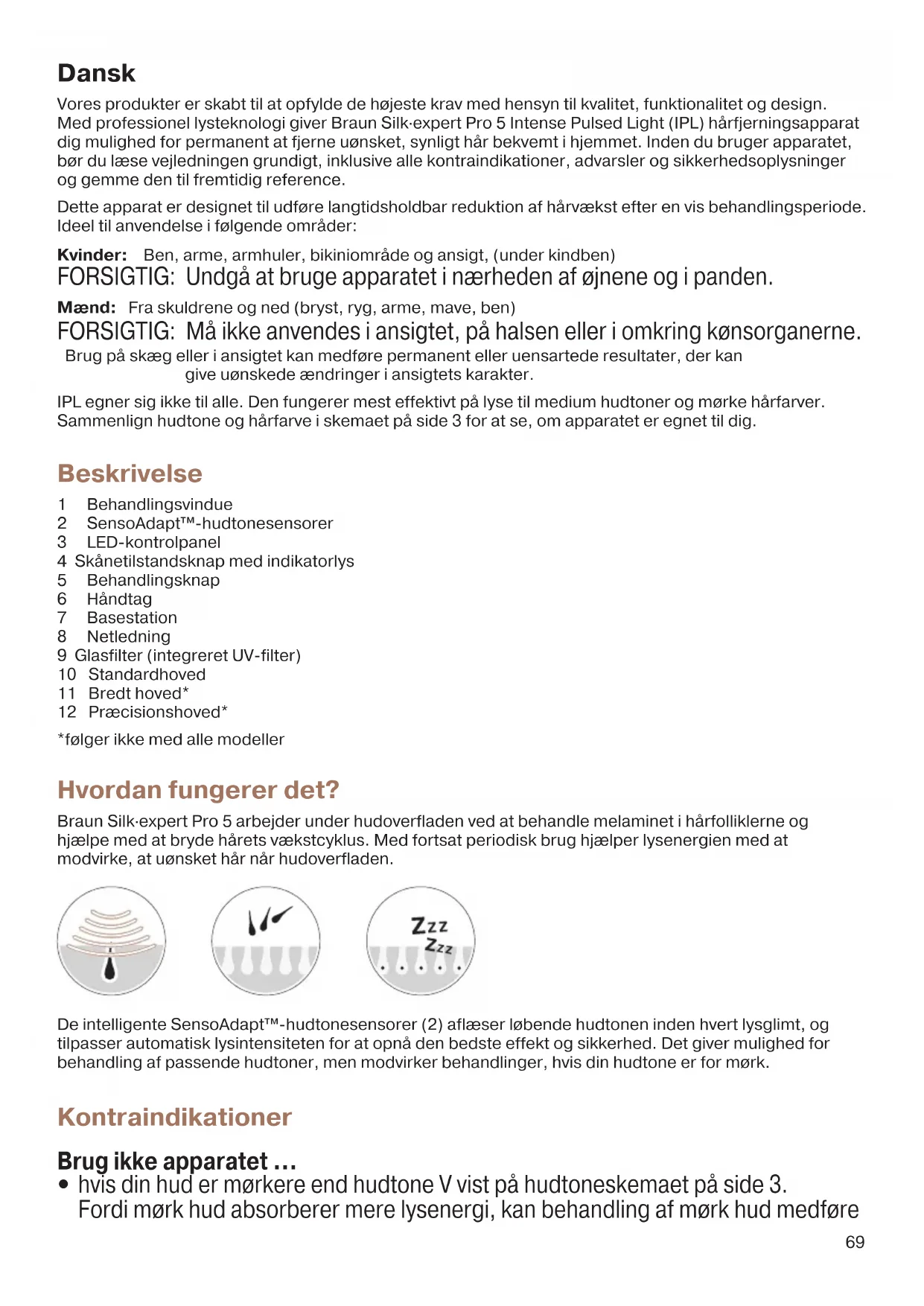 brystvorter, kønsorganer eller omkring anus. Disse områder kan have en mørkere hudtone og/eller tættere hårvækst, og brug af apparatet i disse områder kan medføre ubehag/smerter eller ardannelse på huden.