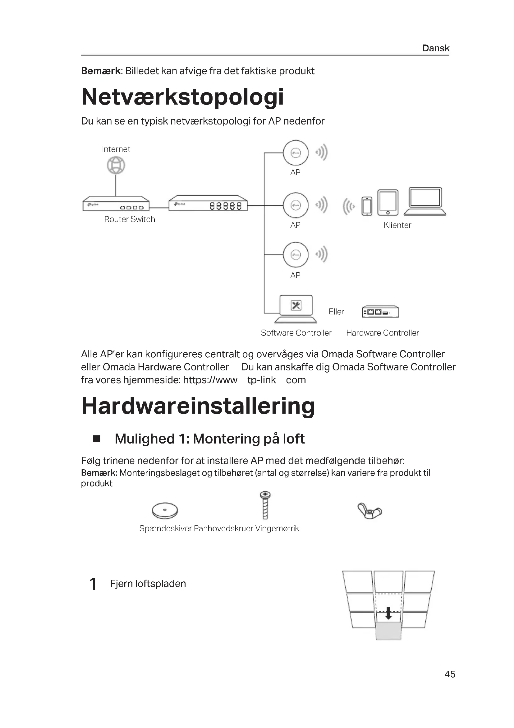 PoE LAN PoE-adapterSvitsj45 Dansk Bemærk: Billedet kan afvige fra det faktiske produkt Netværkstopologi Du kan se en typisk netværkstopologi for AP nedenfor Alle AP’er kan konfigureres centralt og overvåges via Omada Software Controller eller Omada Hardware Controller Du kan anskaffe dig Omada Software Controller fra vores hjemmeside: https://wwwtp-linkcom Hardwareinstallering ■ Mulighed 1: Montering på loft Følg trinene nedenfor for at installere AP med det medfølgende tilbehør: Bemærk: Monteringsbeslaget og tilbehøret (antal og størrelse) kan variere fra produkt til produktSpændeskiver Panhovedskruer Vingemøtrik