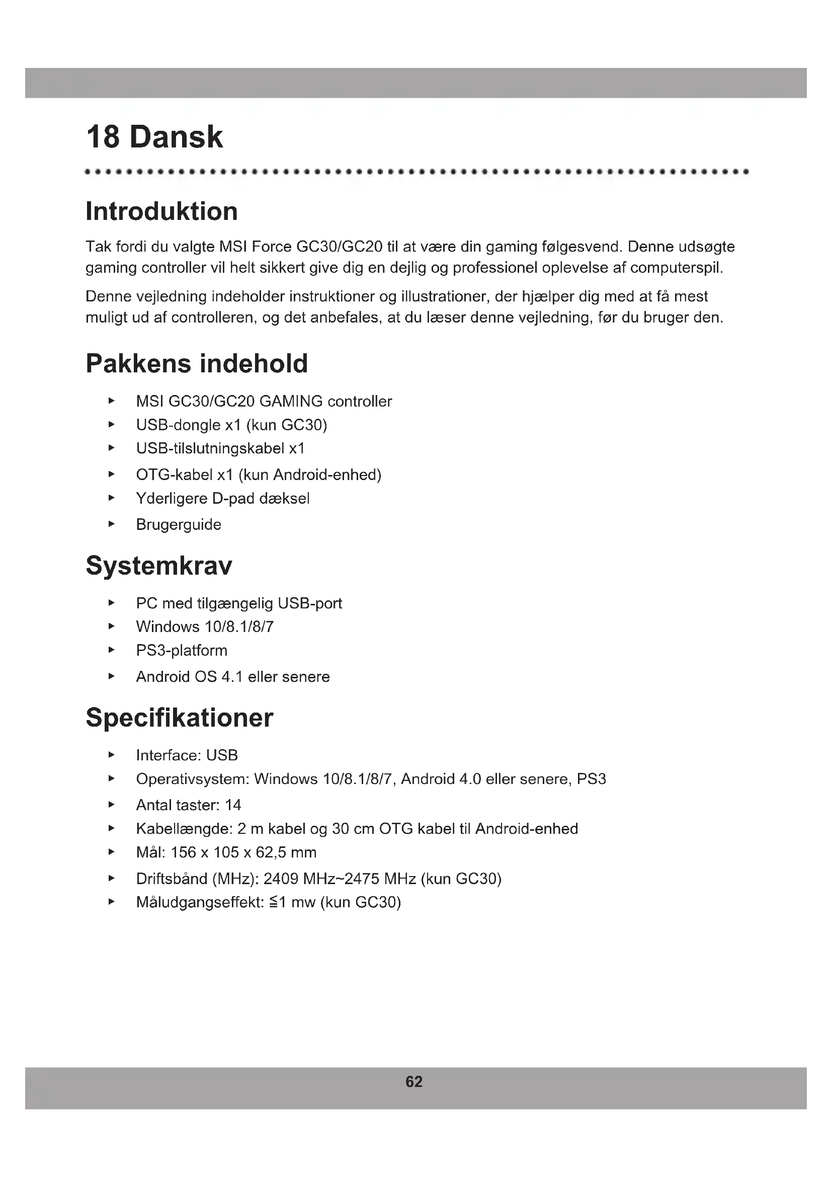 - LEDиндикаторизарежиманатретияичетвъртиярежимсветят,когатоеизбран тозирежим.62 18 Dansk Introduktion Tak fordi du valgte MSI Force GC30/GC20 til at være din gaming følgesvend. Denne udsøgte gaming controller vil helt sikkert give dig en dejlig og professionel oplevelse af computerspil. Denne vejledning indeholder instruktioner og illustrationer, der hjælper dig med at få mest muligt ud af controlleren, og det anbefales, at du læser denne vejledning, før du bruger den. Pakkens indehold ▶ MSI GC30/GC20 GAMING controller ▶ USB-dongle x1 (kun GC30) ▶ USB-tilslutningskabel x1 ▶ OTG-kabel x1 (kun Android-enhed) ▶ Yderligere D-pad dæksel ▶ Brugerguide Systemkrav ▶ PC med tilgængelig USB-port ▶ Windows 10/8.1/8/7 ▶ PS3-platform ▶ Android OS 4.1 eller senere Specifikationer ▶ Interface: USB ▶ Operativsystem: Windows 10/8.1/8/7, Android 4.0 eller senere, PS3 ▶ Antal taster: 14 ▶ Kabellængde: 2 m kabel og 30 cm OTG kabel til Android-enhed ▶ Mål: 156 x 105 x 62,5 mm ▶ Driftsbånd (MHz): 2409 MHz~2475 MHz (kun GC30) ▶ Måludgangseffekt:≦1mw(kunGC30)63 Oversigt
