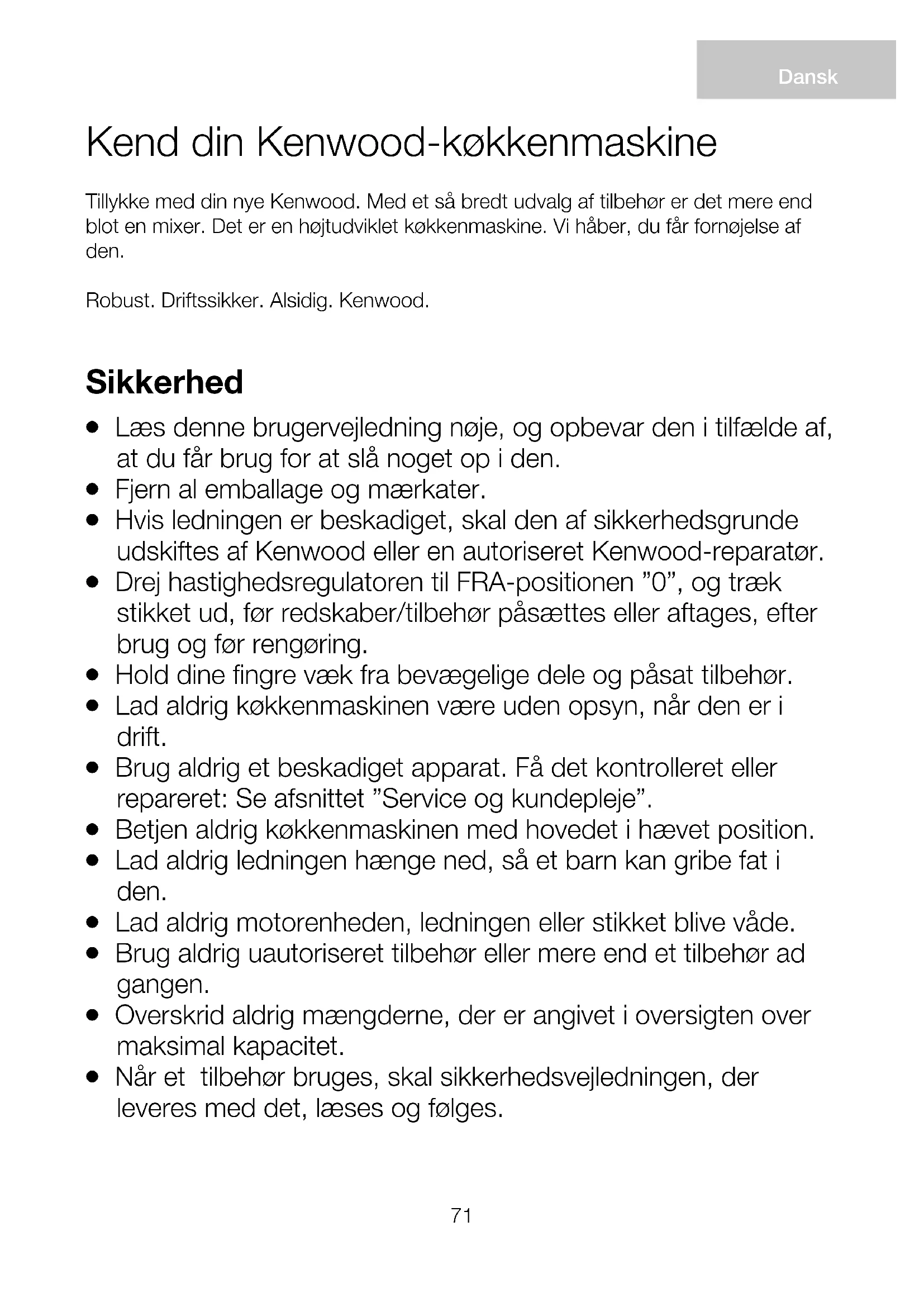 Anvend kun apparatet til husholdningsbrug. Kenwood påtager sig intet erstatningsansvar, hvis apparatet ikke anvendes korrekt eller disse instruktioner ikke følges. Før stikket sættes i