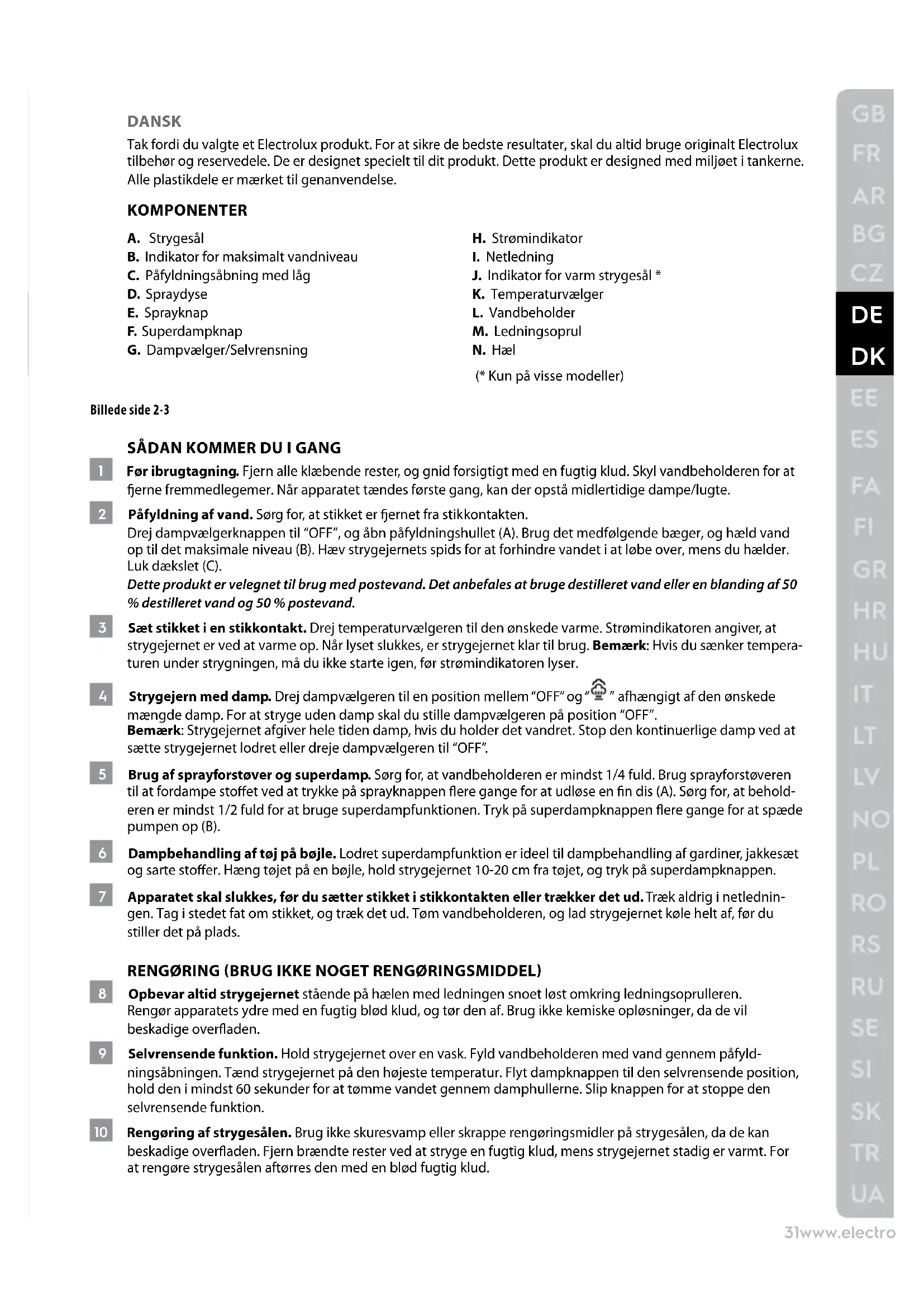 DANSK Tak fordi du valgte et Electrolux produkt. For at sikre de bedste resultater, skal du altid bruge originalt Electrolux tilbehør og reservedele. De er designet specielt til dit produkt. Dette produkt er designed med miljøet i tankerne. Alle plastikdele er mærket til genanvendelse. KOMPONENTER A. Strygesål B. Indikator for maksimalt vandniveau C. Påfyldningsåbning med låg D. Spraydyse E. Sprayknap F. Superdampknap G. Dampvælger/Selvrensning H. Strømindikator
