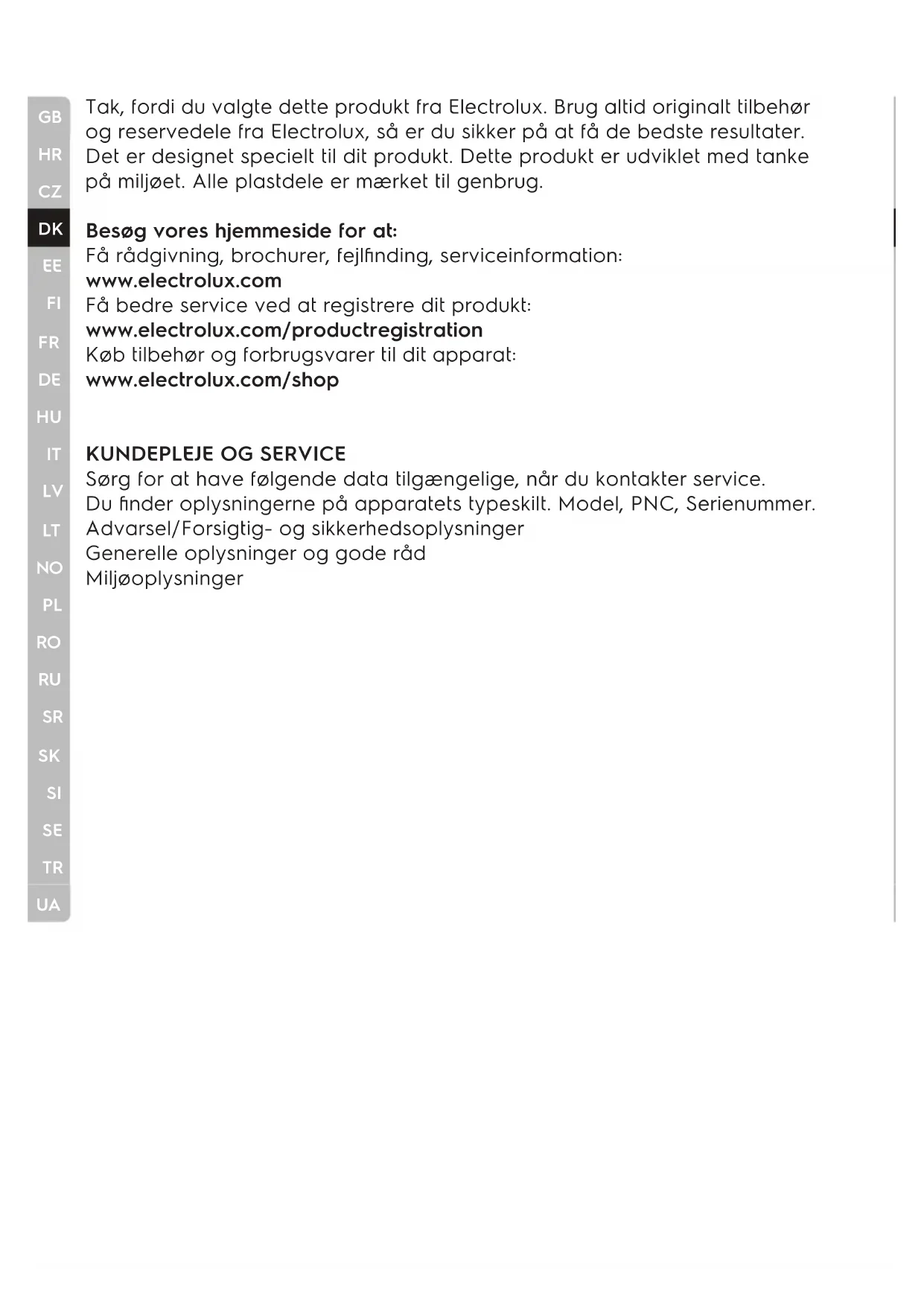Sørg for at have følgende data tilgængelige, når du kontakter service. Du finder oplysningerne på apparatets typeskilt. Model, PNC, Serienummer. Advarsel/Forsigtig- og sikkerhedsoplysninger Generelle oplysninger og gode råd Miljøoplysninger