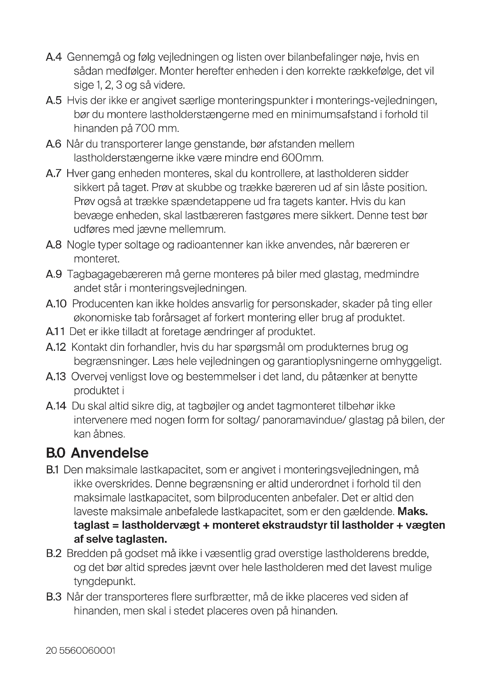Vigtigt - Læs denne vejledning omhyggeligt og gem den for fremtidig reference. ADVARSEL Manglende overholdelse af instruktionerne kan resultere i forkert brug af produktet, hvilket kan føre til skade eller personskade. A.0 Montering A.1 Kontroller i monteringsvejledningen, at alle nødvendige dele er til stede. A.2 Monter ikke Thule-tagbøjler på nogen del af køretøjet, der er blevet ændret på nogen måde. A.3 Rengør bilens tag og de produktdele, der kommer i kontakt med taget – både før og regelmæssigt ved brug.20 5560060001 A.4 Gennemgå og følg vejledningen og listen over bilanbefalinger nøje, hvis en sådan medfølger. Monter herefter enheden i den korrekte rækkefølge, det vil sige 1, 2, 3 og så videre. A.5 Hvis der ikke er angivet særlige monteringspunkter i monterings-vejledningen, bør du montere lastholderstængerne med en minimumsafstand i forhold til hinanden på 700 mm. A.6 Når du transporterer lange genstande, bør afstanden mellem lastholderstængerne ikke være mindre end 600mm. A.7 Hver gang enheden monteres, skal du kontrollere, at lastholderen sidder sikkert på taget. Prøv at skubbe og trække bæreren ud af sin låste position. Prøv også at trække spændetappene ud fra tagets kanter. Hvis du kan bevæge enheden, skal lastbæreren fastgøres mere sikkert. Denne test bør udføres med jævne mellemrum. A.8 Nogle typer soltage og radioantenner kan ikke anvendes, når bæreren er monteret. A.9 Tagbagagebæreren må gerne monteres på biler med glastag, medmindre andet står i monteringsvejledningen. A.10 Producenten kan ikke holdes ansvarlig for personskader, skader på ting eller økonomiske tab forårsaget af forkert montering eller brug af produktet. A.1 1 Det er ikke tilladt at foretage ændringer af produktet. A.12 Kontakt din forhandler, hvis du har spørgsmål om produkternes brug og begrænsninger. Læs hele vejledningen og garantioplysningerne omhyggeligt. A.13 Overvej venligst love og bestemmelser i det land, du påtænker at benytte produktet i A.14 Du skal altid sikre dig, at tagbøjler og andet tagmonteret tilbehør ikke intervenere med nogen form for soltag/ panoramavindue/ glastag på bilen, der kan åbnes. B.0 Anvendelse B.1 Den maksimale lastkapacitet, som er angivet i monteringsvejledningen, må ikke overskrides. Denne begrænsning er altid underordnet i forhold til den maksimale lastkapacitet, som bilproducenten anbefaler. Det er altid den laveste maksimale anbefalede lastkapacitet, som er den gældende. Maks. taglast = lastholdervægt + monteret ekstraudstyr tillastholder + vægten af selve taglasten. B.2 Bredden på godset må ikke i væsentlig grad overstige lastholderens bredde, og det bør altid spredes jævnt over hele lastholderen med det lavest mulige tyngdepunkt. B.3 Når der transporteres flere surfbrætter, må de ikke placeres ved siden af hinanden, men skal i stedet placeres oven på hinanden.215560060001 B.4 Når man transporterer surfbrætter og andre lange genstande, skal disse fastgøres både for og bag på bilen. B.5 Skiene skal transporteres med de spidserne vendt mod bilens bagende. B.6 Alle løse eller aftagelige dele af godset som f.eks. sæder på børnecykler, luftpumper, finner osv. skal tages af inden pålæsning. B.7 Godset skal være forsvarligt fastgjort. Der må ikke anvendes elastiske remme. B.8 Efter kort tids kørsel bør du altid kontrollere, om godset sidder forsvarligt fast, og derefter kontinuerligt tjekke med passende intervaller. Stram godsets fastgørelsesstropper efter behov. BEMÆRK! Kontroller altid, om godset sidder forsvarligt fast. C.0 Køreegenskaber og lovgivning C.1 Bilens hastighed skal altid tilpasses lasten i holderen og de aktuelle kørselsforhold, f.eks. vejtypen, vejens kvalitet, vindforholdene, trafikken og de gældende fartbegrænsninger. Hastigheden må dog under ingen omstændigheder overskride 130 km/t. De gældende fartbegrænsninger og andre færdselslove skal altid overholdes. C.2 Kør langsomt over vejbump, maksimal hastighed 10 km/t. C.3 Bemærk, at bilens højde øges, når der transporteres opretstående gods. C.4 Bilens køre- og bremseegenskaber ændrer sig, og den bliver mere følsom over for sidevind, når der transporteres gods på taget. C.5 Produkter, der er udstyret med en lås, skal altid være låst under transport. C.6 Tilpas din hastighed til vejforholdene og holderens last, og kontrollér jævnligt lastholderens tilspænding, særligt ved kørsel på ujævne veje. D.0 Vedligeholdelse D.1 Kontroller og udskift slidte eller defekte dele. D.2 Lastholderen bør altid rengøres og vedligeholdes korrekt, særligt om vinteren. D.3 Når produktet ikke bruges, bør det afmonteres fra bilen. D.4 Når produktet afmonteres, bør alle løse dele opbevares sikkert.