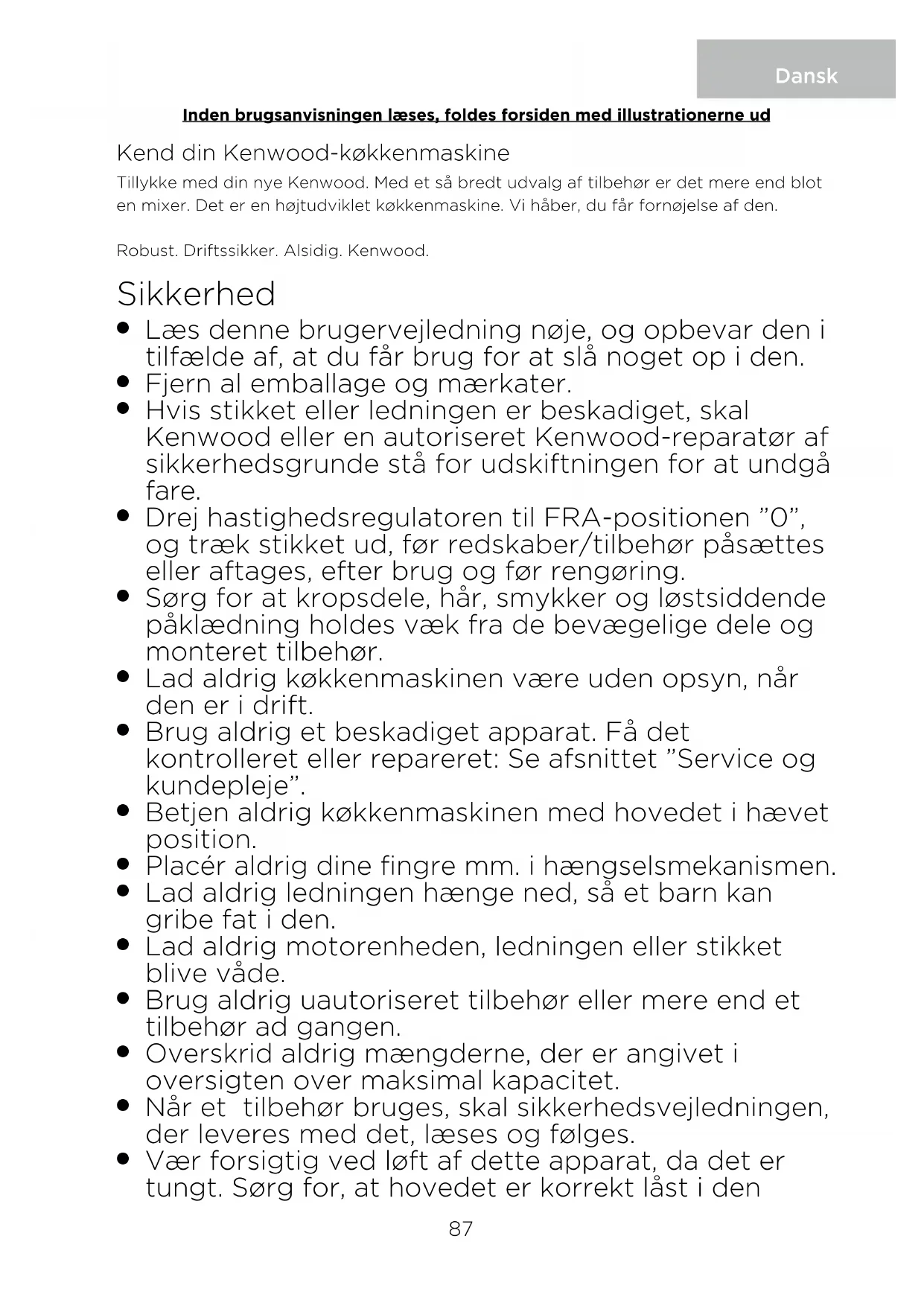 Hvis stikket eller ledningen er beskadiget, skal Kenwood eller en autoriseret Kenwood-reparatør af sikkerhedsgrunde stå for udskiftningen for at undgå fare.