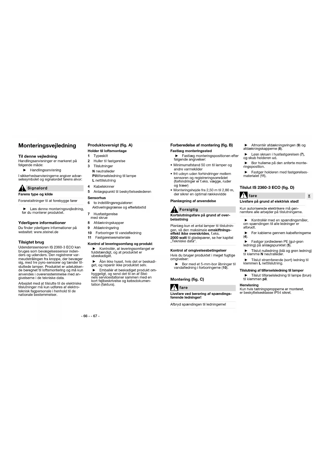 Signalord Farens type og kilde Foranstaltninger til at forebygge farer ► Læs denne monteringsvejledning, før du monterer produktet. Yderligere informationer Du finder yderligere informationer på websitet: www.steinel.de Tilsigtet brug Udendørssensoren IS 2360-3 ECO kan bruges som bevægelsessensor inden- dørs og udendørs. Den registrerer var- meudstrålingen fra kroppe, der bevæger sig, med tre pyro-sensorer og tænder til- sluttede lamper. Produktet er udelukken- de beregnet til loftsmontering og må kun anvendes i overensstemmelse med an- givelserne i de tekniske data. Arbejdet med at tilslutte til de elektriske tilslutninger må kun udføres af elektro- teknisk fagpersonale i henhold til de nationale bestemmelser. Produktoversigt (fig. A) Holder til loftsmontage 1 Typeskilt 2 Huller til fastgørelse 3 Tilslutninger N neutralleder Pil tilførselsledning til lampe Lnettilslutning 4 Kabelskinner 5 Anlægspunkt til beskyttelseslederen Sensorhus 6 to indstillingsregulatorer: Aktiveringsgrænse og efterløbstid 7 Husfastgørelse med skrue 8 Afdækningskapper 9 Afdækningsring 10 Forboringer til vandafledning 11 Fastgørelsesmateriale Kontrol af leveringsomfang og produkt ► Kontrollér, at leveringsomfanget er fuldstændigt, og at produktet er ubeskadiget. ► Åbn ikke huset, hvis det er beskadi- get, og reparér ikke produktet selv. ► Emballér et beskadiget produkt om- hyggeligt, og send det til en af Stei- nels servicestationer sammen med en kort fejlbeskrivelse og købsdokumen- tation (faktura). Forberedelse af montering (fig. B) Fastlæg monteringssted ► Fastlæg monteringspositionen efter følgende angivelser: