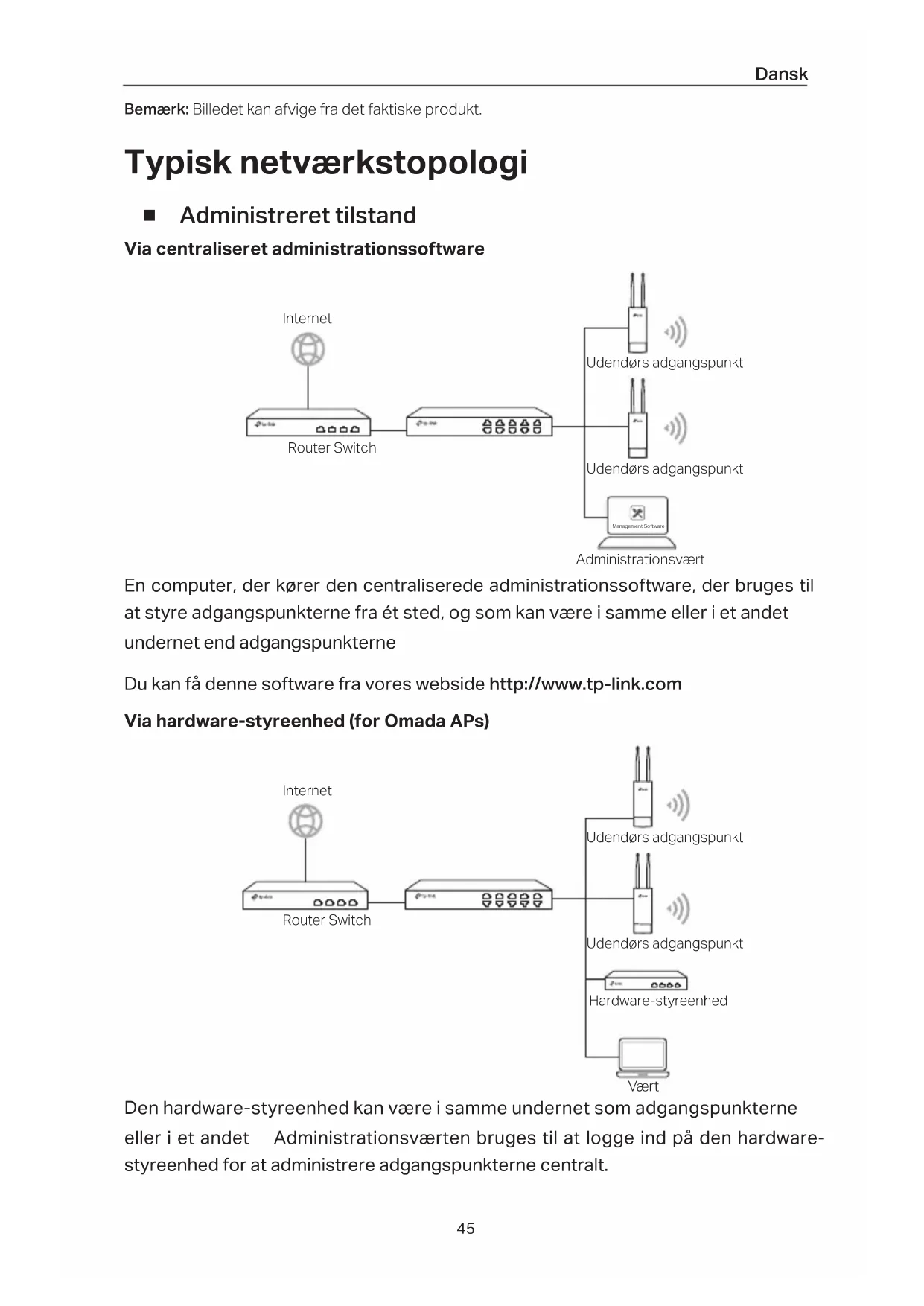 Bemærk: Billedet kan afvige fra det faktiske produkt. Typisk netværkstopologi ■ Administreret tilstand Via centraliseret administrationssoftware Management Software En computer, der kører den centraliserede administrationssoftware, der bruges til at styre adgangspunkterne fra ét sted, og som kan være i samme eller i et andet undernet end adgangspunkterne Du kan få denne software fra vores webside http://www.tp-link.com Via hardware-styreenhed (for Omada APs) Den hardware-styreenhed kan være i samme undernet som adgangspunkterne eller i et andet Administrationsværten bruges til at logge ind på den hardware- styreenhed for at administrere adgangspunkterne centralt. Router Switch Internet Administrationsvært Udendørs adgangspunkt Udendørs adgangspunkt Router Switch Internet Udendørs adgangspunkt Udendørs adgangspunkt Hardware-styreenhed VærtDansk