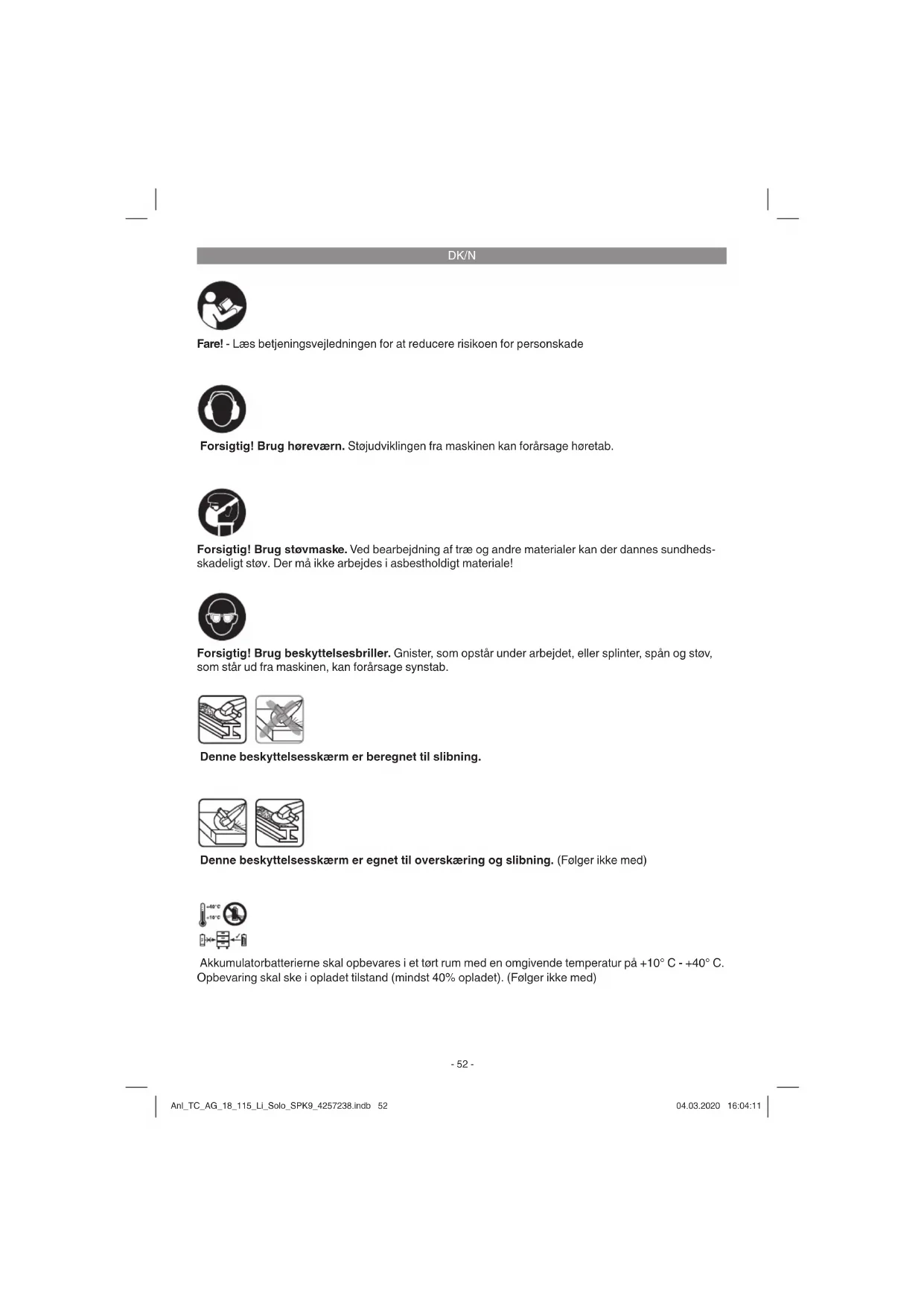 Fare! - Læs betjeningsvejledningen for at reducere risikoen for personskade Forsigtig! Brug høreværn. Støjudviklingen fra maskinen kan forårsage høretab. Forsigtig! Brug beskyttelsesbriller. Gnister, som opstår under arbejdet, eller splinter, spån og støv, som står ud fra maskinen, kan forårsage synstab. Forsigtig! Brug støvmaske. Ved bearbejdning af træ og andre materialer kan der dannes sundheds- skadeligt støv. Der må ikke arbejdes i asbestholdigt materiale! Akkumulatorbatterierne skal opbevares i et tørt rum med en omgivende temperatur på +10° C - +40° C. Opbevaring skal ske i opladet tilstand (mindst 40% opladet). (Følger ikke med) Denne beskyttelsesskærm er beregnet til slibning. Denne beskyttelsesskærm er egnet til overskæring og slibning. (Følger ikke med) Anl_TC_AG_18_115_Li_Solo_SPK9_4257238.indb 52Anl_TC_AG_18_115_Li_Solo_SPK9_4257238.indb 52 04.03.2020 16:04:1104.03.2020 16:04:11DK/N