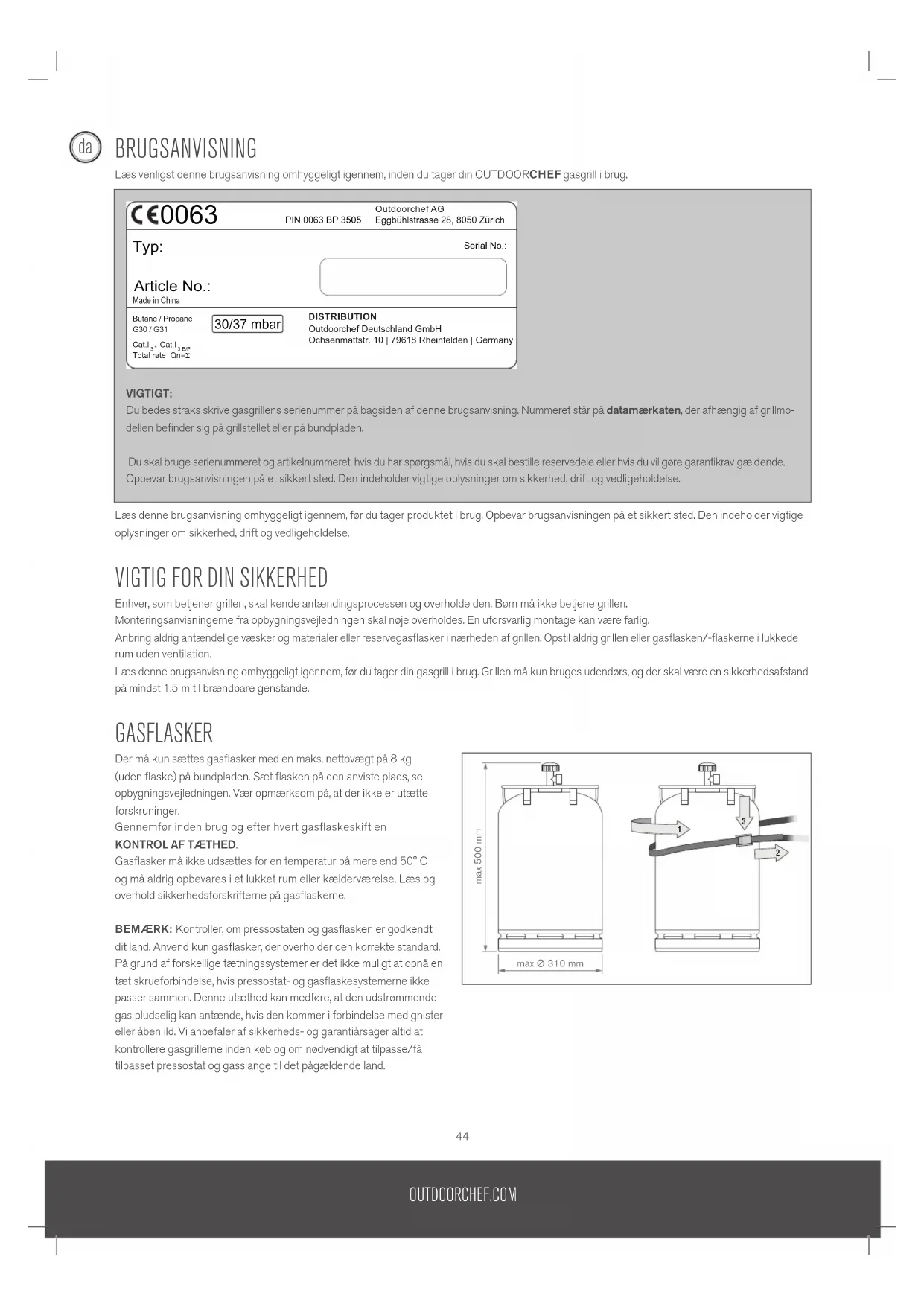 VIGTIGT: Du bedes straks skrive gasgrillens serienummer på bagsiden af denne brugsanvisning. Nummeret står på datamærkaten, der afhængig af grillmo- dellen befinder sig på grillstellet eller på bundpladen. Du skal bruge serienummeret og artikelnummeret, hvis du har spørgsmål, hvis du skal bestille reservedele eller hvis du vil gøre garantikrav gældende. Opbevar brugsanvisningen på et sikkert sted. Den indeholder vigtige oplysninger om sikkerhed, drift og vedligeholdelse. Total rate Qn=Σ Typ: PIN 0063 BP 3505Outdoorchef AGEggbühlstrasse 28, 8050 Zürich