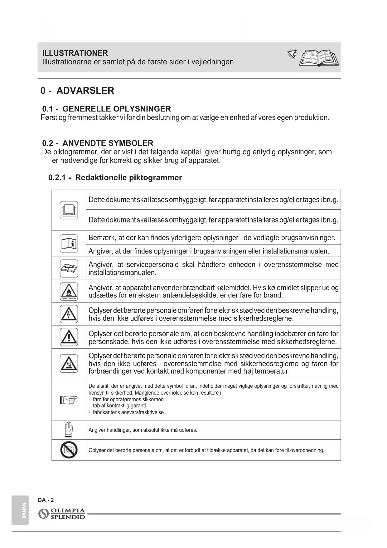 Dette dokument skal læses omhyggeligt, før apparatet installeres og/eller tages i brug. Dette dokument skal læses omhyggeligt, før apparatet installeres og/eller tages i brug. Bemærk, at der kan ndes yderligere oplysninger i de vedlagte brugsanvisninger. Angiver, at der ndes oplysninger i brugsanvisningen eller installationsmanualen. Angiver, at servicepersonale skal håndtere enheden i overensstemmelse med installationsmanualen. Angiver, at apparatet anvender brændbart kølemiddel. Hvis kølemidlet slipper ud og udsættes for en ekstern antændelseskilde, er der fare for brand. Oplyser det berørte personale om faren for elektrisk stød ved den beskrevne handling, hvis den ikke udføres i overensstemmelse med sikkerhedsreglerne. Oplyser det berørte personale om, at den beskrevne handling indebærer en fare for personskade, hvis den ikke udføres i overensstemmelse med sikkerhedsreglerne. Oplyser det berørte personale om faren for elektrisk stød ved den beskrevne handling, hvis den ikke udføres i overensstemmelse med sikkerhedsreglerne og faren for forbrændinger ved kontakt med komponenter med høj temperatur. De afsnit, der er angivet med dette symbol foran, indeholder meget vigtige oplysninger og forskrifter, navnlig med hensyn til sikkerhed. Manglende overholdelse kan resultere i:- fare for operatørernes sikkerhed- tab af kontraktlig garanti- fabrikantens ansvarsfraskrivelse.Angiver handlinger, som absolut ikke må udføres.Oplyser det berørte personale om, at det er forbudt at tildække apparatet, da det kan føre til overophedning. ILLUSTRATIONER Illustrationerne er samlet på de første sider i vejledningenAQUARIA S1 10/12/14/16 P DA - 3 DANSK