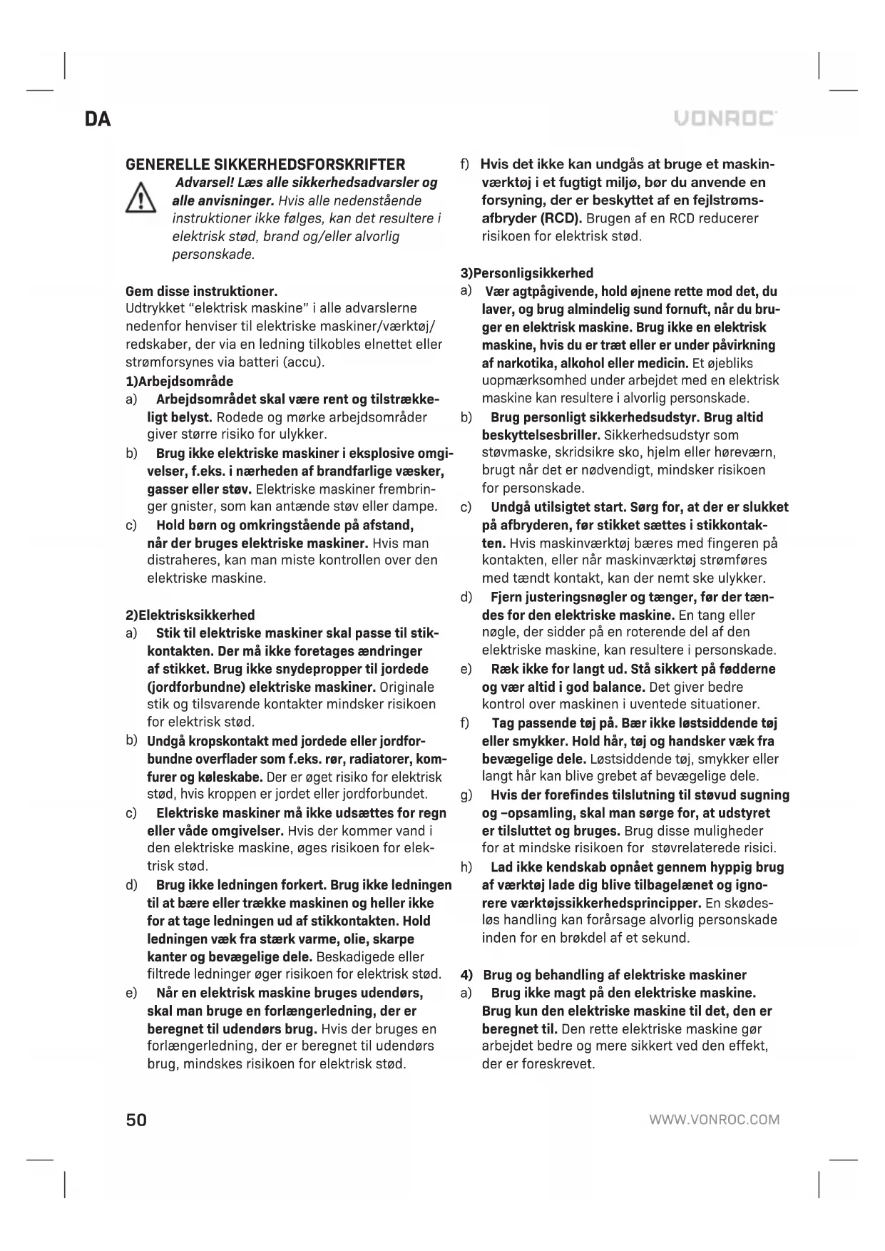 Før rengøring og vedligeholdelse skal du altid slukke for maskinen og trække netstikket ud af kontakten. Rengør maskinbeklædningerne regelmæssigt med en blød klud, helst efter hver anvendelse. Sørg for, at der ikke er støv eller snavs i ventilationsåbnin- gerne. Fjern snavs, der sidder meget godt fast, med en blød klud, der er fugtet i sæbevand. Brug ikke opløsningsmidler, som f.eks. benzin, sprit, ammoniak osv. Kemikalier som disse beskadiger de syntetiske komponenter. MILJØ Defekte og/eller bortskaffede elektriske og elektroniske apparater skal afleveres på en passende genbrugsstation. Kun for EU-lande Smid ikke el-værktøjer ud sammen med alminde- ligt affald. I henhold til de europæiske direktiver 2012/19/EU for elektrisk og elektronisk udstyr og er implementeret i henhold til nationale rettigheder, el-værktøj som ikke længere er anvendelig skal indsamles separat og genbruges på en miljøvenlig måde. GARANTIVILKÅR VONROC produkter er udviklet efter de højeste kvalitetsstandarder og er garanteret fri for mangler i såvel materialer som udførelse i den lovpligtige periode, der starter fra datoen for det oprindelige køb. Skulle produktet udvikle nogen fejl i løbet af denne periode på grund af defekte materialer og/ eller fabrikationsfejl, så kontakt VONROC direkte. De følgende forhold er udelukket fra denne garanti: