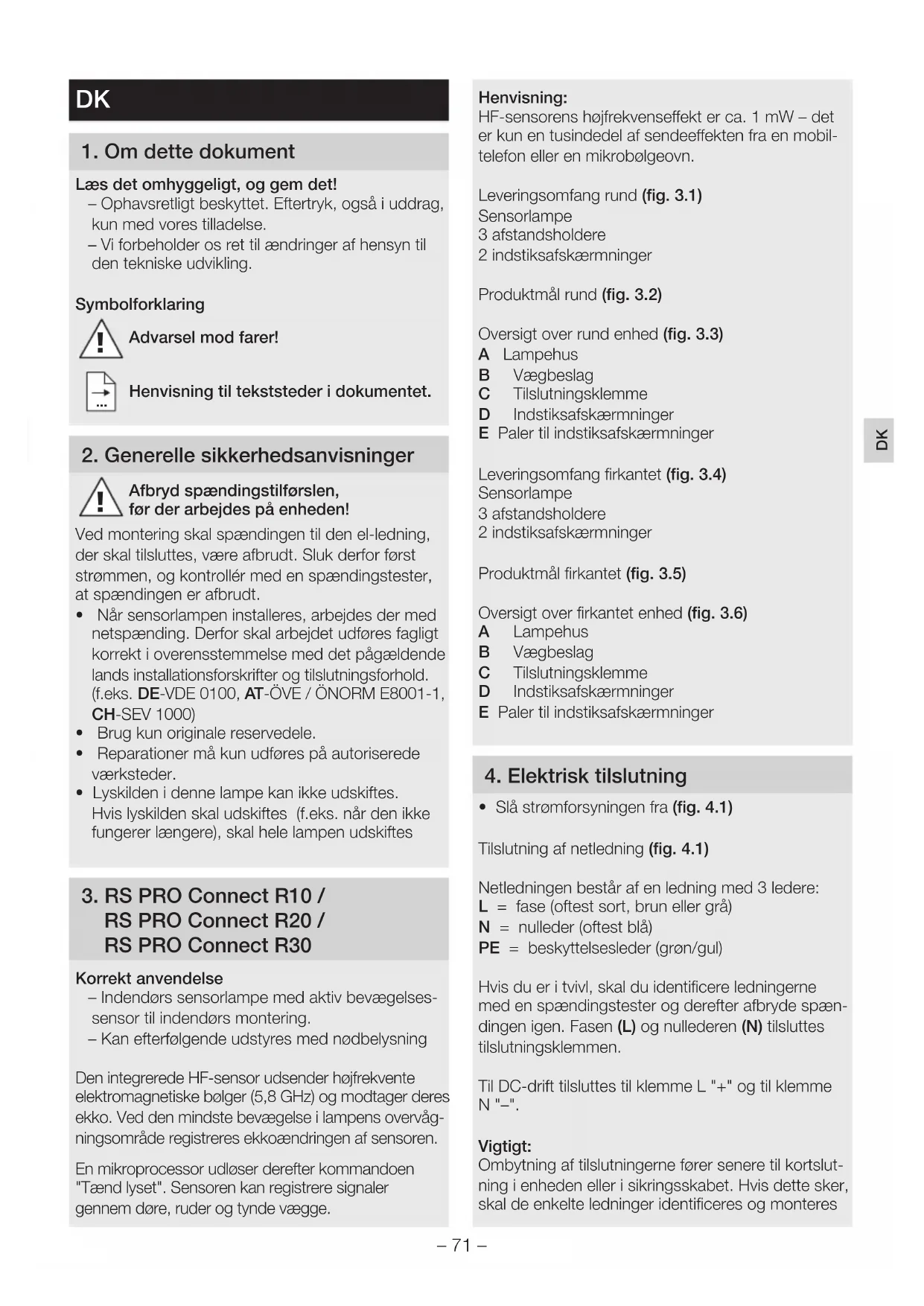 RS PRO Connect R20 / RS PRO Connect R30 Korrekt anvendelse – Indendørs sensorlampe med aktiv bevægelses- sensor til indendørs montering. – Kan efterfølgende udstyres med nødbelysning Den integrerede HF-sensor udsender højfrekvente elektromagnetiske bølger (5,8 GHz) og modtager deres ekko. Ved den mindste bevægelse i lampens overvåg- ningsområde registreres ekkoændringen af sensoren. En mikroprocessor udløser derefter kommandoen "Tænd lyset". Sensoren kan registrere signaler gennem døre, ruder og tynde vægge. Henvisning: HF-sensorens højfrekvenseekt er ca. 1 mW – det er kun en tusindedel af sendeeekten fra en mobil- telefon eller en mikrobølgeovn. Leveringsomfang rund (fig.3.1) Sensorlampe 3 afstandsholdere 2 indstiksafskærmninger Produktmål rund (fig.3.2) Oversigt over rund enhed (fig.3.3) A Lampehus B Vægbeslag C Tilslutningsklemme D Indstiksafskærmninger E Paler til indstiksafskærmninger Leveringsomfang firkantet (fig.3.4) Sensorlampe 3 afstandsholdere 2 indstiksafskærmninger Produktmål firkantet (fig.3.5) Oversigt over firkantet enhed (fig.3.6) A Lampehus B Vægbeslag C Tilslutningsklemme D Indstiksafskærmninger E Paler til indstiksafskærmninger