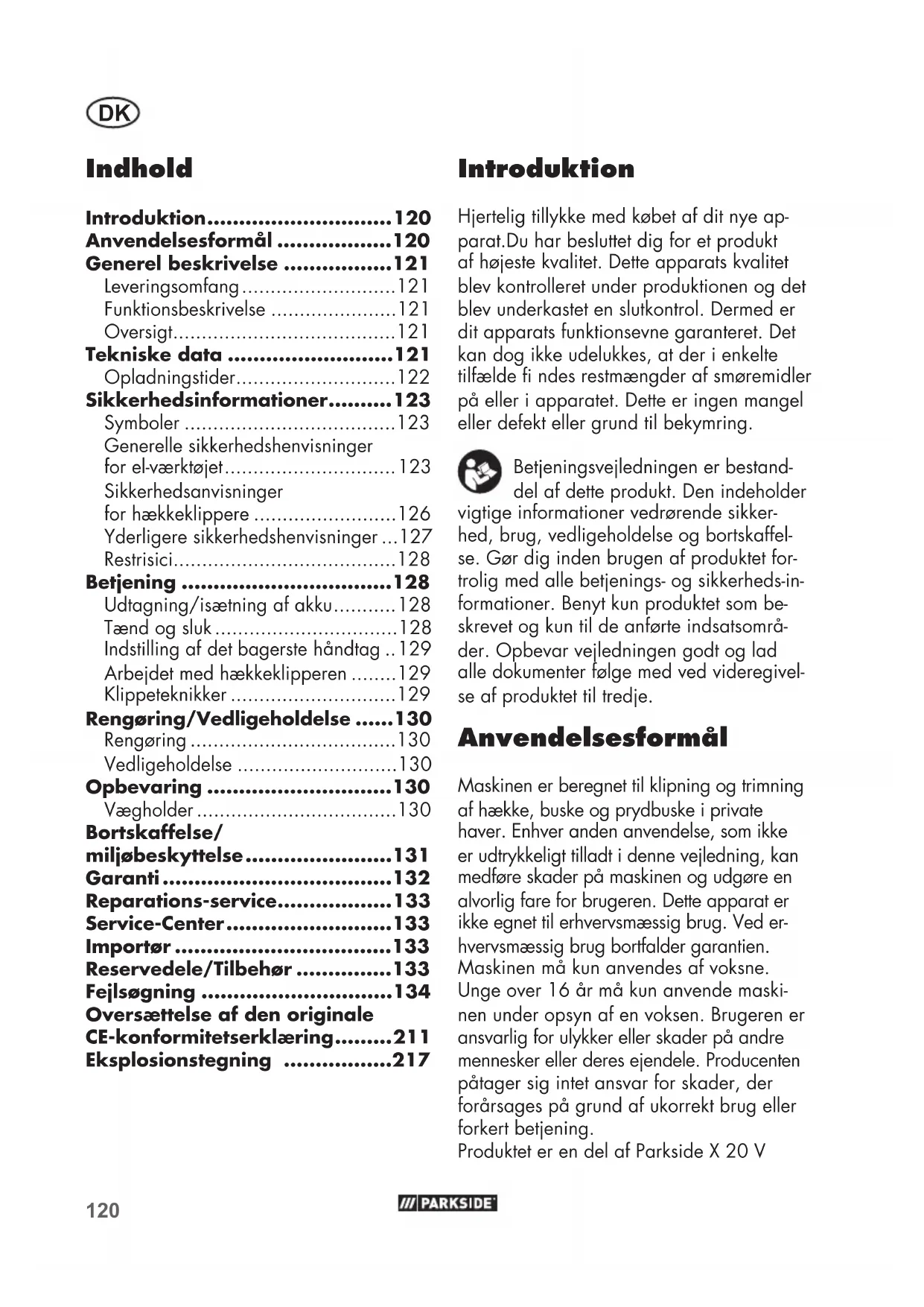 - Introduktion Hjertelig tillykke med købet af dit nye ap- parat.Du har besluttet dig for et produkt af højeste kvalitet. Dette apparats kvalitet blev kontrolleret under produktionen og det blev underkastet en slutkontrol. Dermed er dit apparats funktionsevne garanteret. Det kan dog ikke udelukkes, at der i enkelte tilfælde ndes restmængder af smøremidler på eller i apparatet. Dette er ingen mangel eller defekt eller grund til bekymring. Betjeningsvejledningen er bestand- del af dette produkt. Den indeholder vigtige informationer vedrørende sikker- hed, brug, vedligeholdelse og bortskaffel- se. Gør dig inden brugen af produktet for- trolig med alle betjenings- og sikkerheds-in- formationer. Benyt kun produktet som be- skrevet og kun til de anførte indsatsområ- der. Opbevar vejledningen godt og lad alle dokumenter følge med ved videregivel- se af produktet til tredje. Anvendelsesformål Maskinen er beregnet til klipning og trimning af hække, buske og prydbuske i private haver. Enhver anden anvendelse, som ikke er udtrykkeligt tilladt i denne vejledning, kan medføre skader på maskinen og udgøre en alvorlig fare for brugeren. Dette apparat er ikke egnet til erhvervsmæssig brug. Ved er- hvervsmæssig brug bortfalder garantien. Maskinen må kun anvendes af voksne. Unge over 16 år må kun anvende maski- nen under opsyn af en voksen. Brugeren er ansvarlig for ulykker eller skader på andre mennesker eller deres ejendele. Producenten påtager sig intet ansvar for skader, der forårsages på grund af ukorrekt brug eller forkert betjening. Produktet er en del af Parkside X 20 V Indhold Introduktion p. 120