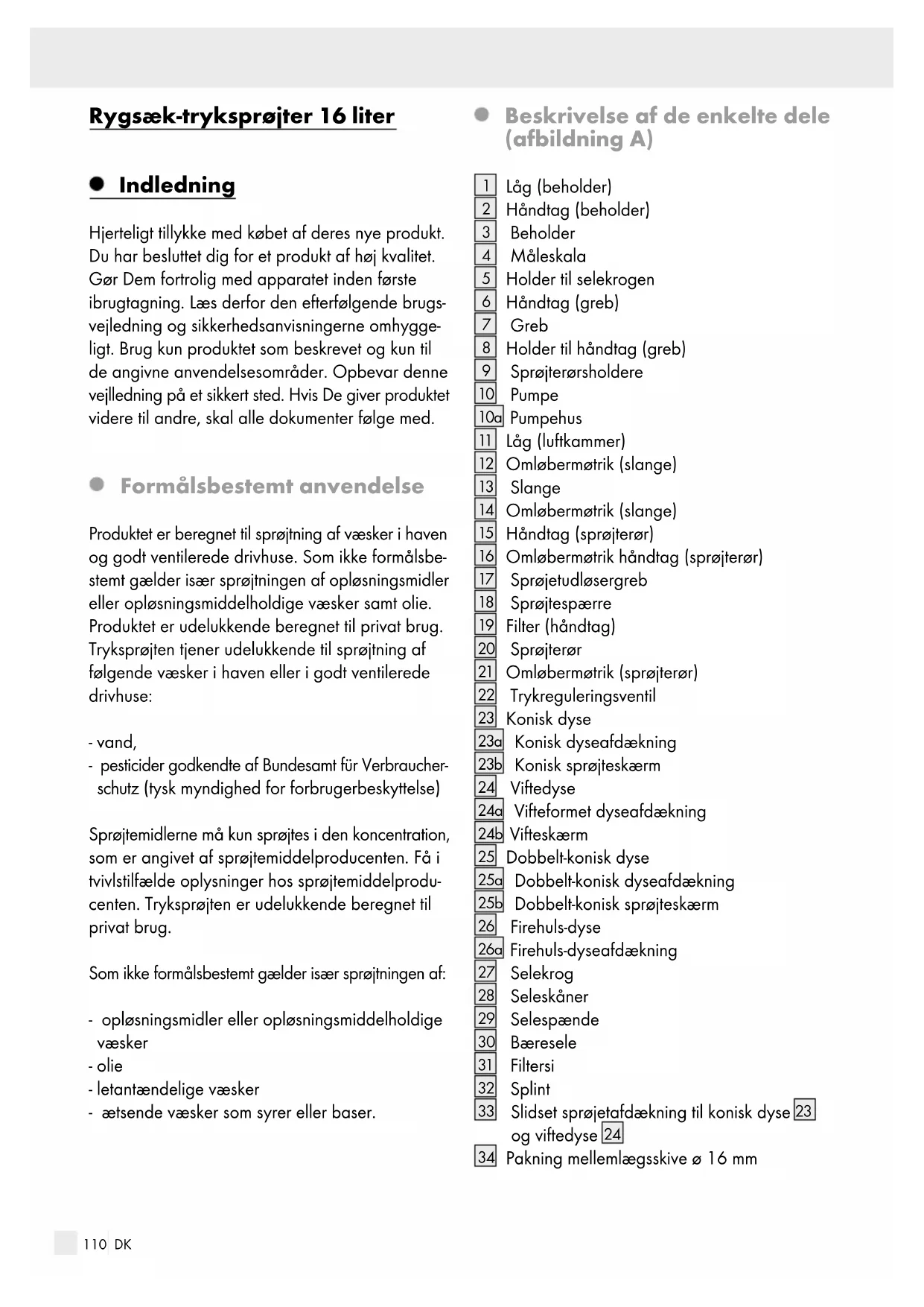 OG VEJLEDNINGER TIL FREMTIDIG BRUG! Børn eller personer, som mangler viden eller erfaring i håndteringen af apparatet eller som er indskrænket på grund af deres kropsmæs- sige, sensoriske eller mentale evner, må ikke bruge apparatet uden opsyn eller vejledning fra en person, der er ansvarlig for deres sik- kerhed. Børn skal være under opsyn, så de ikke leger med apparatet. Forsigtig ved opbevaring af pesticidet. Pesticidet skal opbevares udenfor børns rækkevidde. Ved bortskaffelse af pesticider skal producentens sikkerhedsanvisninger overholdes.112 DK Hold sprøjteudstyret væk fra børn og unge under 16 år. Lad ikke produktet være uden opsyn, når det er i brug. Anvend produktet formålsbestemt! Sikr produktet under transporten for at forhindre en udsivning af væsken. Test produktet inden hver brug for at sikre, at det er fri for skader og tilstop- pelser og sørg for at alle dele fungerer korrekt. Gummidele som slanger eller O-ringe, må ikke have tegn på revner eller være porøse. Vær især opmærksom på den fejlfrie tilstand hos de sikkerhedsrelevante dele. Sørg for at alle tilslutninger sidder fast. Kontroller produktet inden den første brug efter vinteren. FORSIGTIG: Produktet må ikke anvendes mere, når det har tegn på synlige skader eller ikke fungerer fejlfrit mere. Stil produktet altid på en jævn, flad overflade. Mens du fylder tryksprøjten op og indstiller, benytter, transporterer, tømmer, rengør eller vedligligeholder den, skal du be- skytte dig med et egnet, personligt beskyttel- sesudstyr (PBU). Bær en øjenbeskyttelse (beskyttelsesbriller eller ansigtsbeskyttelse)! Bær et åndedrætsværn og egnet beskyttelses- beklædning. Bær vandtætte handsker og gummistøvler. Læs betjeningsvejledningen. Hold dig væk fra omkringstående personer mens du sprøjter. Der må udelukkende anvendes originale reservedele, som stilles til rådighed af producenten og lignende tilbehør. (Gå fremad som beskrevet i kapitlet ”Anvendelse af reservedele”.) Alle øvrige reparationer må udelukkende gennemføres af producenten, dennes kundeservice eller andre kvalificerede personer. En uhensigtsmæssig vedligeholdelse kan føre til en faresituation. Rengør hænder og ansigtet efter sprøjtningen. I tilfælde af en forgiftning gennem hudkontakt med pesticiden, skal du omgående skylle det pågældende sted med vand og opsøge en læge. FORSIGTIG! EKSPLOSIONS- FARE! Udsæt apparatet (tomt eller fyldt) ikke for direkte sol eller frost! Vær altid opmærksom på de kemiske data fra producenten, når du arbejder med produktet eller blander midlerne. Bland og fyld sprøjteapparet kun op i det fri eller godt ventilerede drivhuse. De anvendte væsker må ikke overskride en temperatur på mere end 40 °C og skal an- vendes iht. kemikalieproducentens angivelser. Bland aldrig mere sprøjteopløsning / pesticid, end der er nødvendig til indsatsen. Du må ikke bortskaffe rester i afløbet. Bortskaf dem iht. kemikalieproducentens anvisninger. Overskrid ikke den nominelle volumen! Sørg for at de anvendte sprøjtevæsker er kompatibel med produktet. Sørg for at de anvendte pesticider, flydende gødning eller rengøringsmiddel er tilladte i dit land. Opbevar produktet på grund af ammoniakdampe ikke i staldbygninger (fare for revnedannelse i messingelementer). Fyld det ikke op med kvælstof eller fosfatholdige opløsningsmidler. Opbevar ikke sprøjtepesticider i produktet. Sprøjt aldrig mod vinden, i vand eller drikke- vandskilder. Sprøjt aldrig på mennesker eller dyr. Tag vind, regnvejr og andre klimtiatiske samt miljømæssige betingelser i betragtning, for at undgå faren for en ukontrol- leret eller utilsigtet fordeling af sprøjtematerialet. Undgå at sprøjtematerialet blæser væk. Anvend ikke produktet når det lækker eller sprøjtestrålen er ujævn. Frigiv resttrykket efter hver anvendelse. Sørg inden hver brug for at produktet befinder sig i en god tilstand. Sørg for at skrueforbin- delserne er tætte og lad produktet gennemgå en synsprøve. Ved mistanke for beskadigelser, henholdsvis konstatering af en utæthed, skal brugen indstilles med det samme. Pust de tilstoppede dyser ikke fri med munden.113 DK Tryksprøjten må ikke anvendes, hvis brugeren er træt eller syg eller påvirket af alkohol, narkotika eller medicin. Fremgangsmåde ved personskader: Når du kommer i kontakt med plantebeskyttelsesmidler eller tryksprøjten er blokeret, efter at du alle- rede har opbygget tryk, sæt sprøjteapparatet med det samme fra dig, idet du løsner selekro- gen