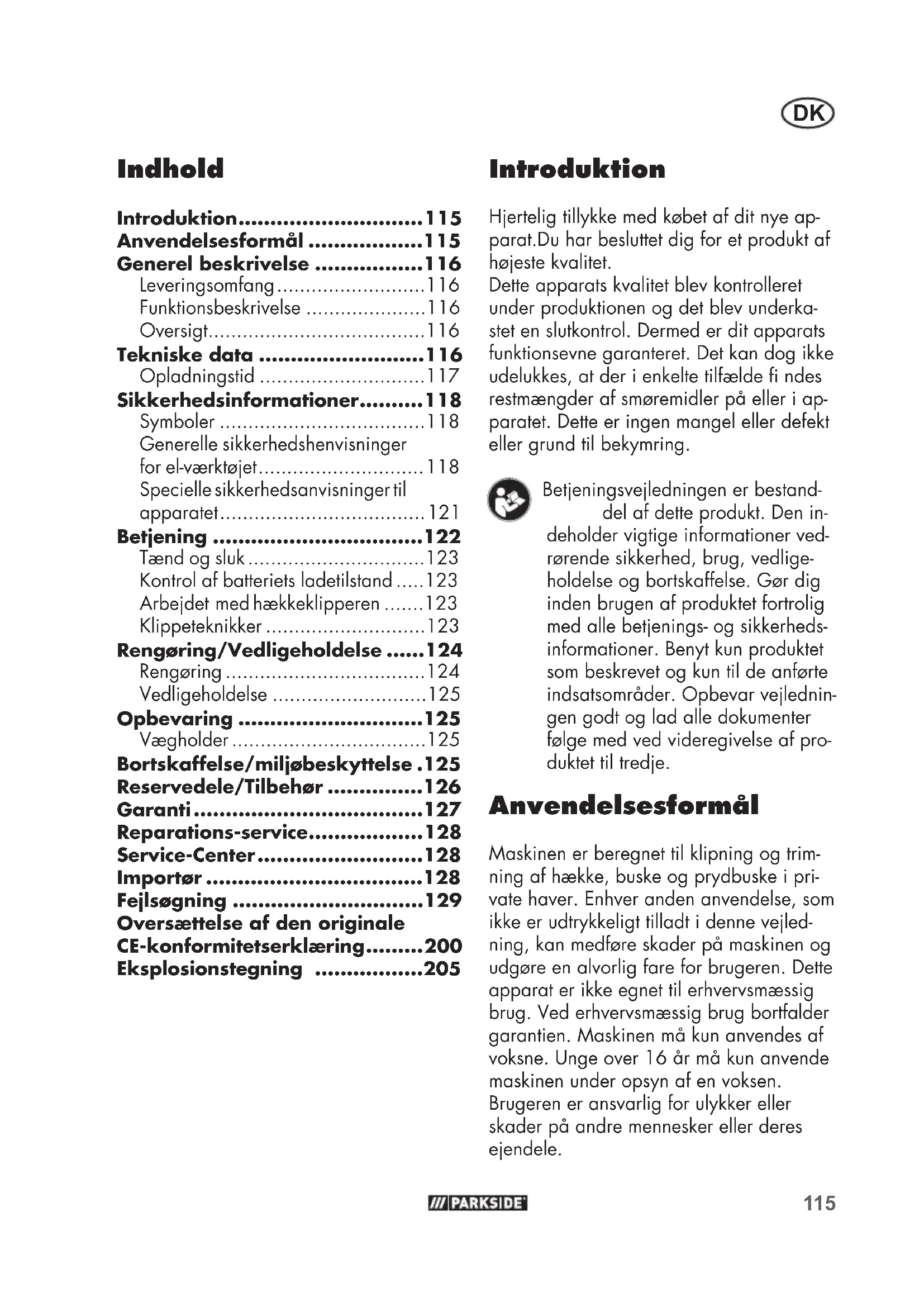 - Introduktion Hjertelig tillykke med købet af dit nye ap- parat.Du har besluttet dig for et produkt af højeste kvalitet. Dette apparats kvalitet blev kontrolleret under produktionen og det blev underka- stet en slutkontrol. Dermed er dit apparats funktionsevne garanteret. Det kan dog ikke udelukkes, at der i enkelte tilfælde ndes restmængder af smøremidler på eller i ap- paratet. Dette er ingen mangel eller defekt eller grund til bekymring. Betjeningsvejledningen er bestand- del af dette produkt. Den in- deholder vigtige informationer ved- rørende sikkerhed, brug, vedlige- holdelse og bortskaffelse. Gør dig inden brugen af produktet fortrolig med alle betjenings- og sikkerheds- informationer. Benyt kun produktet som beskrevet og kun til de anførte indsatsområder. Opbevar vejlednin- gen godt og lad alle dokumenter følge med ved videregivelse af pro- duktet til tredje. Anvendelsesformål Maskinen er beregnet til klipning og trim- ning af hække, buske og prydbuske i pri- vate haver. Enhver anden anvendelse, som ikke er udtrykkeligt tilladt i denne vejled- ning, kan medføre skader på maskinen og udgøre en alvorlig fare for brugeren. Dette apparat er ikke egnet til erhvervsmæssig brug. Ved erhvervsmæssig brug bortfalder garantien. Maskinen må kun anvendes af voksne. Unge over 16 år må kun anvende maskinen under opsyn af en voksen. Brugeren er ansvarlig for ulykker eller skader på andre mennesker eller deres ejendele. Indhold Introduktion p. 115