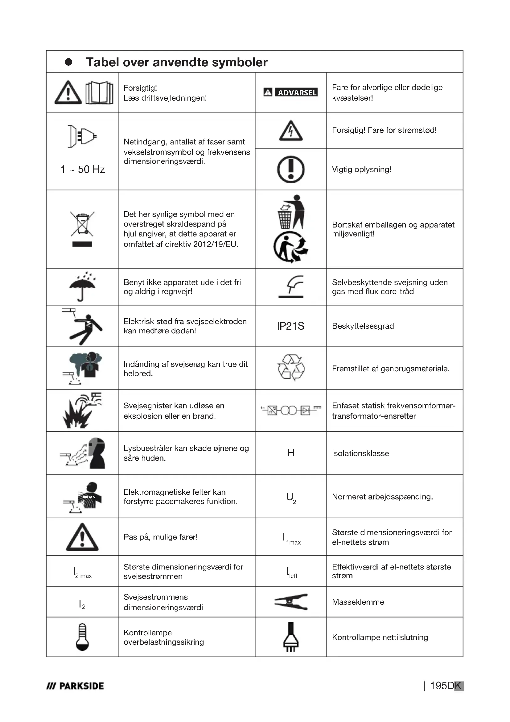 11,3 A Svejsetrådtromle maks.: ca. 1000 g Svejsetråddiameter maks.: 1,0 mm Sikring: 16 A Anbefalet materialetykkelse: 0,8–3,0 mm Tekniske modikationer og ændringer af udseendet kan i forbindelse med videreudviklinger foretages uden varsel. Alle mål, bemærkninger og oplysninger i denne brugsvejledning er derfor ikke garante- rede. Retskrav, som fremsættes på grundlag af brugsvejledningen, kan derfor ikke gøres gældende. z Sikkerhedsregler Læs venligst brugsvejledningen grundigt igennem, og tag hensyn til de beskrevne henvisninger. Lær ved hjælp af denne brugsvejledning apparatet og dets rigtige brug at kende, og læs alle sikkerhedsanvis- ningerne. På typeskiltet står alle tekniske data for dette svejseapparat. Informer dig venligst om dette apparats tekniske forhold. Reparationer og / eller vedligeholdelsesarbejde må kun blive gennemført af kvalicerede el-fagfolk. Brug kun de svejseledninger, der følger med leveringen. Mens apparatet er i drift, må det ikke stå direkte op imod en væg, og det må heller ikke være tildækket eller være indeklemt mellem andre apparater, så der altid kan strømme tilstrækkelig meget luft gennem ventilationsåbningerne. Kontroller også, at apparatet er tilsluttet korrekt til netspændingen. Undgå enhver trækbelastning på strømledningen. Træk strømstikket ud af stik- kontakten, før du stiller apparatet op på et andet sted. Når apparatet ikke er i drift, skal det altid slukkes med TÆND- / SLUK-afbryderen. Læg elektrodeholderen på et isoleret under- lag, og tag først elektroderne ud af holderen, efter at de er kølet af i 15 minutter. Vær opmærksom på svejsekablernes, brænderens og massek- lemmernes tilstand. Slid på isoleringen og på spændingsførende dele kan fremkalde farer og mindske svejsearbejdets kvalitet. 472024_2407_Inverter-Fülldrahtschweißgerät_LB8_content.indb 198472024_2407_Inverter-Fülldrahtschweißgerät_LB8_content.indb 198 18.10.2024 10:06:4718.10.2024 10:06:47199DK Ved lysbuesvejsning dannes der gnister, smeltede metaldele og røg. Tag derfor følgende hensyn: Alle brændbare substanser og/ eller materialer skal fjernes fra arbejdspladsen og dens umiddel- bare omgivelser. Sørg for god ventilation på arbejdspladsen. Der må ikke svejses på beholdere, kar eller rør, som indeholder eller har indeholdt brændbare væsker eller gasser. ADVARSEL! Undgå enhver direkte kontakt med svejsestrøm- kredsen. Tomgangsspændingen mellem elektrodetang og mas- seklemme kan være farlig, der er fare for elektrisk stød. Apparatet må ikke bruges i fugtige eller våde omgivelser eller i regnvejr. Her gælder sikkerhedsbestemmelsen IP21S. Beskyt øjnene med de hertil beregnede beskyttelsesglas (DINgrad 9–10), som du fastgør til den leverede svejseskærm. Benyt handsker og tørt beskyttelsestøj, der er fri for fedt og olie, for at beskytte huden imod lysbuens ultraviolette stråling. ADVARSEL! Brug ikke svejsestrømkilden til optøning af rør. Bemærk: Lysbuens stråling kan skade øjnene og fremkalde forbrændinger på huden. Ved lysbuesvejsning dannes der gnister og dråber af smeltet metal, det svejsede emne begynder at gløde og bliver ved med at være meget varmt i forholdsvis lang tid. Rør derfor ikke ved emnet med bare hænder. Ved lysbuesvejsning frigives der helbredsfarlige dampe. Sørg for helst ikke at indånde disse. Beskyt dig imod lysbuens farlige virkninger, og hold personer, som ikke deltager i arbejdet, på mindst 2 meters afstand fra lysbuen. PAS PÅ! Mens svejseapparatet er i funktion, kan der i afhængighed af el-nettets forhold på tilslutningspunktet forekomme forstyrrelser i strømforsyningen til andre forbrugere. Henvend dig i tvivlstil- fælde til dit elværk. 472024_2407_Inverter-Fülldrahtschweißgerät_LB8_content.indb 199472024_2407_Inverter-Fülldrahtschweißgerät_LB8_content.indb 199 18.10.2024 10:06:4718.10.2024 10:06:47200 DK Mens svejseapparatet er i funktion, kan der forekomme funktionsfejl ved andre apparater, f. eks. høreapparater, pacemakere osv. z Farekilder ved lysbuesvejsning Ved lysbuesvejsning ndes der en række farekilder. For svejseren er det derfor særdeles vigtigt at overholde de følgende regler for ikke at bringe sig selv og andre i fare og for at undgå personskader og skader på udstyret. Alt arbejde i forbindelse med el-nettet, f. eks. kabler, stik, stik- kontakter osv. må kun udføres af en kvaliceret elektriker og i henhold til nationale og lokale forskrifter. I tilfælde af uheld skal svejseapparatets forbindelse til el-nettet afbrydes med det samme. Når der forekommer elektriske berøringsspændinger, skal appa- ratet straks slukkes, og efterfølgende skal det efterses af en kva- liceret elektriker. Sørg altid for gode elektriske forbindelser på svejsestrømsiden. Ved svejsning skal der altid bæres isolerende handsker på begge hænder. De beskytter imod elektriske stød (svejsestrømkred- sens tomgangsspænding), imod skadelige strålinger (varme og uv-stråling) og imod glødende metal og slaggesprøjt. Bær fast og isolerende fodtøj. Skoene skal også være isolerende, når det er vådt. Almindelige sko er uegnede, fordi glødende metaldråber, som falder ned, kan give forbrændinger. Bær egnet beskyttelsestøj og ikke nogen syntetiske beklæd- ningsgenstande. Se ikke ind i lysbuen med ubeskyttede øjne, brug kun en svej- ser-svejseskærm med forskriftsmæssigt beskyttelsesglas i hen- hold til DIN. Ud over lys- og varmestråler, der bevirker blænding hhv. forbrænding, afgiver lysbuen også uv-stråling. Ved util- strækkelig beskyttelse medfører denne usynlige ultraviolette stråling først nogle timer senere en meget smertefuld bindehin- debetændelse. Desuden fremkalder uv-stråling på ubeskyttede legemsdele forbrændinger ligesom en solskoldning. 472024_2407_Inverter-Fülldrahtschweißgerät_LB8_content.indb 200472024_2407_Inverter-Fülldrahtschweißgerät_LB8_content.indb 200 18.10.2024 10:06:4718.10.2024 10:06:47201DK Også per