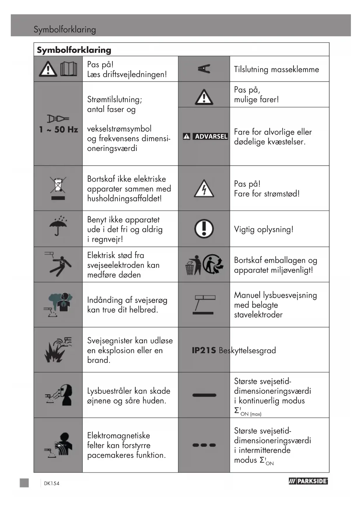 vejledning apparatet og dets rigtige brug at kende og læs alle sikkerhedshenvisningerne. På typeskiltet står alle tekniske data for dette svejseapparat. Informer dig venligst om dette apparats tekniske forhold.DK 157 Sikkerhedsregler BEMÆRK! fDet i den efterfølgende tekst benytte- de begreb „produkt“ eller „apparat“ refererer til det i denne brugsvejledning nævnte elektrisk svejseapparat PESG 120 B4. Dette apparat kan benyttes af børn fra 16-års alderen og opefter samt af personer med forringede fysiske, sensoriske eller mentale evner eller med mangel på erfaring og viden, når de er under opsyn eller mht. sikker brug af apparatet er blevet vejledt og har forstået de deraf resulterende farer. Børn må ikke lege med apparatet. Rengøring og vedligeholdelse fra brugerens side må ikke gennemføres af børn uden at være under opsyn. Reparationer og / eller vedligeholdelsesarbejde må kun blive gennemført af kvalificerede el-fagfolk. Benyt udelukkende de svej- seledninger (PESG 120 B4 H01N2-D1 x 10mm²), som følger med leveringen. Mens apparatet er i drift, må det ikke stå direkte op imod en væg, og det må heller ikke være tildækket eller være indeklemt mellem andre appa