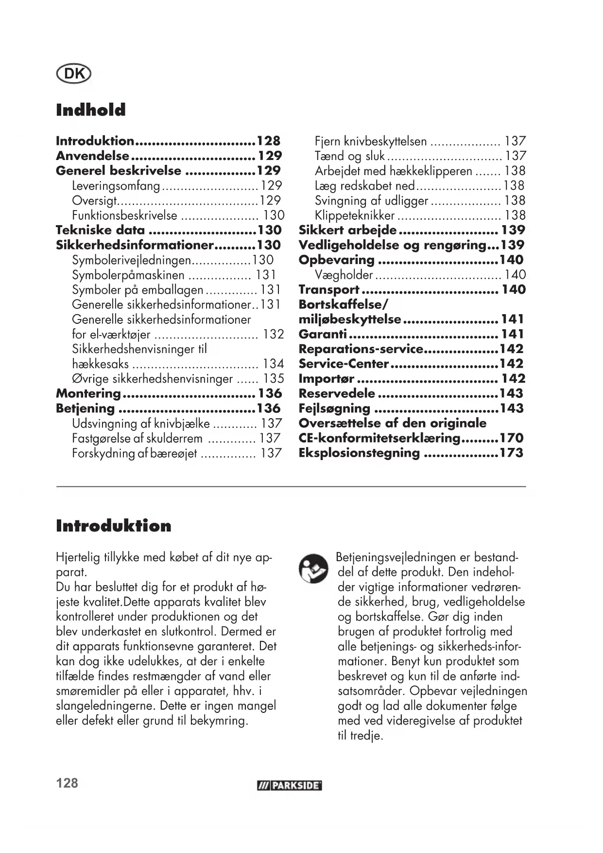 - Sikkerhedshenvisninger til hækkesaks p. 134
