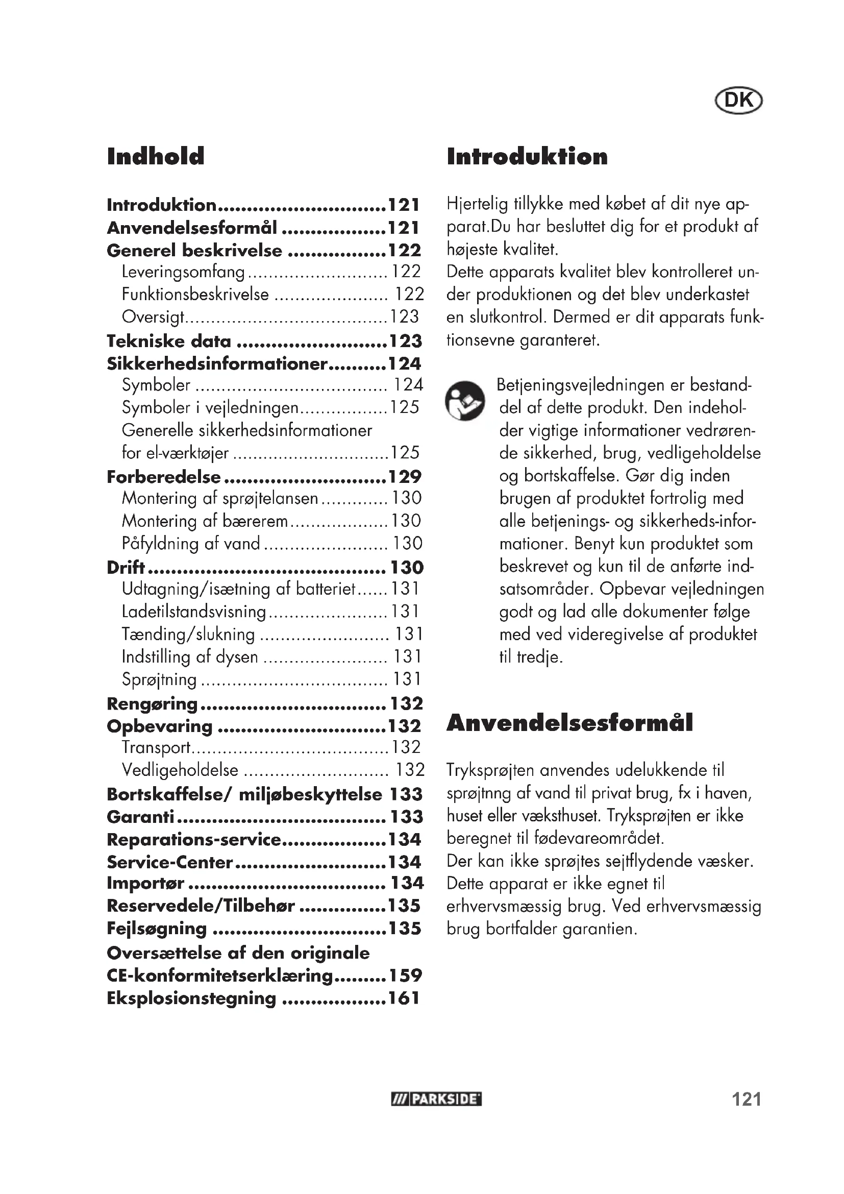 - Introduktion Hjertelig tillykke med købet af dit nye ap- parat.Du har besluttet dig for et produkt af højeste kvalitet. Dette apparats kvalitet blev kontrolleret un- der produktionen og det blev underkastet en slutkontrol. Dermed er dit apparats funk- tionsevne garanteret. Betjeningsvejledningen er bestand- del af dette produkt. Den indehol- der vigtige informationer vedrøren- de sikkerhed, brug, vedligeholdelse og bortskaffelse. Gør dig inden brugen af produktet fortrolig med alle betjenings- og sikkerheds-infor- mationer. Benyt kun produktet som beskrevet og kun til de anførte ind- satsområder. Opbevar vejledningen godt og lad alle dokumenter følge med ved videregivelse af produktet til tredje. Anvendelsesformål Tryksprøjten anvendes udelukkende til sprøjtnng af vand til privat brug, fx i haven, huset eller væksthuset. Tryksprøjten er ikke beregnet til fødevareområdet. Der kan ikke sprøjtes sejtydende væsker. Dette apparat er ikke egnet til erhvervsmæssig brug. Ved erhvervsmæssig brug bortfalder garantien. Oversættelse af den originale CE-konformitetserklæring p. 159