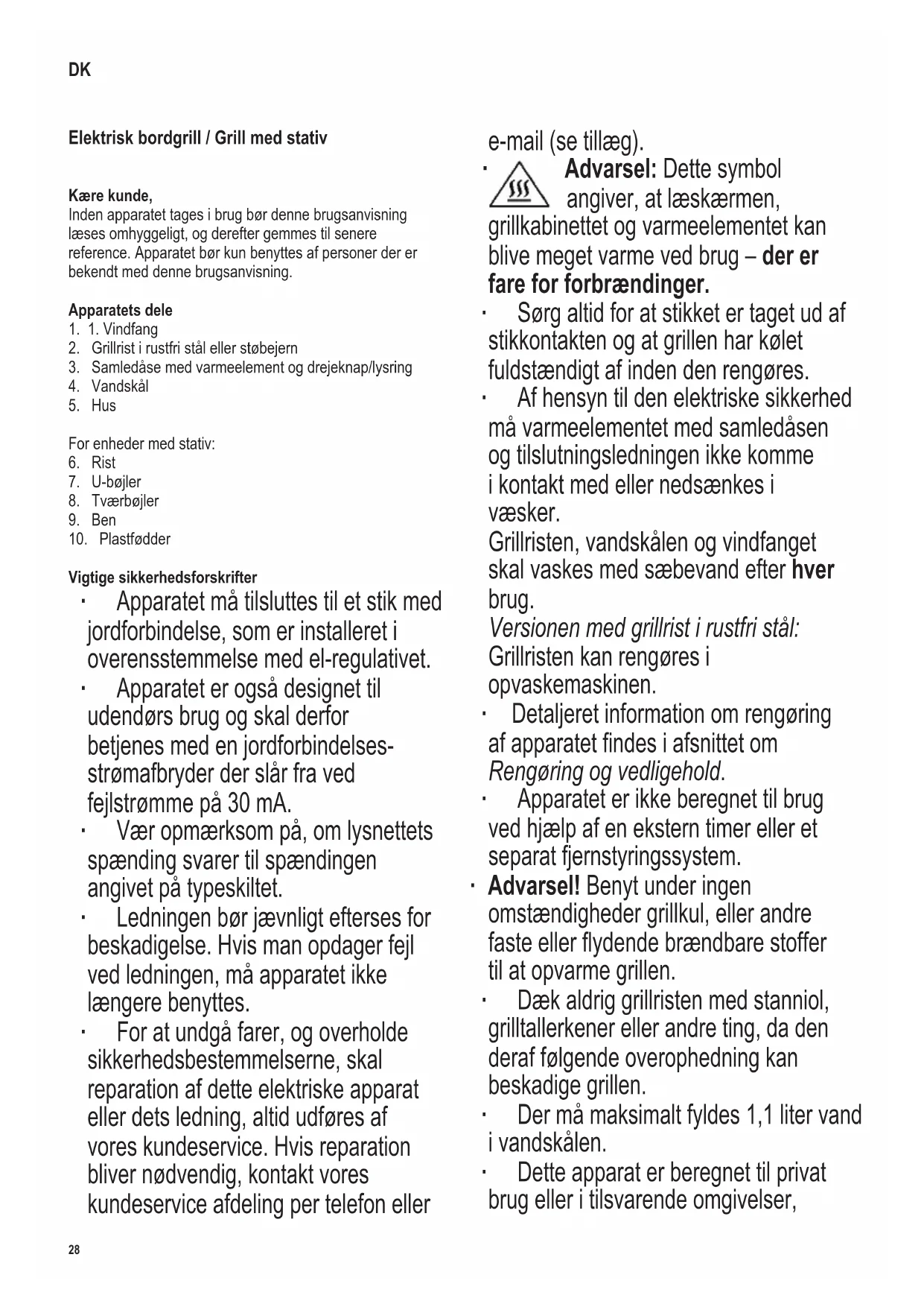 Advarsel: Dette symbol angiver, at læskærmen, grillkabinettet og varmeelementet kan blive meget varme ved brug – der er fare for forbrændinger. ∙ Sørg altid for at stikket er taget ud af stikkontakten og at grillen har kølet fuldstændigt af inden den rengøres. ∙ Af hensyn til den elektriske sikkerhed må varmeelementet med samledåsen og tilslutningsledningen ikke komme i kontakt med eller nedsænkes i væsker. Grillristen, vandskålen og vindfanget skal vaskes med sæbevand efter hver brug. Versionen med grillrist i rustfri stål: Grillristen kan rengøres i opvaskemaskinen. ∙ Detaljeret information om rengøring af apparatet ndes i afsnittet om Rengøring og vedligehold. ∙ Apparatet er ikke beregnet til brug ved hjælp af en ekstern timer eller et separat fjernstyringssystem. ∙ Advarsel! Benyt under ingen omstændigheder grillkul, eller andre faste eller ydende brændbare stoffer til at opvarme grillen. ∙ Dæk aldrig grillristen med stanniol, grilltallerkener eller andre ting, da den deraf følgende overophedning kan beskadige grillen. ∙ Der må maksimalt fyldes 1,1 liter vand i vandskålen. ∙ Dette apparat er beregnet til privat brug eller i tilsvarende omgivelser, DK29 142 x 208 mm såsom - i tekøkkener, kontorer eller andre mindre virksomheder, - landbrugsvirksomheder, - af kunder på hoteller, moteller m.m. og tilsvarende foretagender, - B&B pensionater. ∙ Dette apparat kan benyttes af børn (som er mindst 8 år) og af personer med reducerede fysiske, sensoriske eller mentale evner, eller mangel på erfaring eller viden, såfremt de har fået vejledning og instruktion i brugen af dette apparat og fuldt ud forstår alle farer og forholdsregler vedrørende sikkerheden som brug af apparatet medfører. ∙ Børn må aldrig få lov til at lege med apparatet. ∙ Børn må aldrig få lov til at udføre rengørings- eller vedligeholdelsesarbejde på dette apparat, medmindre de er under opsyn og mindst 8 år gamle. ∙ Apparatet og dets ledning må altid holdes væk fra børn som er yngre en 8 år. ∙ Advarsel: Hold børn væk fra emballeringen, da denne udgør en mulig risiko for tilskadekomst, ved f.eks. kvælning. ∙ Inden apparatet benyttes må både apparatet og dets tilbehør ses grundigt efter for fejl. Hvis apparatet for eksempel har været tabt på en hård overade må det ikke længere anvendes: Selv skader der ikke er synlige kan have ugunstig indvirkning på sikkerheden ved brug af apparatet. ∙ Under brug må grillen placeres på et varmefast underlag, der tåler stænk og sprøjt. Hvis der tilberedes mad med et højt fedt- eller fugtindhold, kan stænk ikke undgås. ∙ Placer ikke grillen tæt på en væg eller i et hjørne, og sørg for at der aldrig er brændbare materialer i nærheden af den. ∙ Vindfanget må ikke monteres, når du bruger grillen indendørs. ∙ Fedtholdig grillmad kan antænde. Hæld derfor vand i vandskålen før hver brug! Først derefter kan du tilslutte strøm. Dette afkøler vandskålen, reducerer røgudvikling og letter rengøringen. ∙ Sørg altid for at holde vandstanden. Der skal tilsættes mere vand i god tid, og man skal sørge for at det ikke kommer i forbindelse med varmeelementet. Advarsel: Afbryd grillen fra strømforsyningen inden der tilføres mere vand. ∙ Før ibrugtagning skal du kontrollere, at varmeelementet er korrekt indsat i huset og i vandskålen. ∙ Grillen må aldrig efterlades uden opsyn når den er tændt. ∙ Varmeelementet og grillristen bliver meget varme under brug. Rør ikke ved varmeelementet, heller ikke efter at det er slukket. Det kan stadig være meget varmt. Der er risiko for forbrændinger! ∙ Lad ikke ledningen komme i berøring med nogle af apparatets varme dele. ∙ Før ledningen på en sådan måde, at ingen kan falde over det. ∙ Tag altid stikket ud af stikkontakten - inden reektorbakken fyldes med vand, - efter brug, - i tilfælde af fejlfunktion, - inden apparatet rengøres. ∙ Brug af forlængerledning eller tromle giver krafttab, eventuelt også en deraf følgende varmeopbygning i ledningen. Det er derfor vigtigt at rulle ledningen helt ud før brug. Sørg også for kun at benytte en forlængerledning der er godkendt for udendørs brug og for den angivne strøm (se klassikationsetiket). ∙ For enheder med stativ: Grillristen må højst belastes med 4 kg. ∙ Grillen må aldrig yttes, mens den er i brug. ∙ Pas på! Lad altid grillen køle helt af, inden den yttes, rengøres, tildækkes eller opbevares. ∙ Pas på! Når grillen ikke anvendes, skal varmeelementet med tilslutningsdåse fjernes fra grillen og opbevares indendørs i tørre omgivelser. ∙ De andre dele til grillen må ikke opbevares udendørs eller på åbne steder, hvor de kan tage skade på grund af vejrpåvirkninger. ∙ Vi påtager os intet ansvar for skader, som skyldes misbrug eller manglende overholdelse af denne brugsanvisning. ∙ Dette produkt overholder direktiverne som gælder for CE-mærkning. Før brug ∙ Fjern al emballage og klistermærker fra grillen. ∙ Fjern ligeledes de re silikoneslanger på varmeelementets tværbøjler. ∙ Rengør grillristen, vandskålen og vindfanget i varmt opvaskevand, og tør dem omhyggeligt. ∙ Montér apparatet som beskrevet i Klargøring af enheden.30 142 x 208 mm ∙ Lad grillen varme op i cirka 10 minutter ved maksimal styrke uden mad (se Grillning). Dette vil fjerne den lugt der typisk opstår, når en grill tændes første gang. Den kan ose en smule; af den grund bør man sørge for tilstrækkelig udluftning ved at åbne vinduer eller yderdøre; en emhætte er også velegnet. Grillen samles således ∙ Saml grillen som vist i diagrammerne: ∙ Anbring vandskålen i huset. ∙ Anbring varmeelementet med samledåsen i vandskålen. Enheden er udstyret med en sikkerhedsafbryder. Hvis samledåsen ikke er monteret korrekt, kan enheden ikke startes. ∙ Sæt grillristen på. ∙ Sæt låsene i vindfanget, først fra siden og derefter bagpå i åbninge