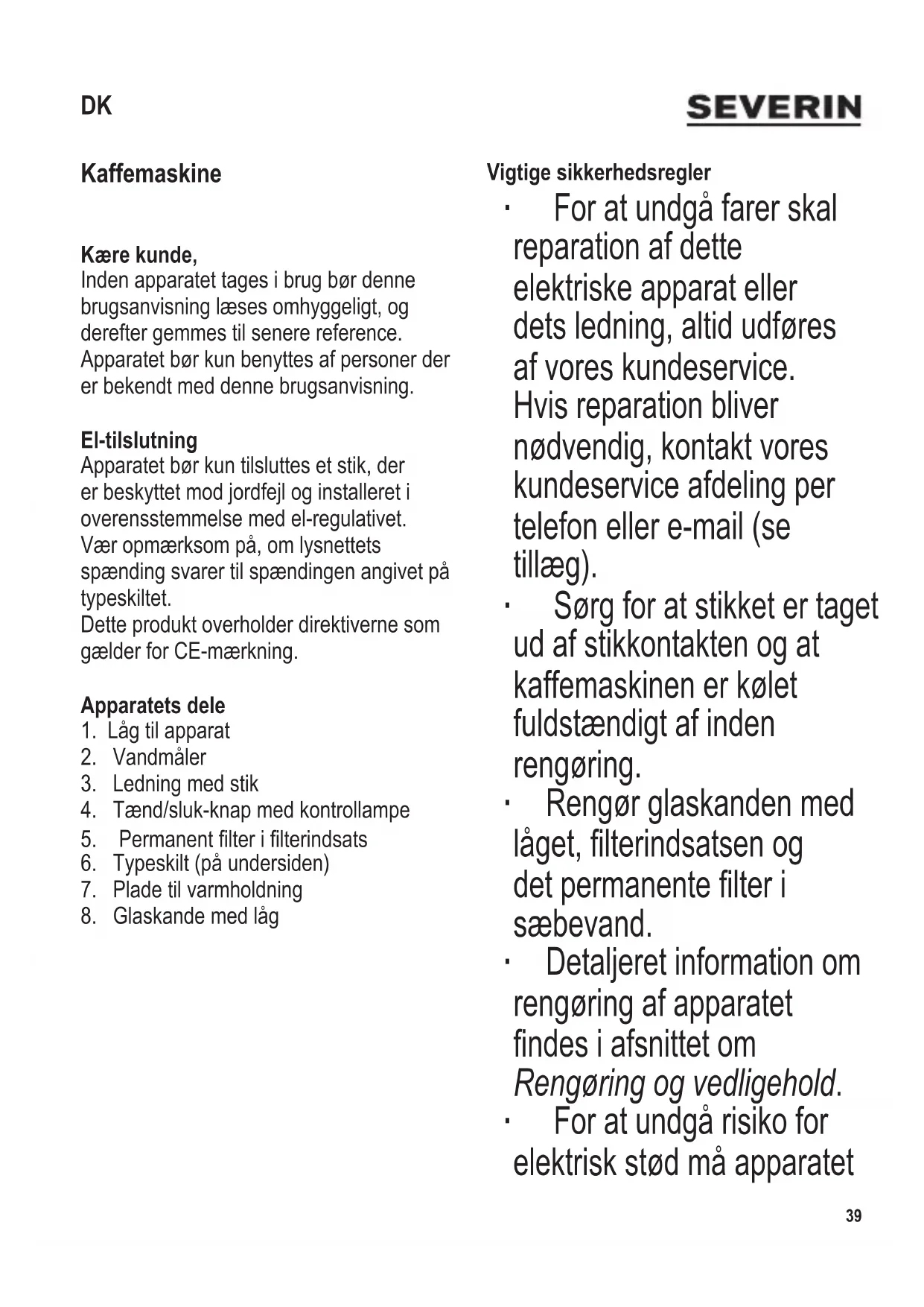 Kaffemaskine Kære kunde, Inden apparatet tages i brug bør denne brugsanvisning læses omhyggeligt, og derefter gemmes til senere reference. Apparatet bør kun benyttes af personer der er bekendt med denne brugsanvisning. El-tilslutning Apparatet bør kun tilsluttes et stik, der er beskyttet mod jordfejl og installeret i overensstemmelse med el-regulativet. Vær opmærksom på, om lysnettets spænding svarer til spændingen angivet på typeskiltet. Dette produkt overholder direktiverne som gælder for CE-mærkning. Apparatets dele