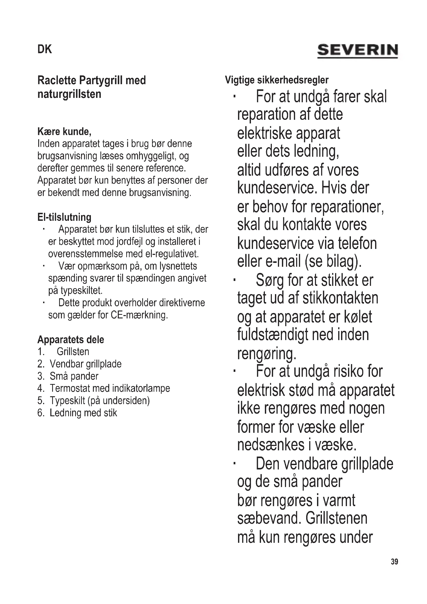 Raclette Partygrill med naturgrillsten Kære kunde, Inden apparatet tages i brug bør denne brugsanvisning læses omhyggeligt, og derefter gemmes til senere reference. Apparatet bør kun benyttes af personer der er bekendt med denne brugsanvisning. El-tilslutning ∙ Apparatet bør kun tilsluttes et stik, der er beskyttet mod jordfejl og installeret i overensstemmelse med el-regulativet. ∙ Vær opmærksom på, om lysnettets spænding svarer til spændingen angivet på typeskiltet. ∙ Dette produkt overholder direktiverne som gælder for CE-mærkning. Apparatets dele